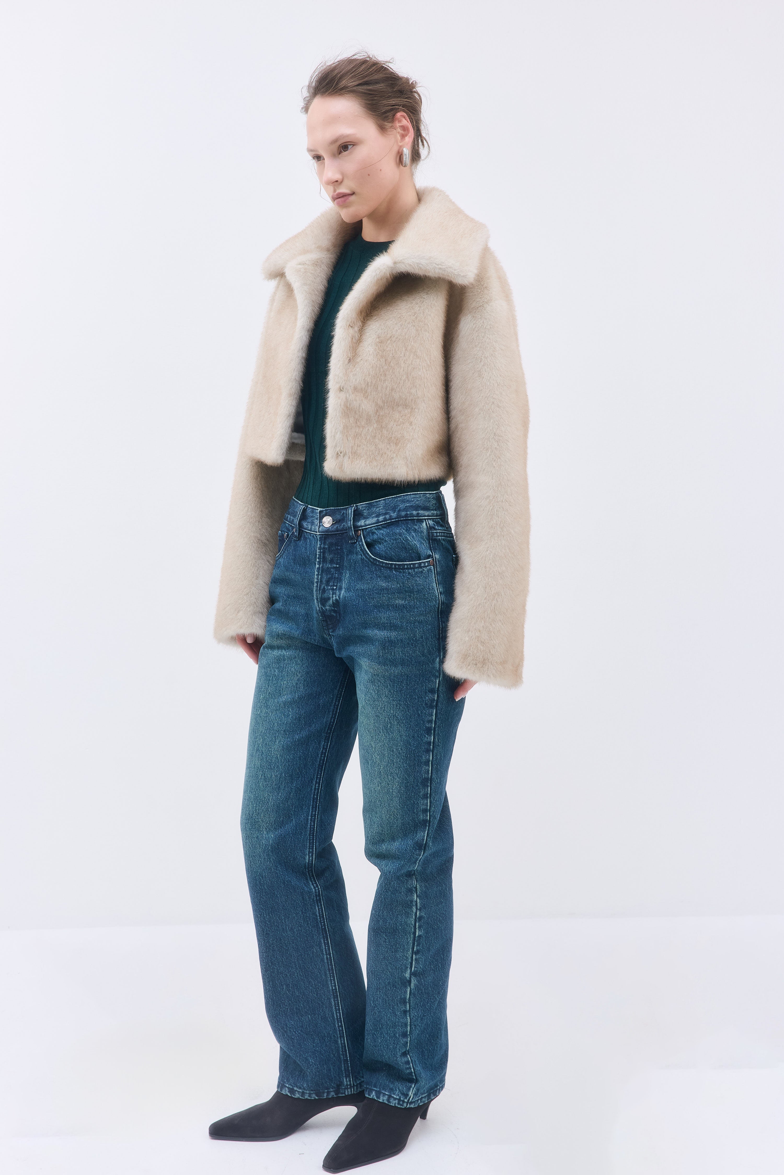 Released as part of our limited edition winter collection; A luxurious statement coat, made to defy seasonality. Luscious faux fur jacket in a cropped silhouette. Fully lined for ultimate comfort. Detailed with a discreet hook closure. Style it with our iconic No.17 Mid Rise Bootcut Denim and our timeless Merino Wool Crewneck for an elevated winter's day look.