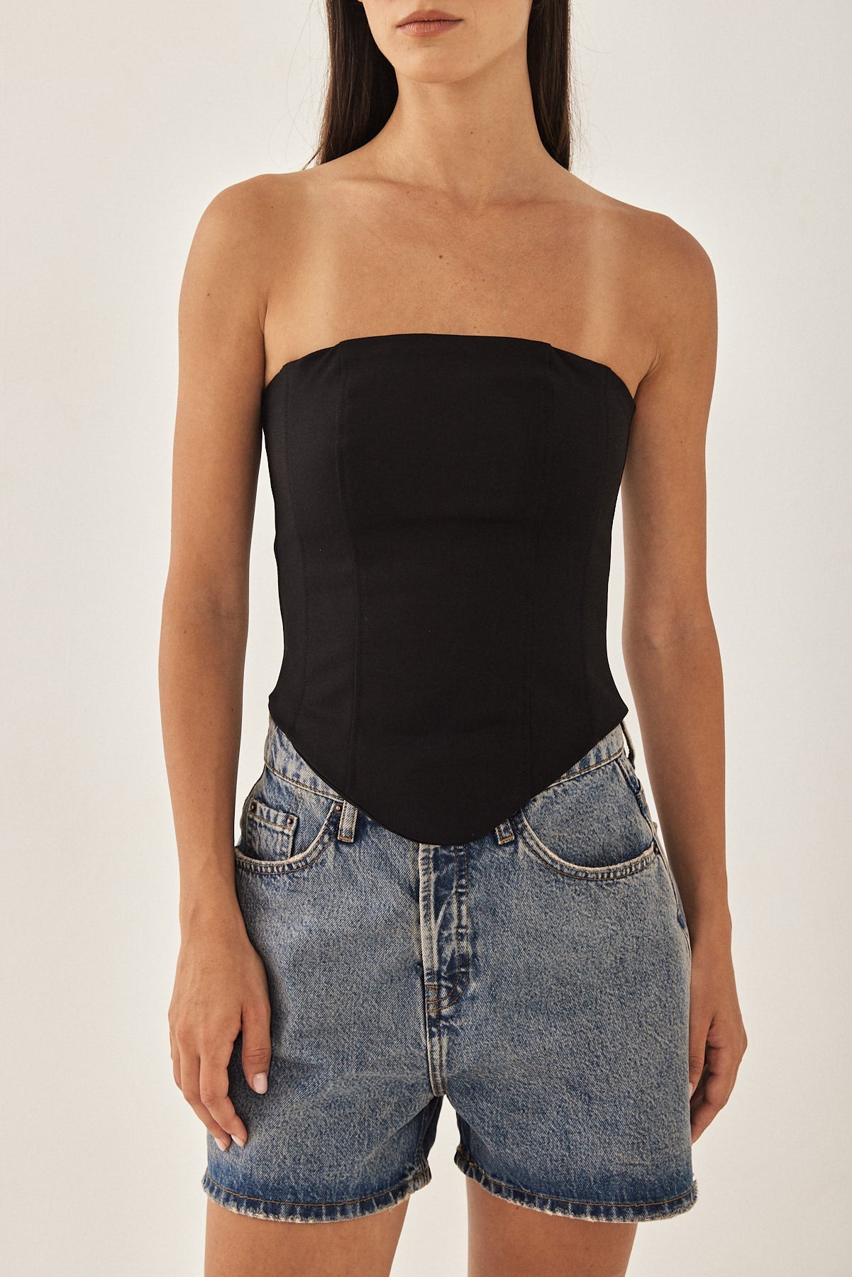 The perfect addition to your wardrobe. Strapless top that hugs the body. Back zip closure. Double lined. Princess cut, delicate line detailing all over. Style it with our denim micro mini skirt, a pair of kitten heels and some sunnies for the ultimate breezy summer look.