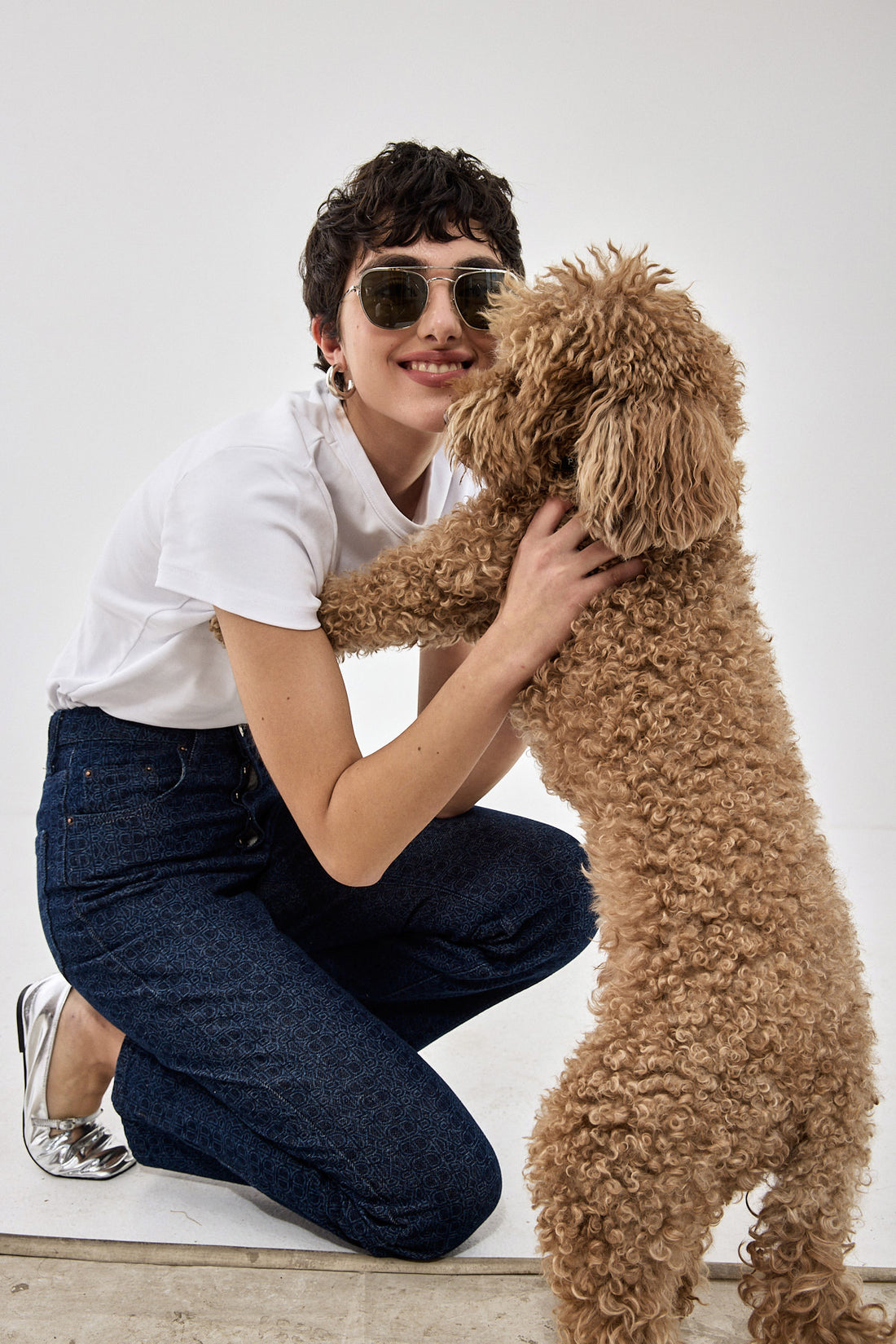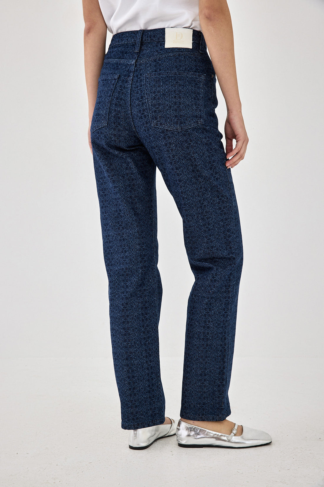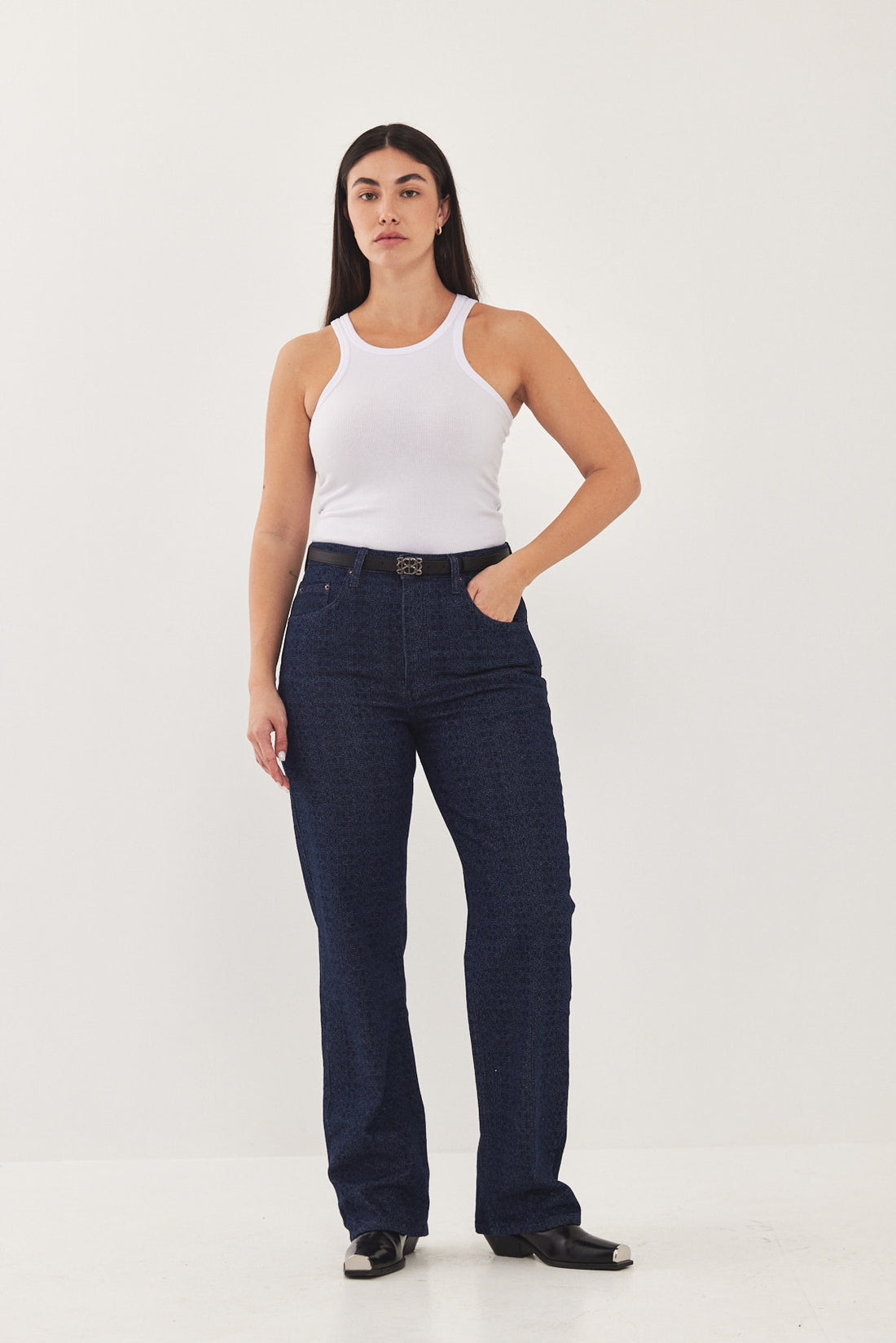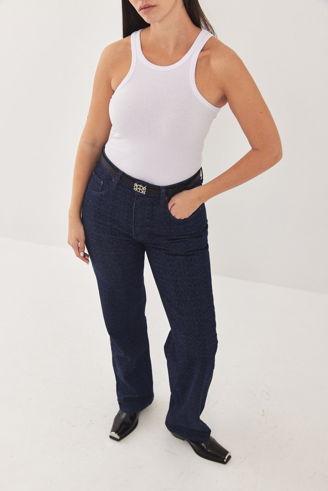 No.6 high waisted jeans features a straight full length fit. Features a monogram logo laser print. Front buttoned closure and back embroidered logo detail at pocket. Made from 100% thick cotton. Complete the set with a matching Monogram denim jacket.