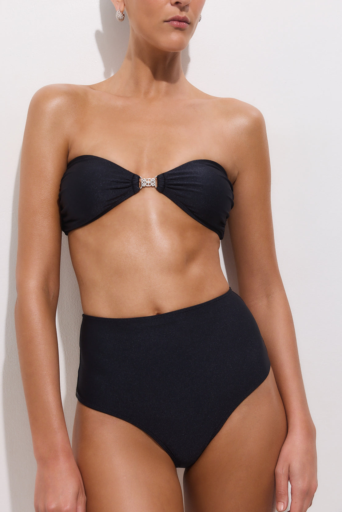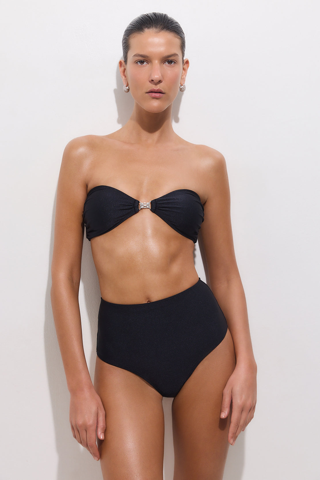 Re-introducing our best-selling swim icons from over the years in a new dreamy shade. The top that turns heads and keeps all eyes on you. Made from luxurious shiny Italian fabric that flatters your curves and hugs your body for a sleek, sculpting fit. Strapless bikini top, perfect for tanning. Featuring a centered silver logo buckle detail. Lined. Side bones for extra support. Gathering detailing along the side seams. Gathering detailing at the center. Internal silicone band along the top part of the bikini top for extra grip and support. Clasp closure at the back with a delicate logo engraving detailing. Preparation for cup inserts (no cups provided). Style it with our beautiful Lotus Bottoms and effortless Striped Crochet Polo and Striped Crochet Pants for a relaxed, yet sophisticated outfit.