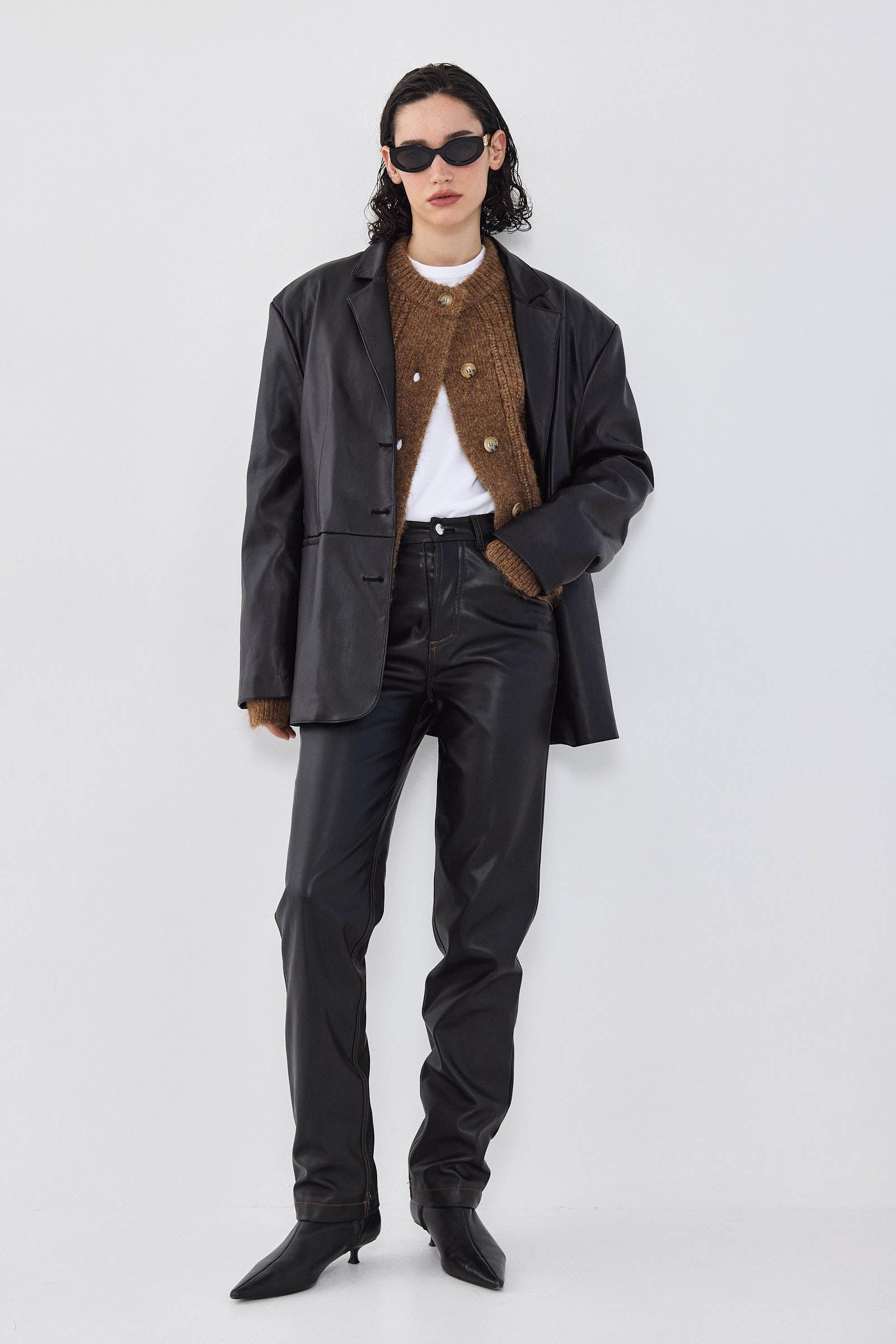 Get warm and cozy with our new fuzzy cardigan. Slightly cropped fit. Soft and hugging fabric. Ribbed crew neckline. Ribbed cuffs and hems. Tortoise logo engraved button closure. Cable knitting. Style it with our daddy wide leg pants, lettuce hem socks and our beautiful vegan leather bomber for a chic day to night look.