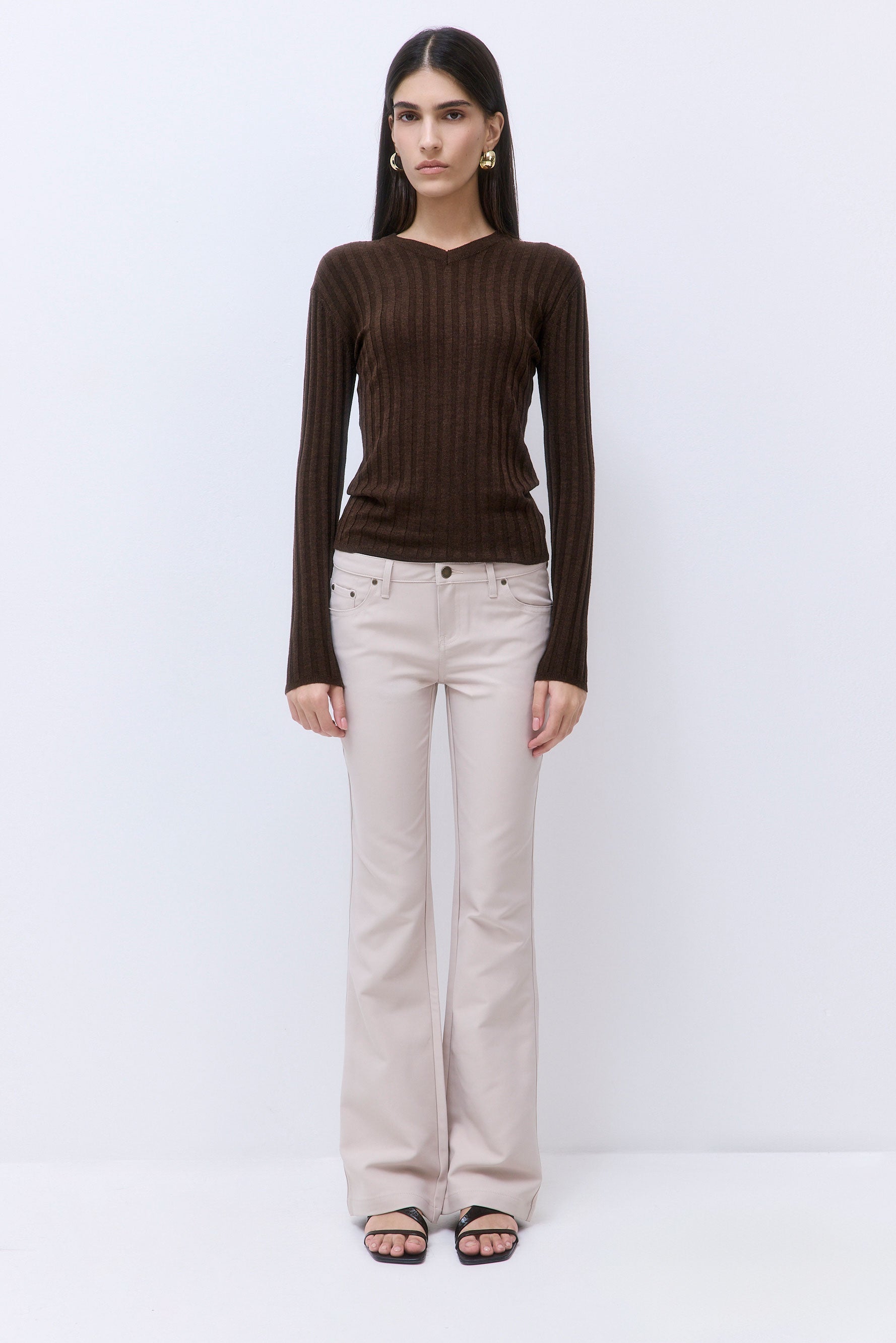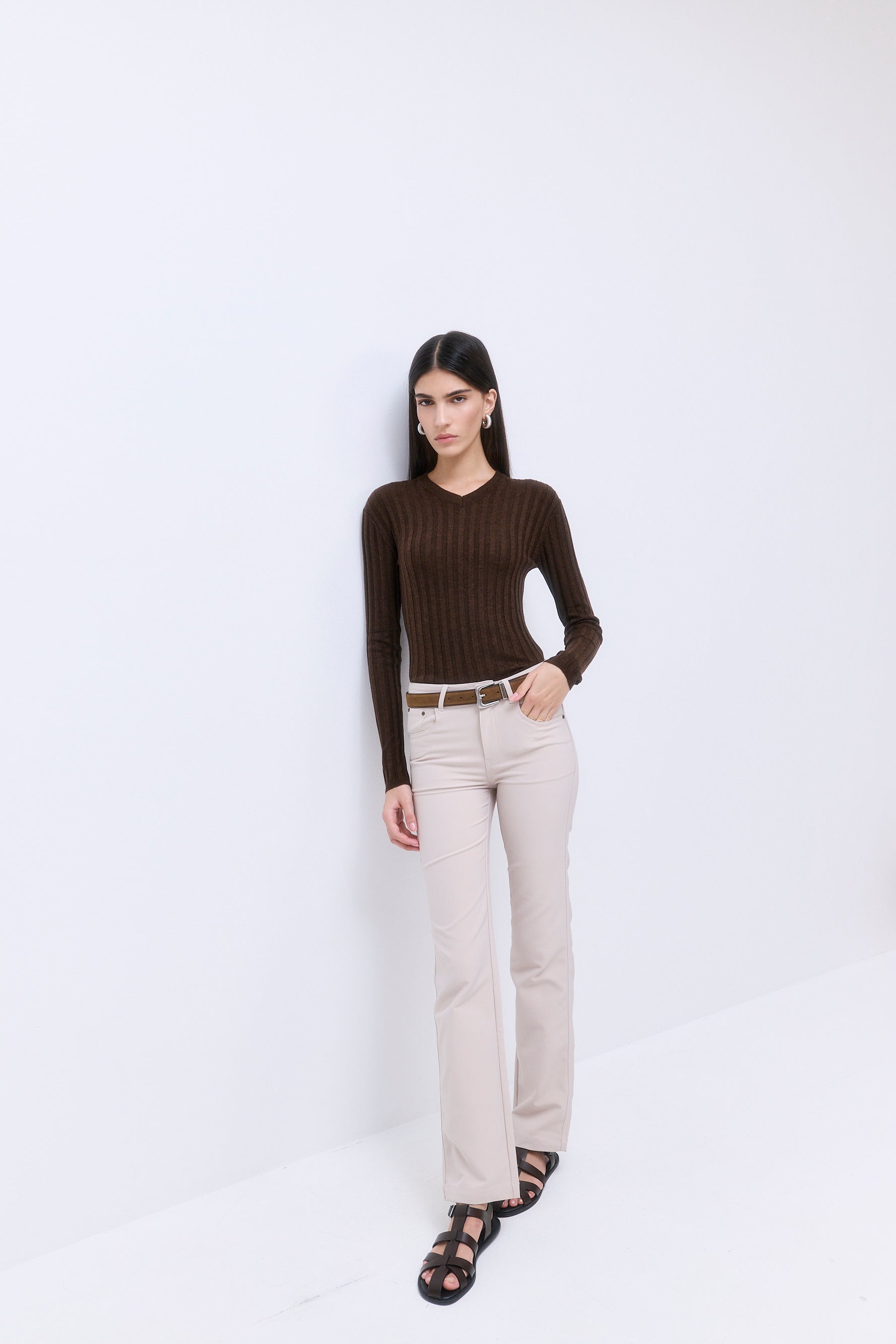 Your new day-to-night staple. Fitted bootcut pants. Midwaist. Front side pockets, featuring a coin pocket. Silver rivets. Back pockets. Detailed with tonal leather patch detail. Back yoke. Embroidered tonal logo. Zipper closure. Pair it with our new Soft Ribbed Crew Neck and accessorise with our refined Rodika Tote Bag for the ultimate elevated look.