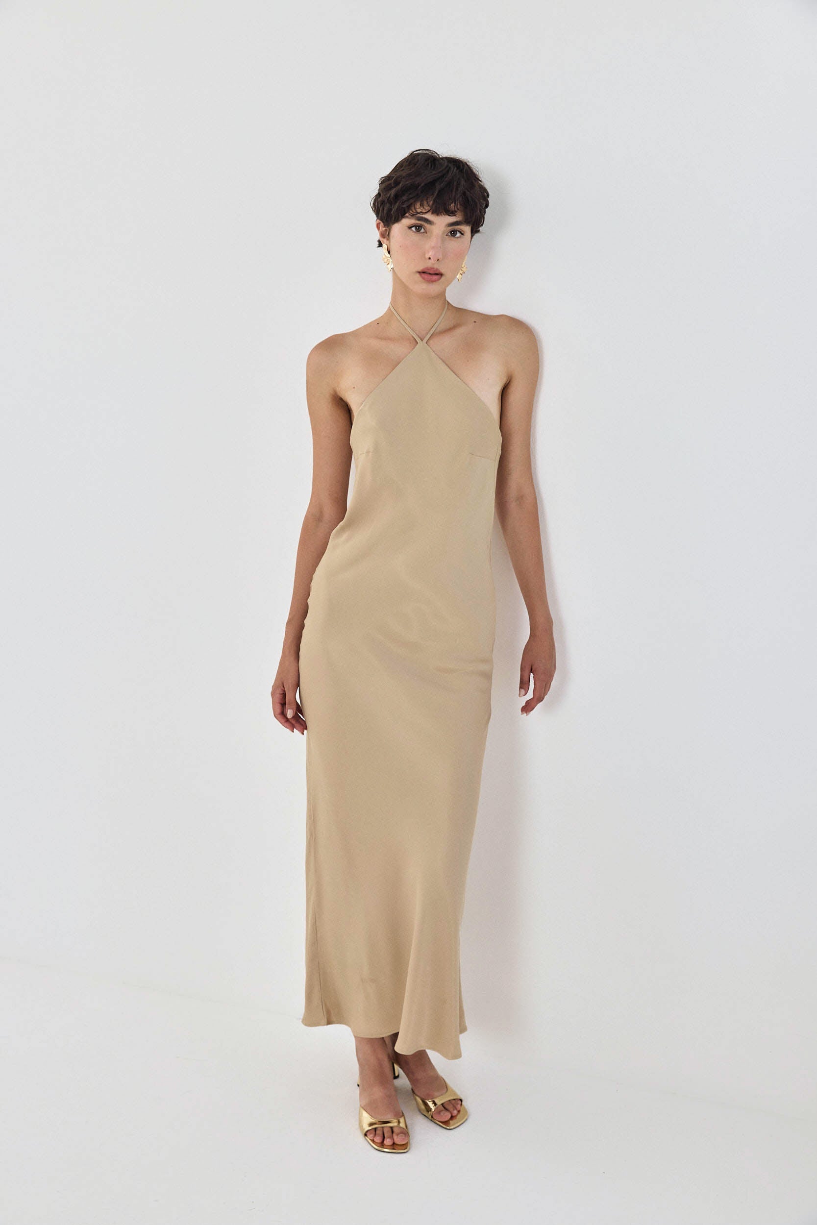 Your new favorite satin dress. Features a crossover neckline and a delicate open back.Maxi length. Cut in a special bias cut technique so that the materials falls smoothly and moves with your body. Style it with your favorite accessories and a pair of sandals for a stylish going out look.
