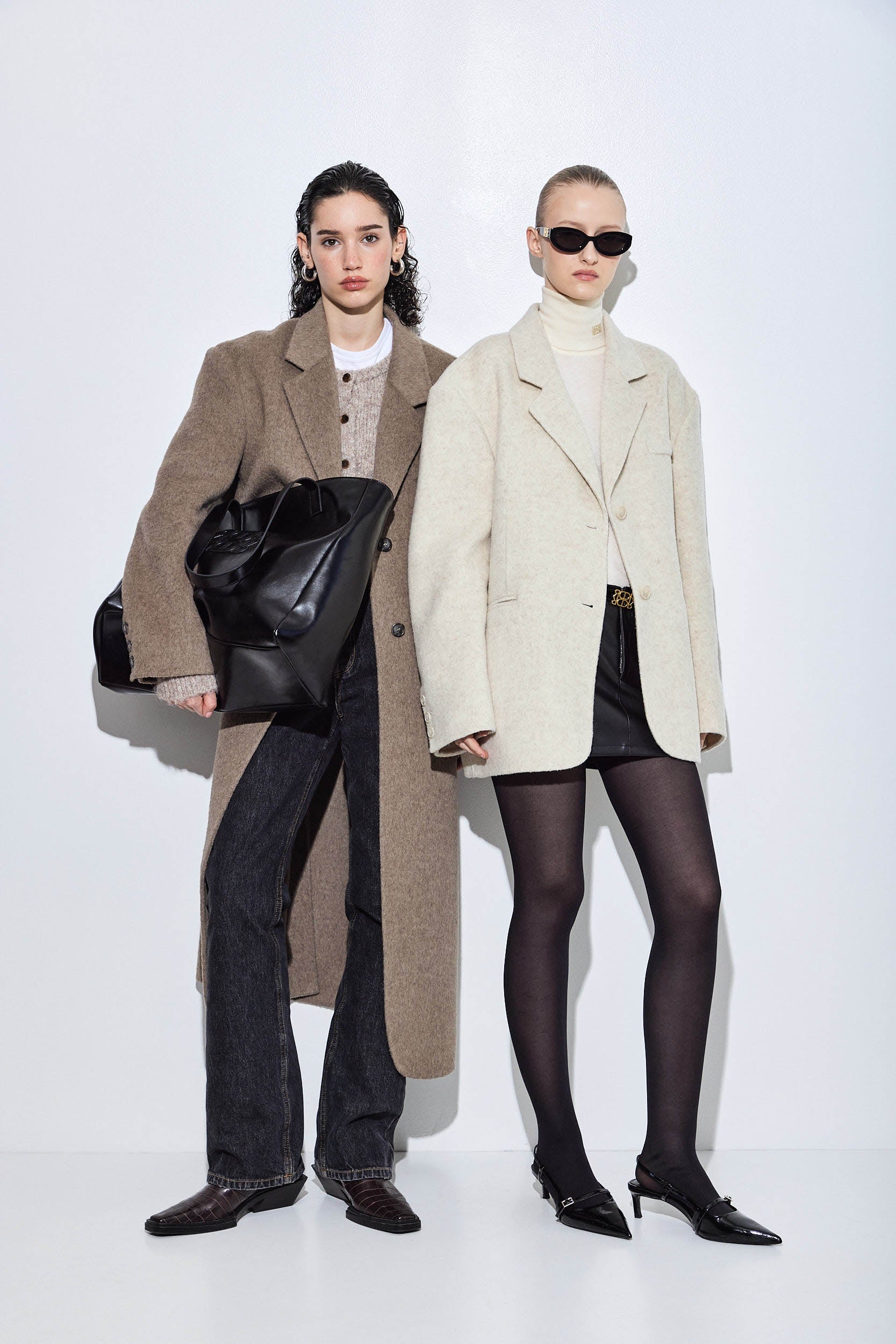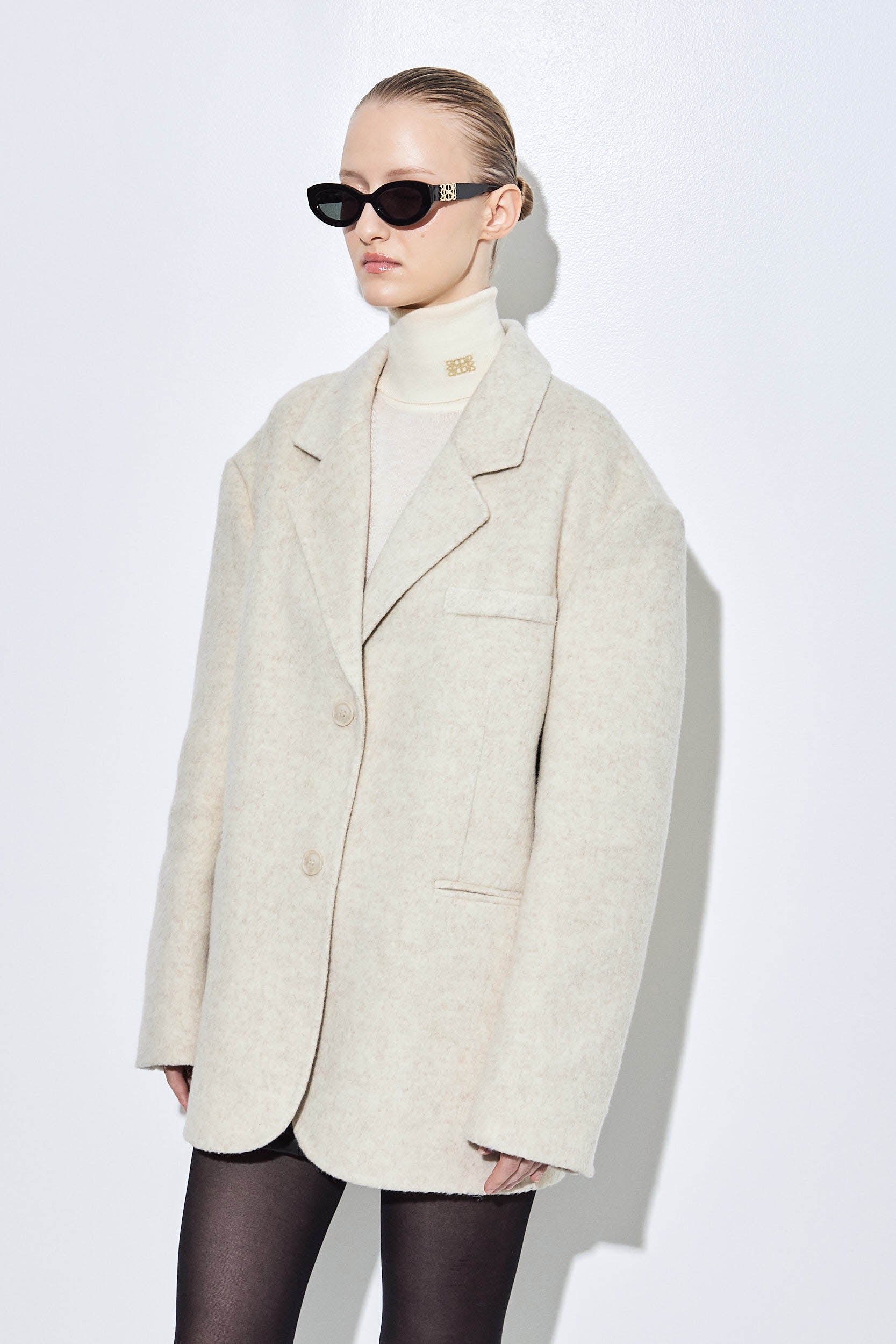Our new double wool oversized blazer is this season must have. Tailored relaxed fit for a sharp silhouette. Logo engraved front buttoned closure. Two sides faux pockets. Soft and luxurious wool fabric. Elegant stitching details. Logo engraved cuffs. Back slit. Upper side faux pocket. Style it with our micro mini denim skirt, our long sleeved ribbed knit and our light knitted scarf for a classy day to night look.