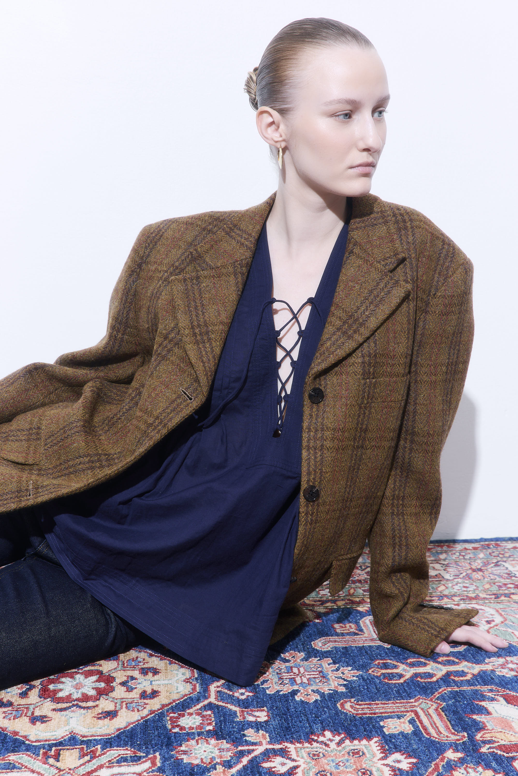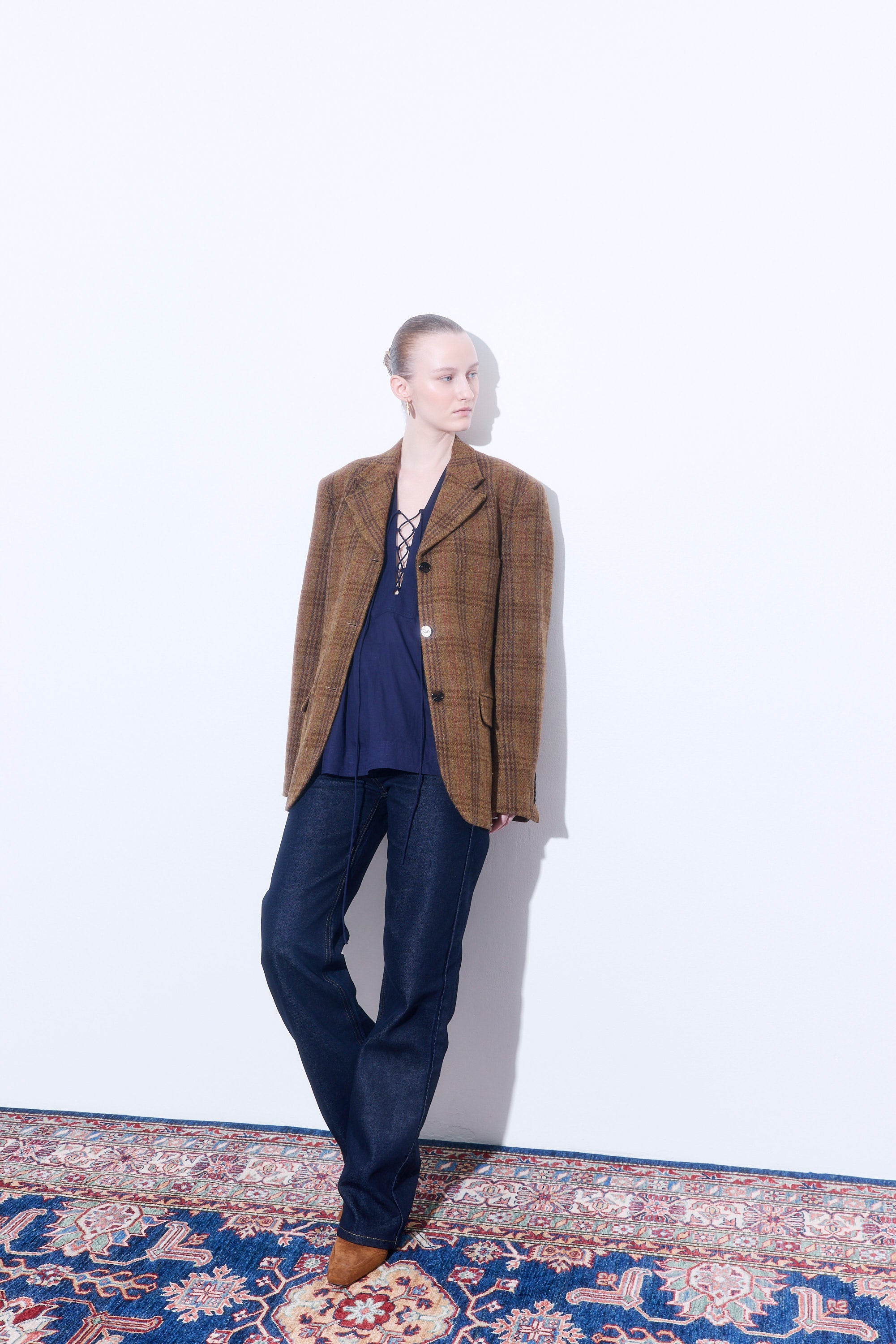 A classic blazer like jacket. Oversized fit. Complete with a lapel collar. Featuring two front flap pockets. Tonal, dark brown buttons. Tonal emboridered logo. Fully lined. Detailed with two inside pockets. Style it with our new, classic Fitted Thin Wool Long Sleeve and iconic No. 15 Denim for a sleek Winter look.
