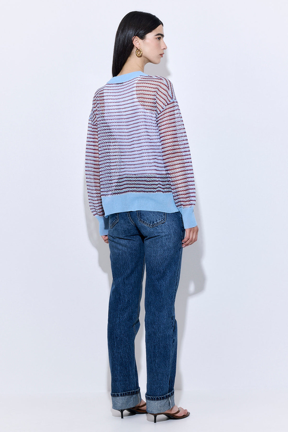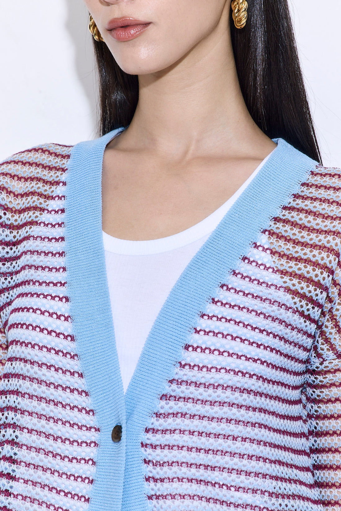 Our crochet cardigan is the perfect lightweight layer for breezy days and cool summer nights. Crafted from an airy open-crochet fabric, it offers a relaxed fit with a deep V-neckline and an engraved logo buttoned closure for an elevated touch. Featuring a ribbed finish on the cuffs, hem, and neckline for a structured yet comfortable feel. Style it over our new Calliphea one piece and our matching crochet maxi skirt for the most beautiful look this season.