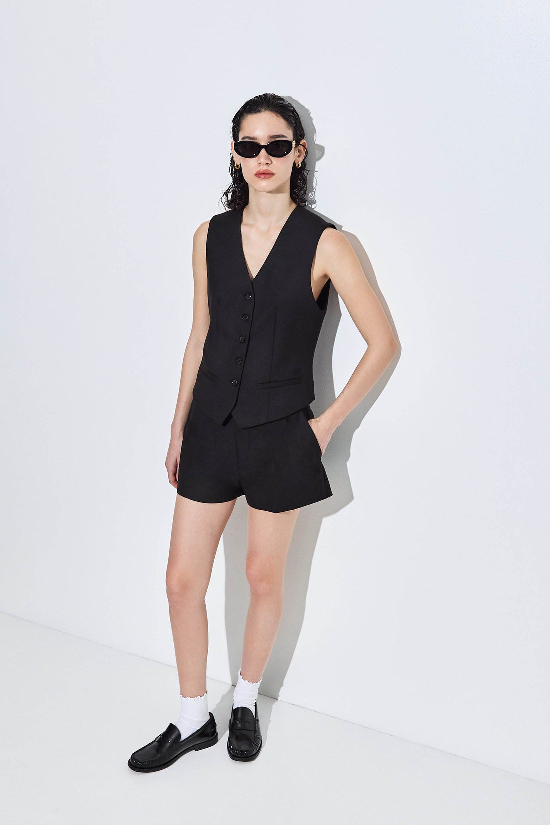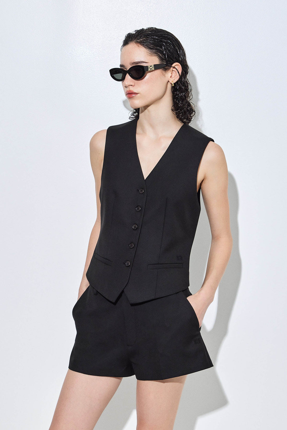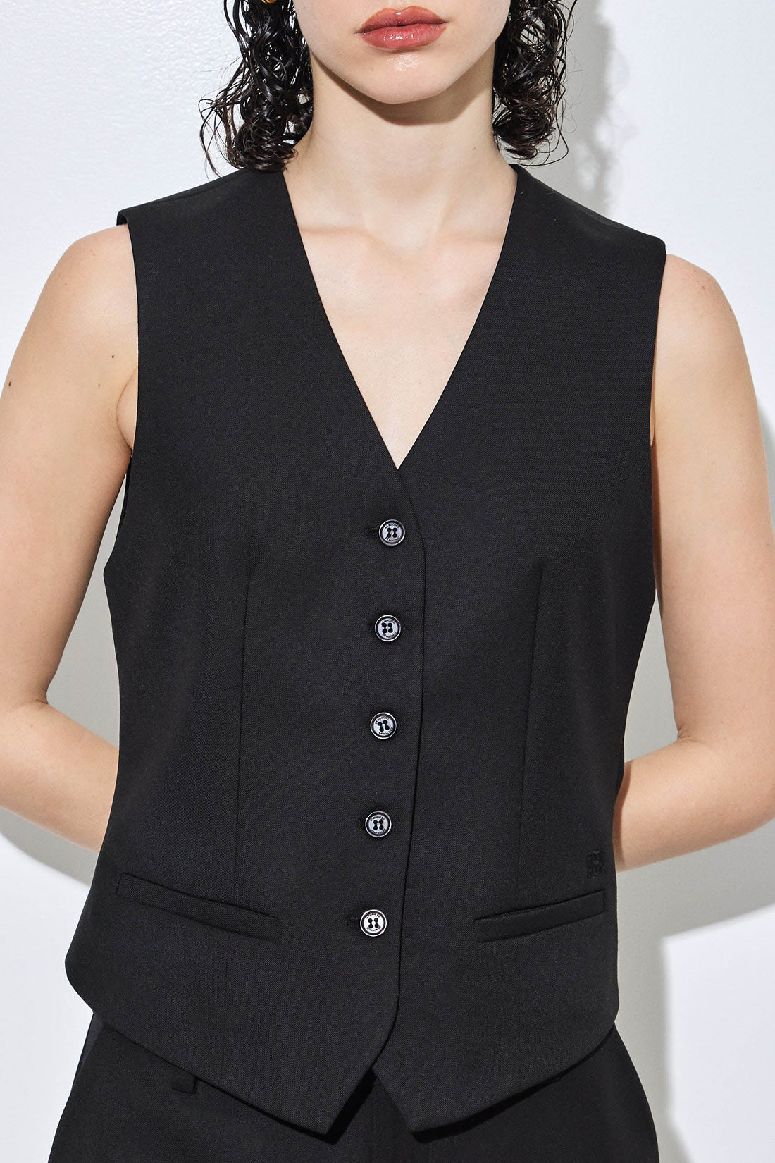The chicest vest you'll own in a new luxurious tailored fabric. Fitted silhouette. Engraved logo frontal button closure. V neckline. Front faux welt pockets. Delicate tonal embroidered logo detailing on the front. Lined. Featuring dart detailing for a fitted silhouette. Style it with our tapered daddy pants, our classy monogram scarf and a pair of our beautiful oval sunglasses.