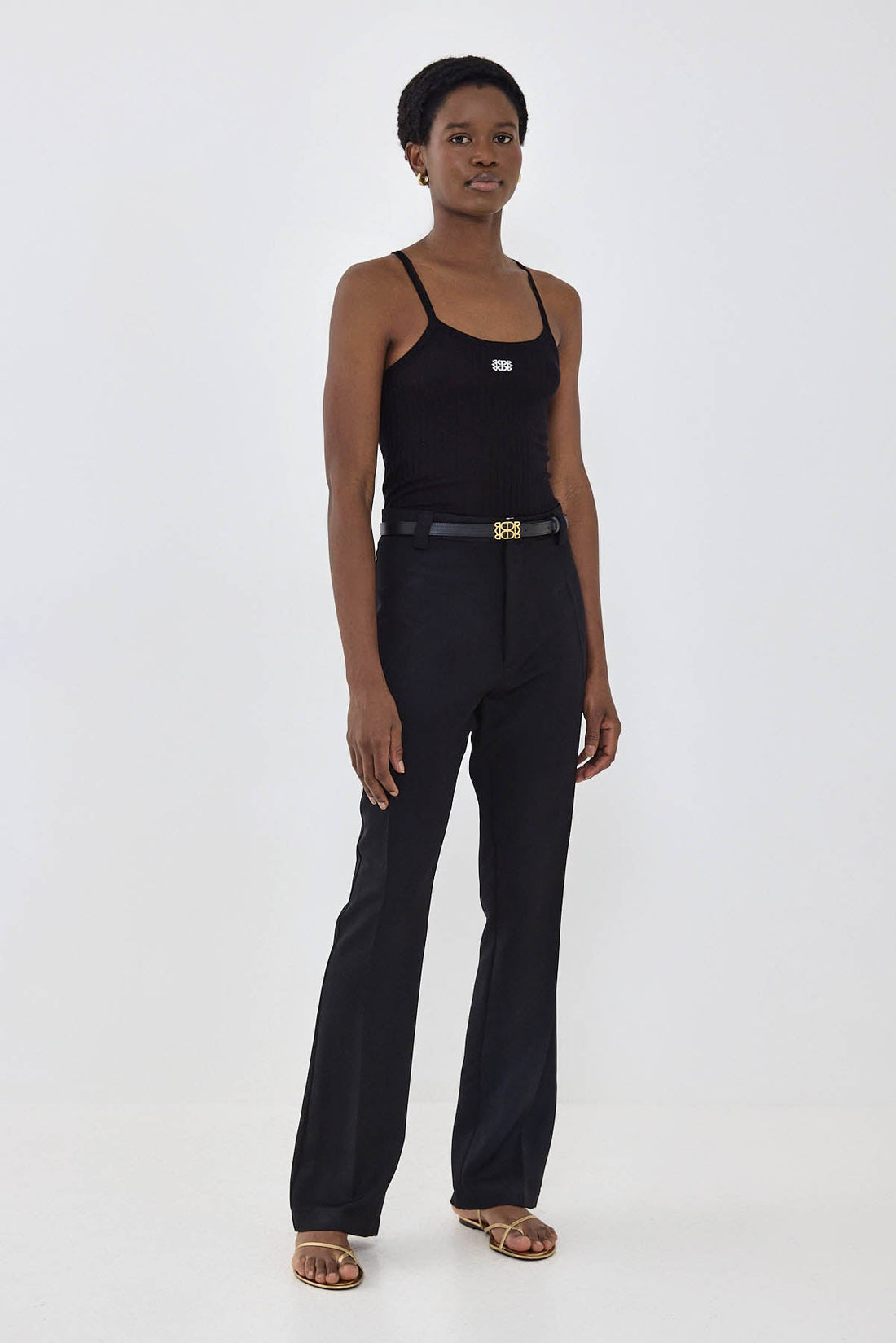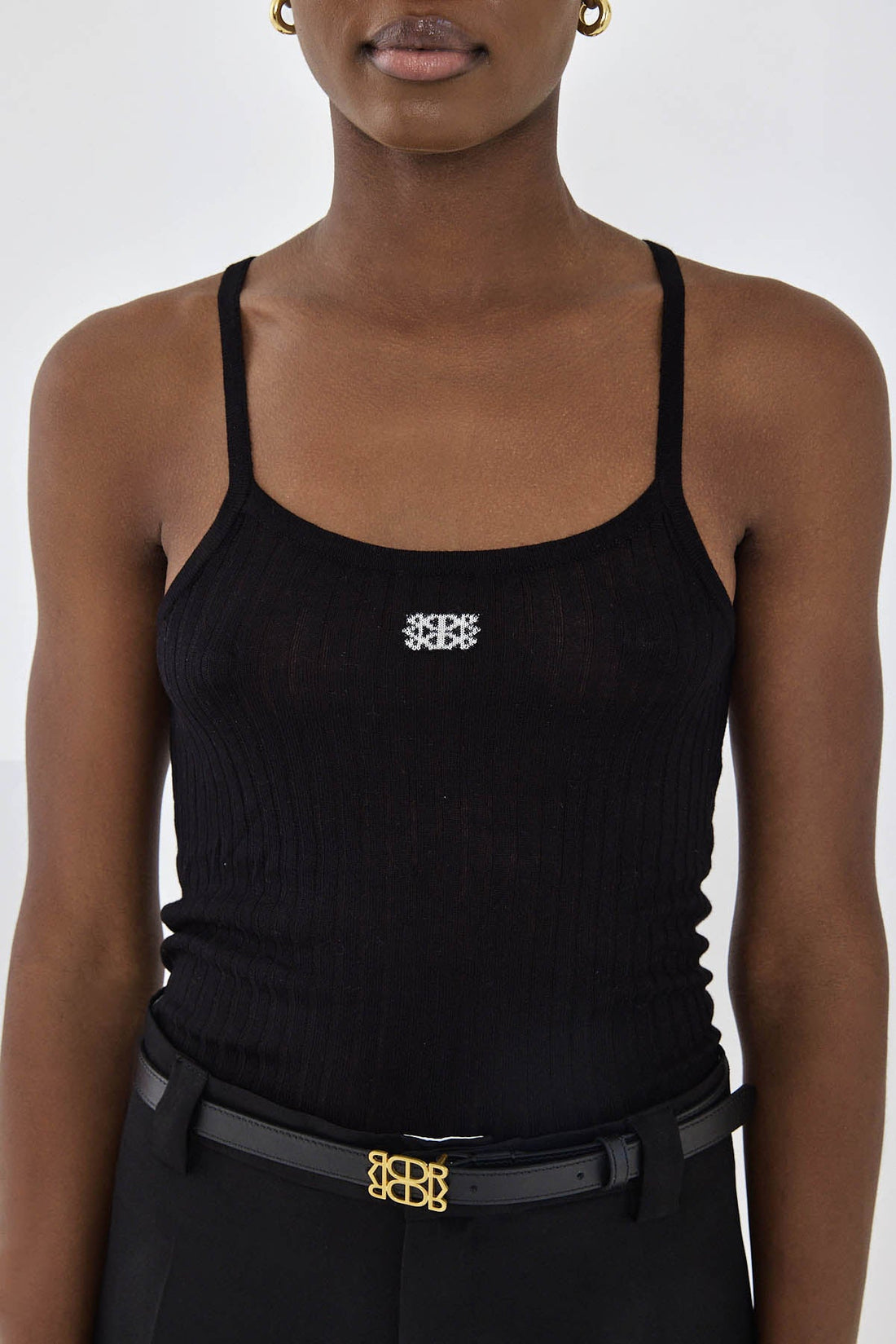 Look no further, this is the most perfect summer tank top you'll ever own. This summer is all about playing with colors and textures. Thin knit straps. Sheer ribbed material. Contrast intarsia logo detailing at the front. Racer style back. Ultra soft material. Style it with the cotton drill maxi skirt, chunky hoops and add a pop of color with a fun heel for the perfect summer look.
