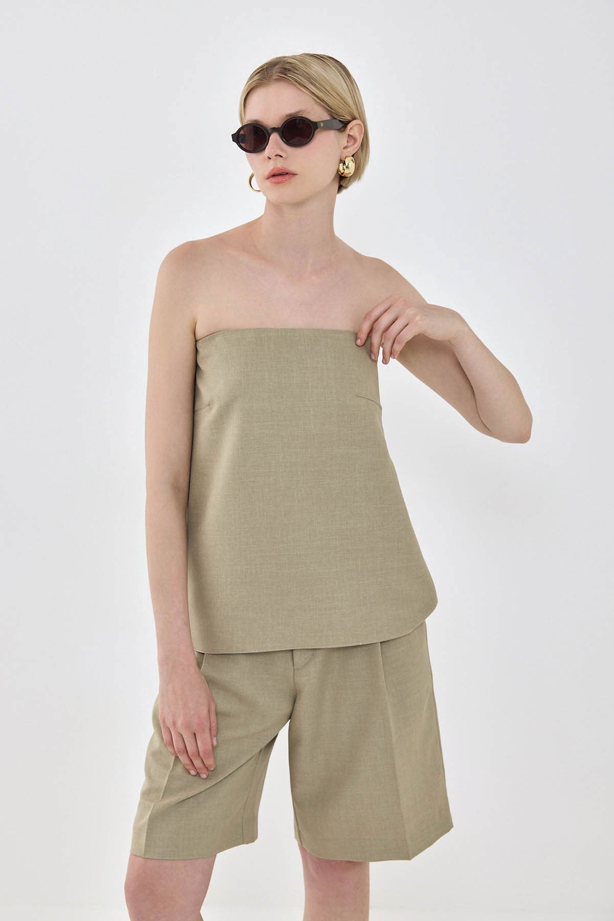 The most perfect strapless top in our signature daddy fabric. Featuring a silicon strap all around the top part of the fabric for extra support and grip. Ton sur ton invisible zipper closure on the side. Tonal embroidery logo detailing at the back. Style it with your favorite denim, Croco belt and some delicate accessories for an effortless day to night look.