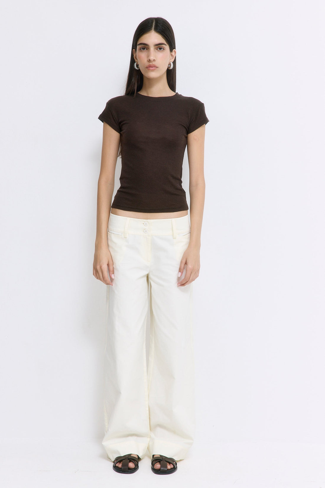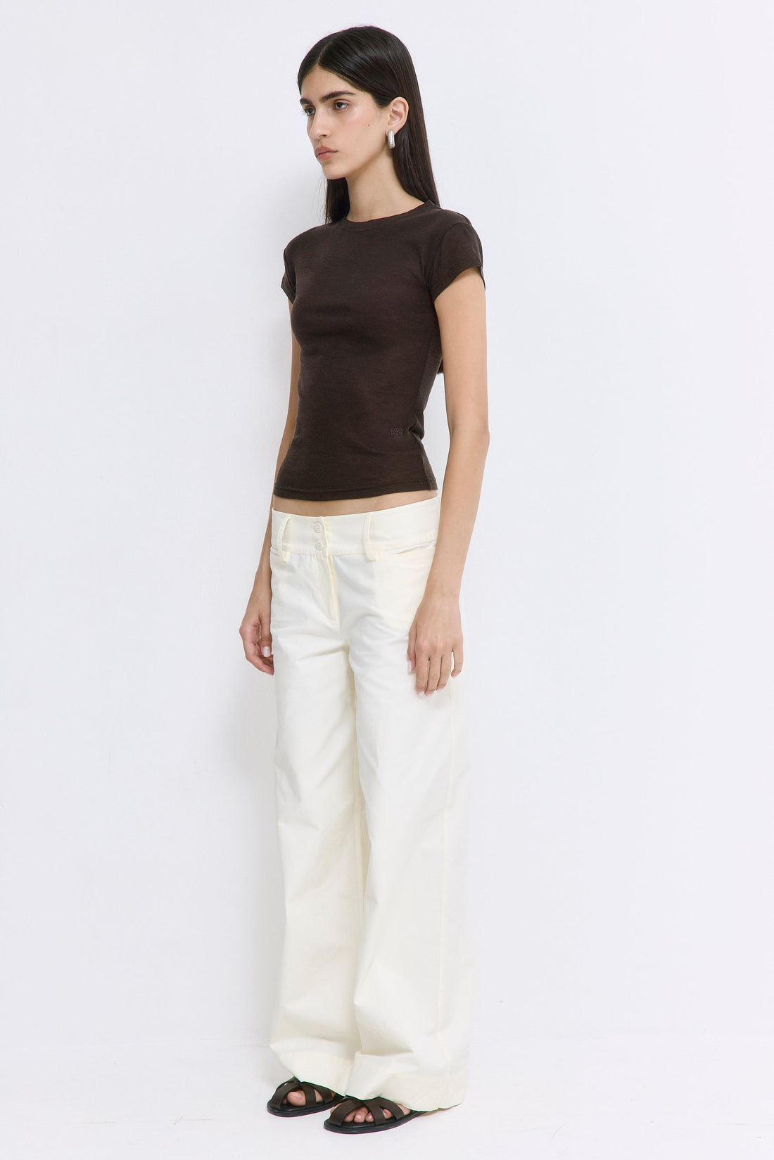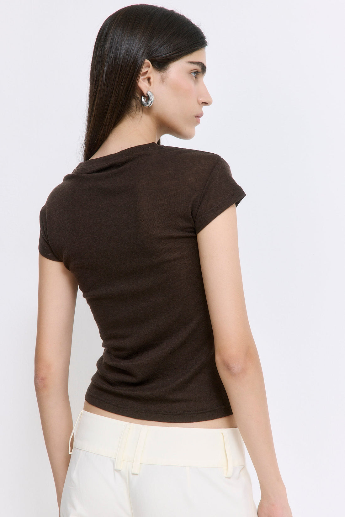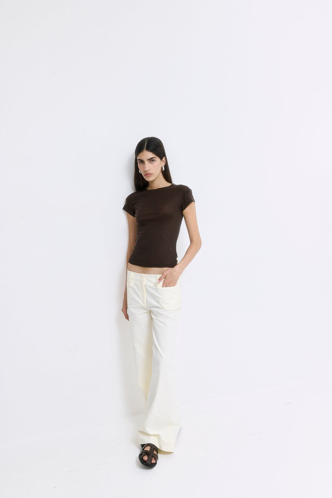 Our fitted wool cup tee is a must having piece from our thin wool collection. Made from ultra-light, breathable wool that regulates temperature and wicks moisture — keeping you cool, dry, and effortlessly chic all season long. Crew neckline. Short angled cut sleeves. Fitted silhouette. Tonal logo embroidered on the side. Clean finish. Style it with our perfect denim mini skirt, our chic scrunchie and finish the look with our timeless Rodika suede tote bag.