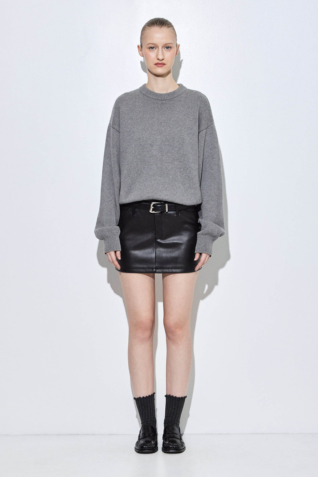 Our new cotton crew neck sweater is the ultimate way to layer this season. Ribbed finish. Crew neck line. Relaxed silhouette. Tonal embroidered logo on the back. Style it with our vegan leather mini skirt, our croco belt and our double wool blazer for a cool day to night look.