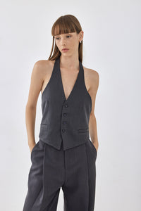 Halterneck style vest with an open back. Front button closure. Front welt pockets. Logo embroidery ton sur ton detail on one of the welt pockets. Style it with your favorite matching color daddy bottom for an effortlessly chic look perfect for day to night.