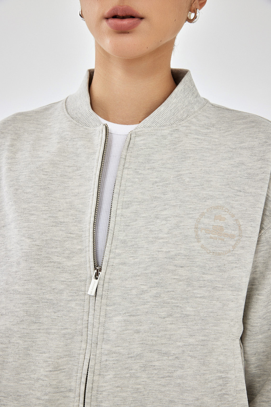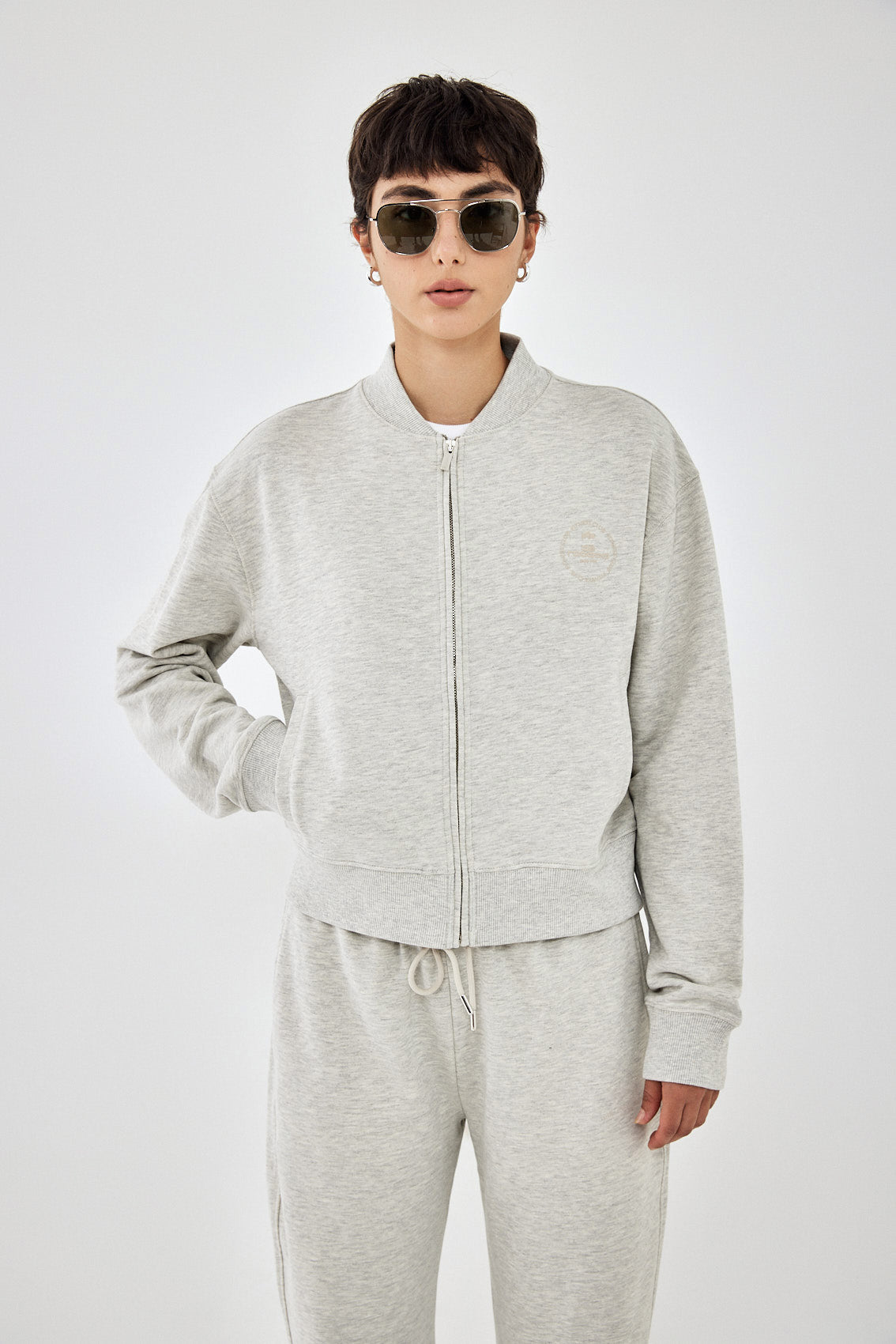 Cozy in style. Cropped zipped sweatshirt featuring straight sleeves with a ribbed finish. French terry. Featuring a delicate tone on tone rubber print on the front. Style it with the matching jogger and your favorite pair of sneakers for the ultimate comfy everyday look.
