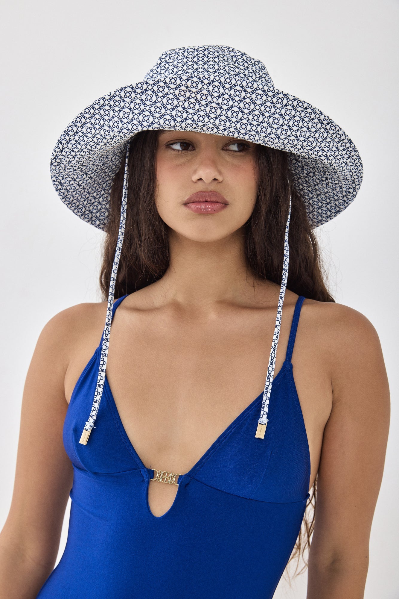 DR signature sun bucket hat. Featuring wide edges. Blue monogram pattern comprised of a few shades of blue. Tonal stitching detailing. Logo press detail. Two strings to tie the hat with a golden eglet finishing with a delicate logo. Double lined. Hand made from a delicate knitted, ribbed texture fabric. The perfect summer accessory to protect our skin from the sun without compromising style. The ultimate hat to complete any summer look.