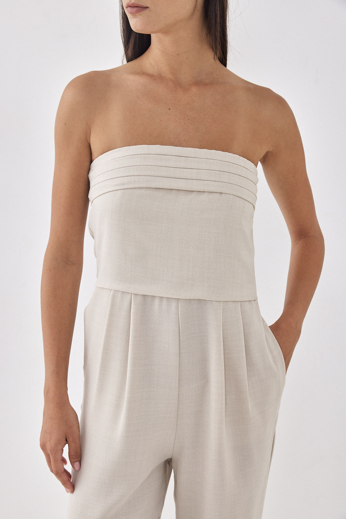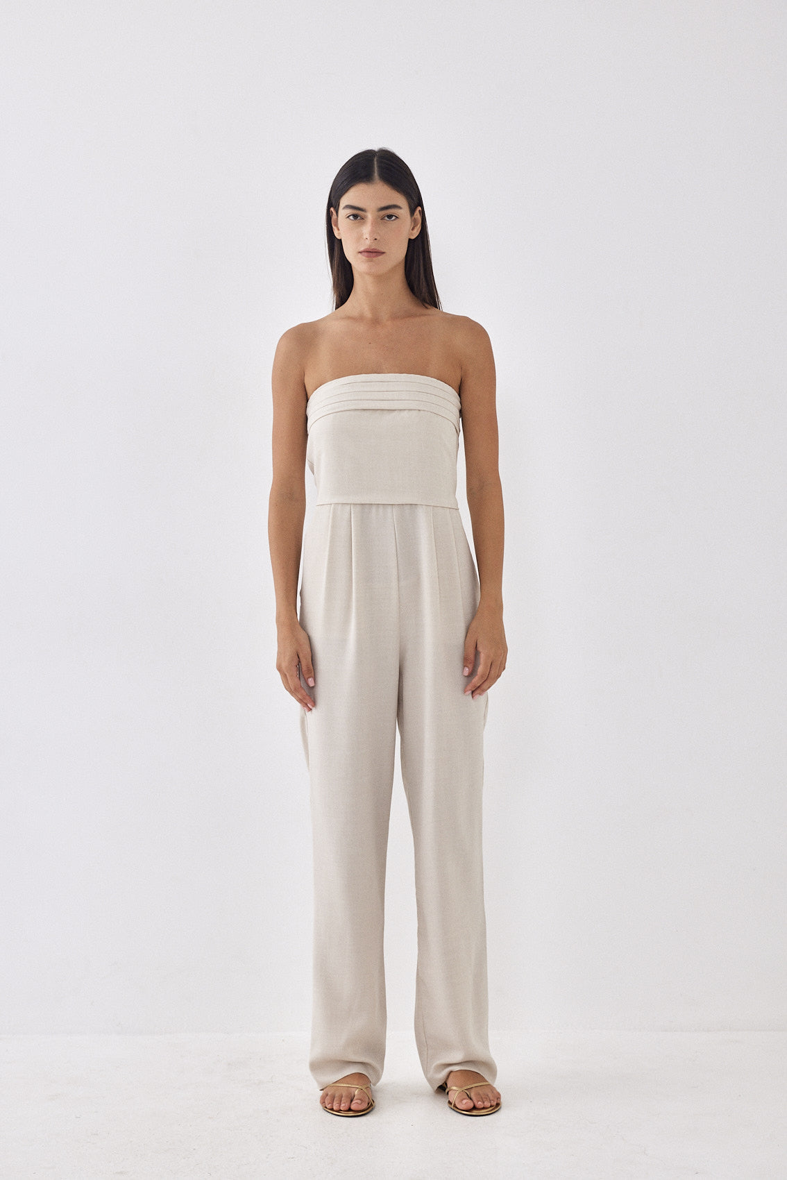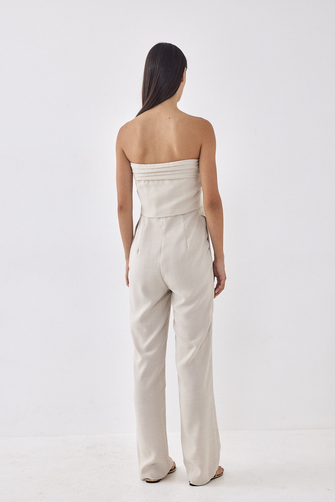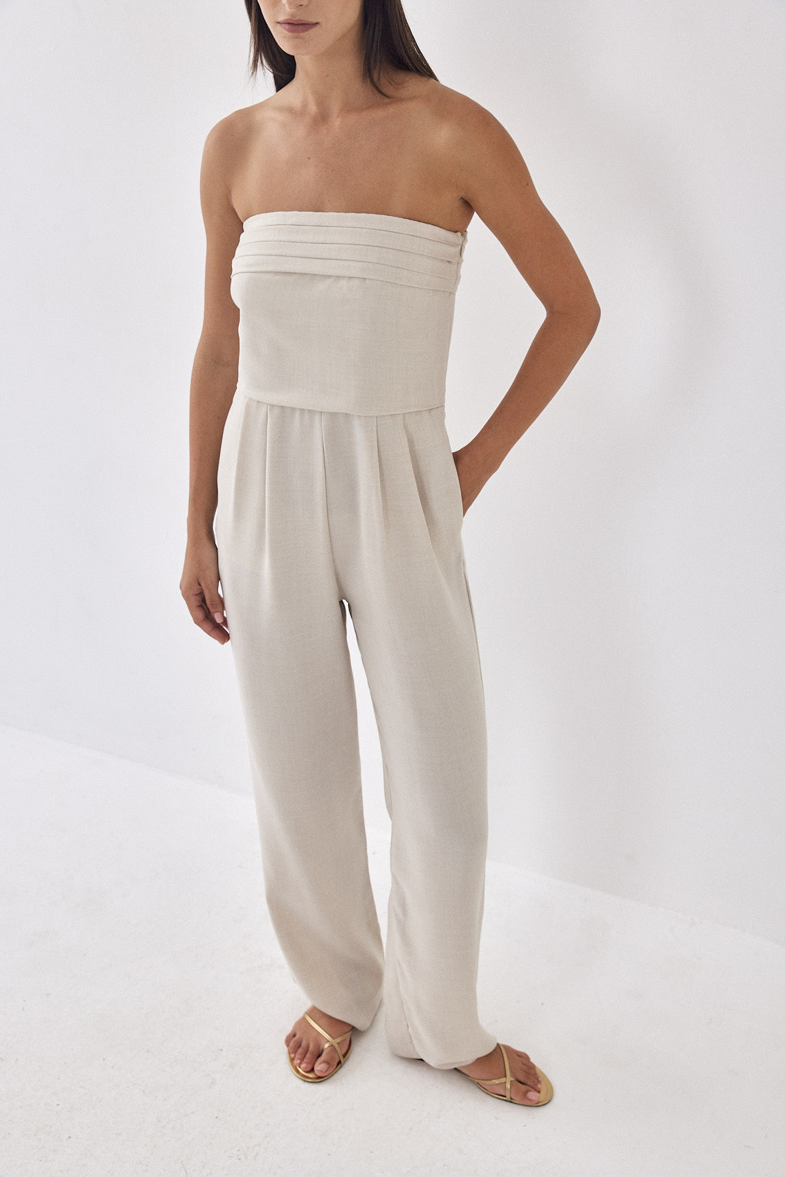 The ultimate lightweight jumpsuit. Featuring pleat detailing. Corset silhouette top with a straight full length leg fit. Two side pockets. Lightweight breathable material, perfect for day-to-night looks. Side zipper closure. Style it with a pair of delicate sandals and earring studs for a gorgeous effortless look, perfect for your next holiday.