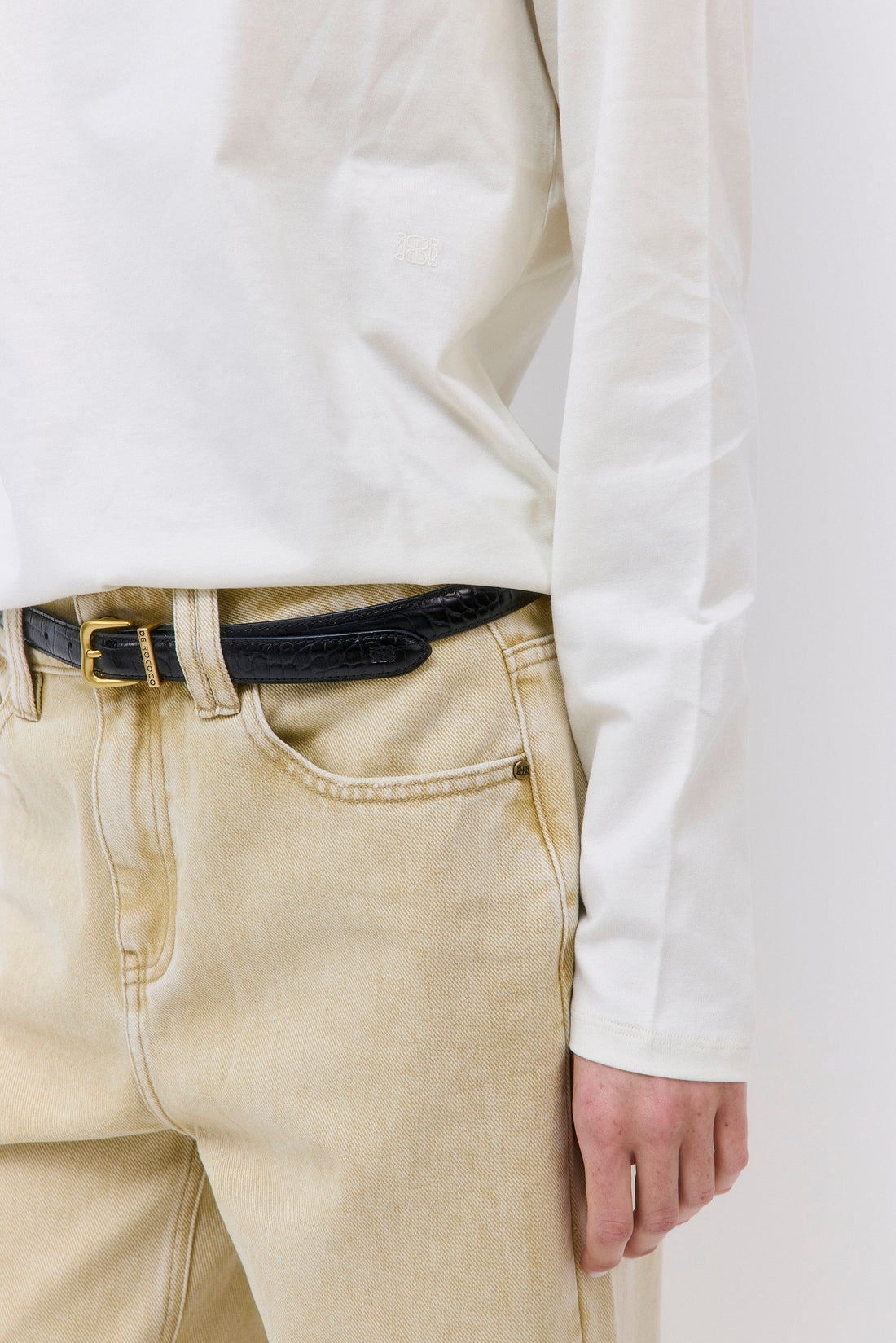 Our Classic Long Sleeve T Shirt is an iconic addition to our basics family. Crafted from crispy cotton. Loose fit. Long sleeves. Crew neckline. Tonal embroidered logo in the front, mid waist. Style it with our capsule Wide Leg Cotton Pants and chic Oval Sunglasses for a refined look.
