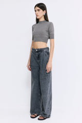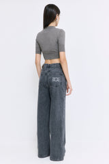 Introducing the newest addition to our signature denim collection. Made from premium 100% rigid cotton. High rise. Super wide fit. Featuring two side pockets. Pleat detailing in the front. Button closure. Full length. Patch print tonal logo detailing at the back pocket. Washed brownish-grey leather patch with debossed logo detailing. Ultra flattering and effortlessly cool. Style it with your favorite summer tank and slides for the perfect everyday look.