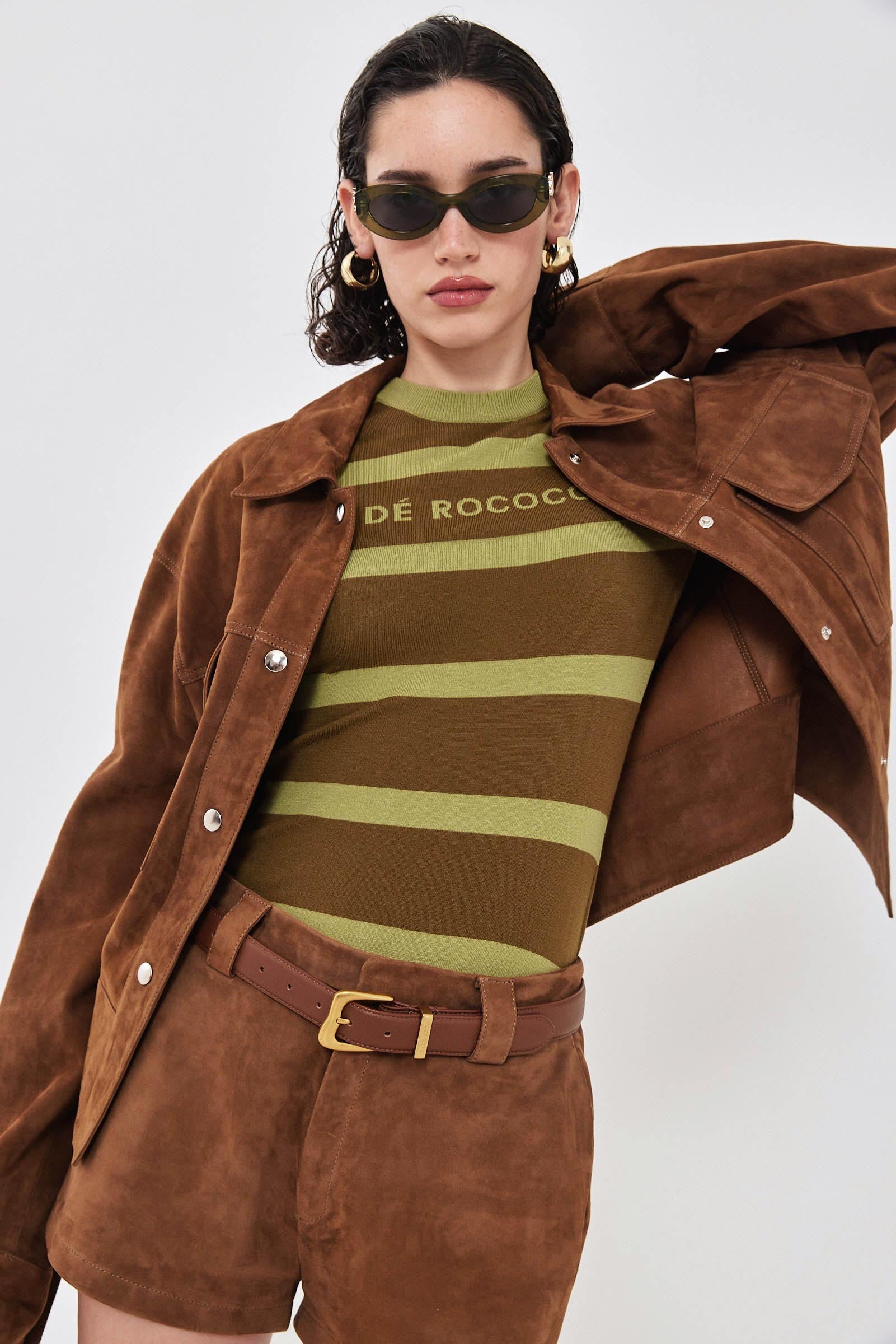 Your go to piece for effortless layering this season. Features a crew neckline and a tight fit. Long sleeved. Ribbed finish. Fitted silhouette. Contrasting intarsia logo detailing on the front. Style it with our super wide daddy pants, our croco belt and our beautiful vegan leather bomber to seal this gorgeous look.