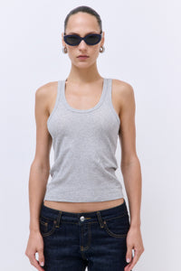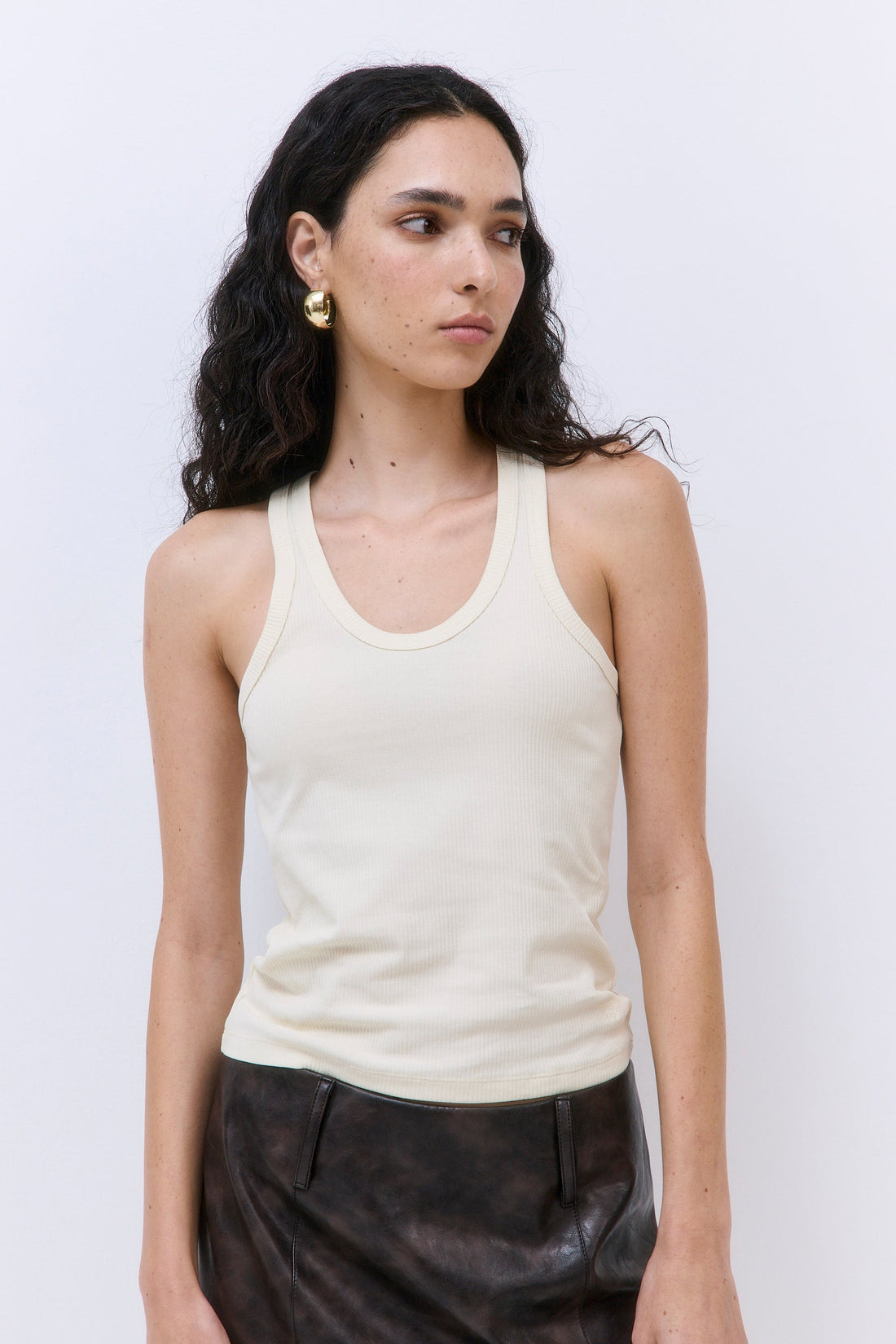 The perfect summer tank, iconic and timeless. Fitted without being too tight. Ribbed low scoop neckline. Sleeveless. Tonal embroidered logo at the front side. Style it with our elegant No. 15 Denim and chic Rodika Tote Bag for an effortless off-duty polish.