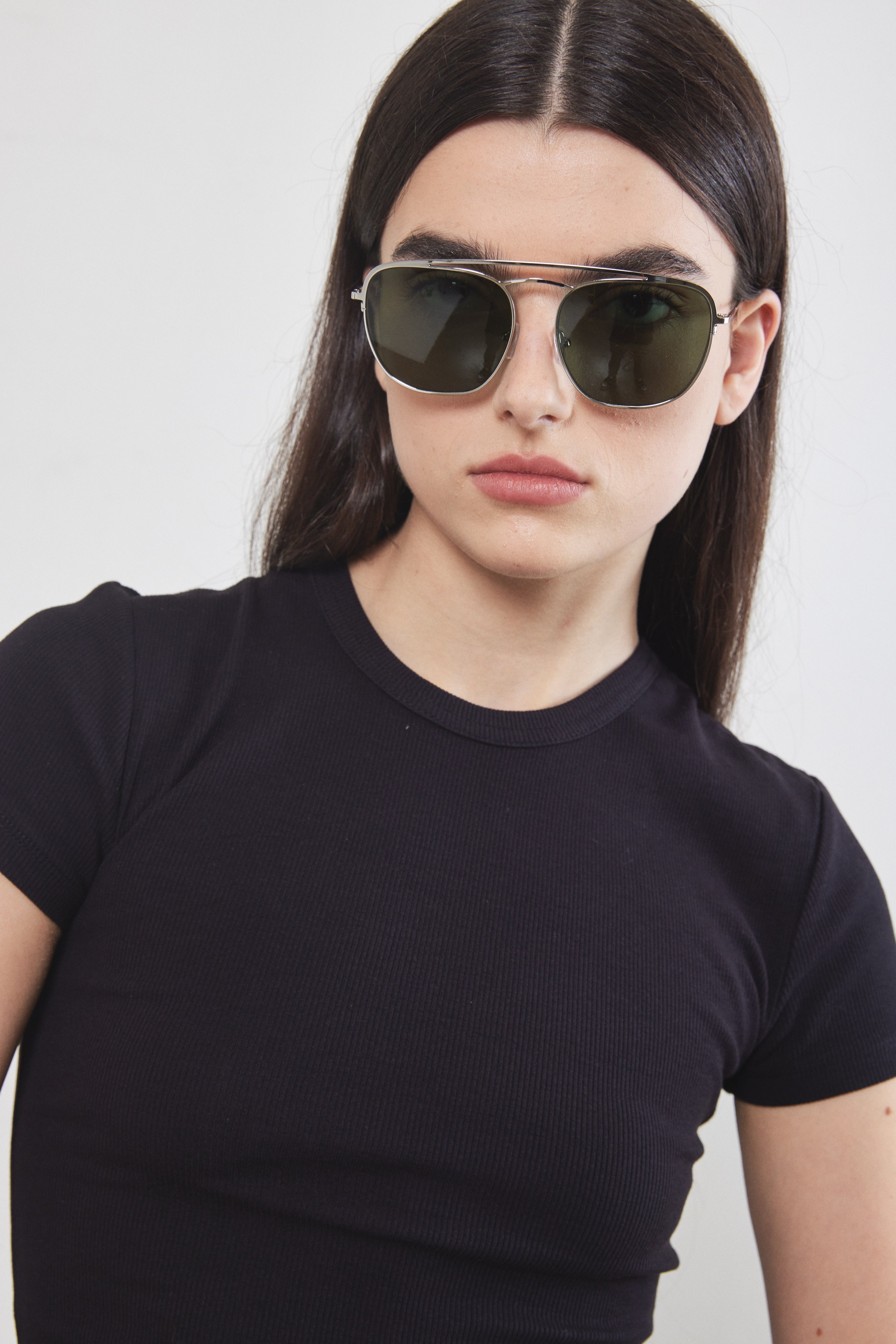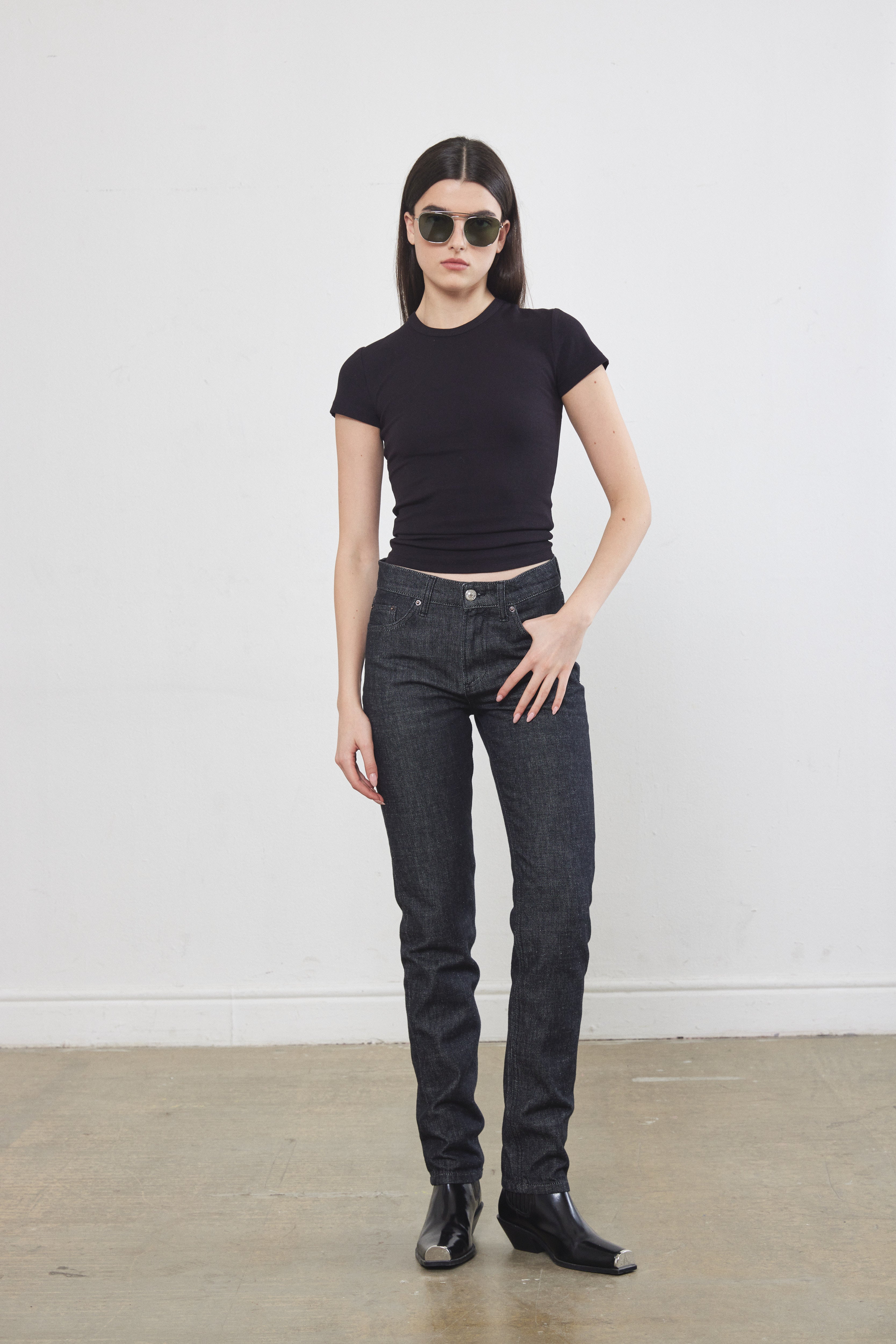 Short sleeve ribbed top. Features a crew neckline and a close fit. A basic T shirt that goes with every bottom and easy to layer.