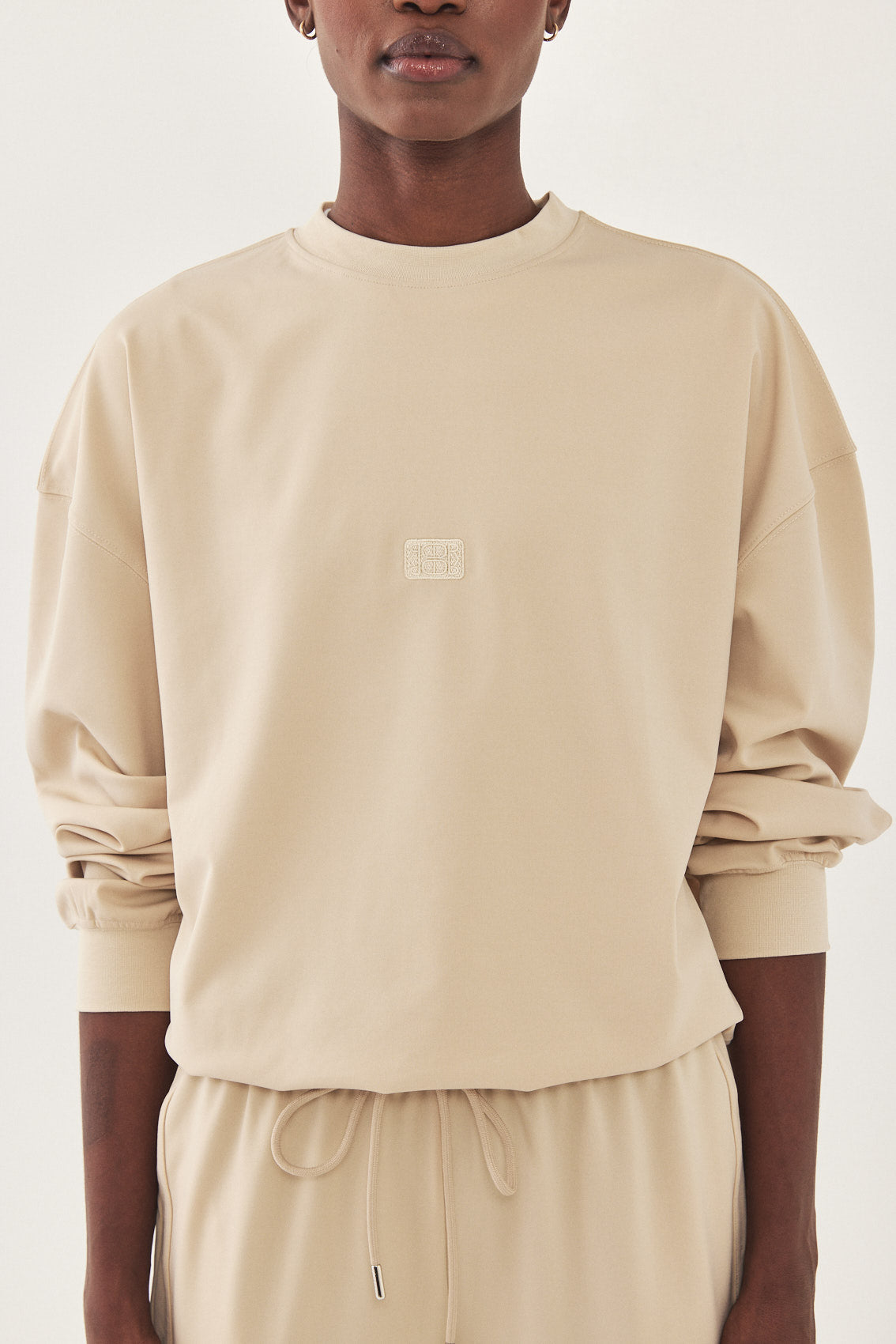 Oversized fit sweatshirt with a crew neckline and a delicate shiny finish. Features an embroidered logo detail on the front. Made from a lightweight breathable fabric, perfect for all seasons. Complete the look with the matching track pants and a pair of sneakers.