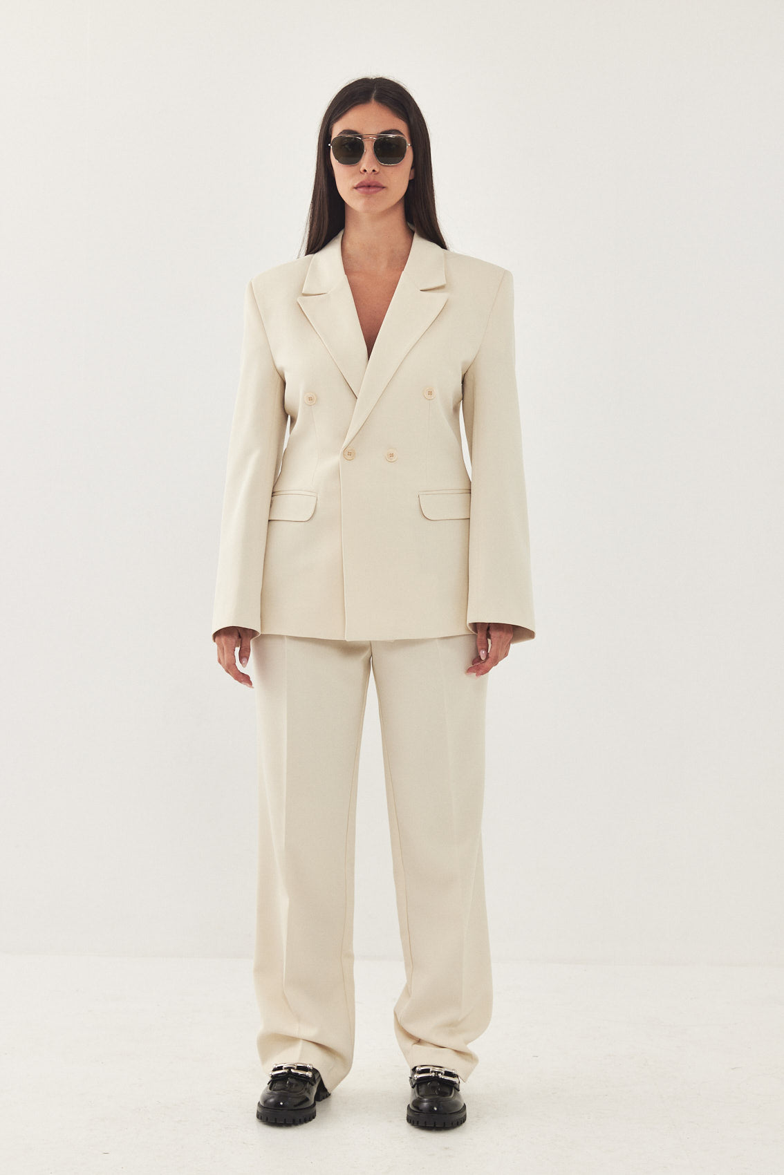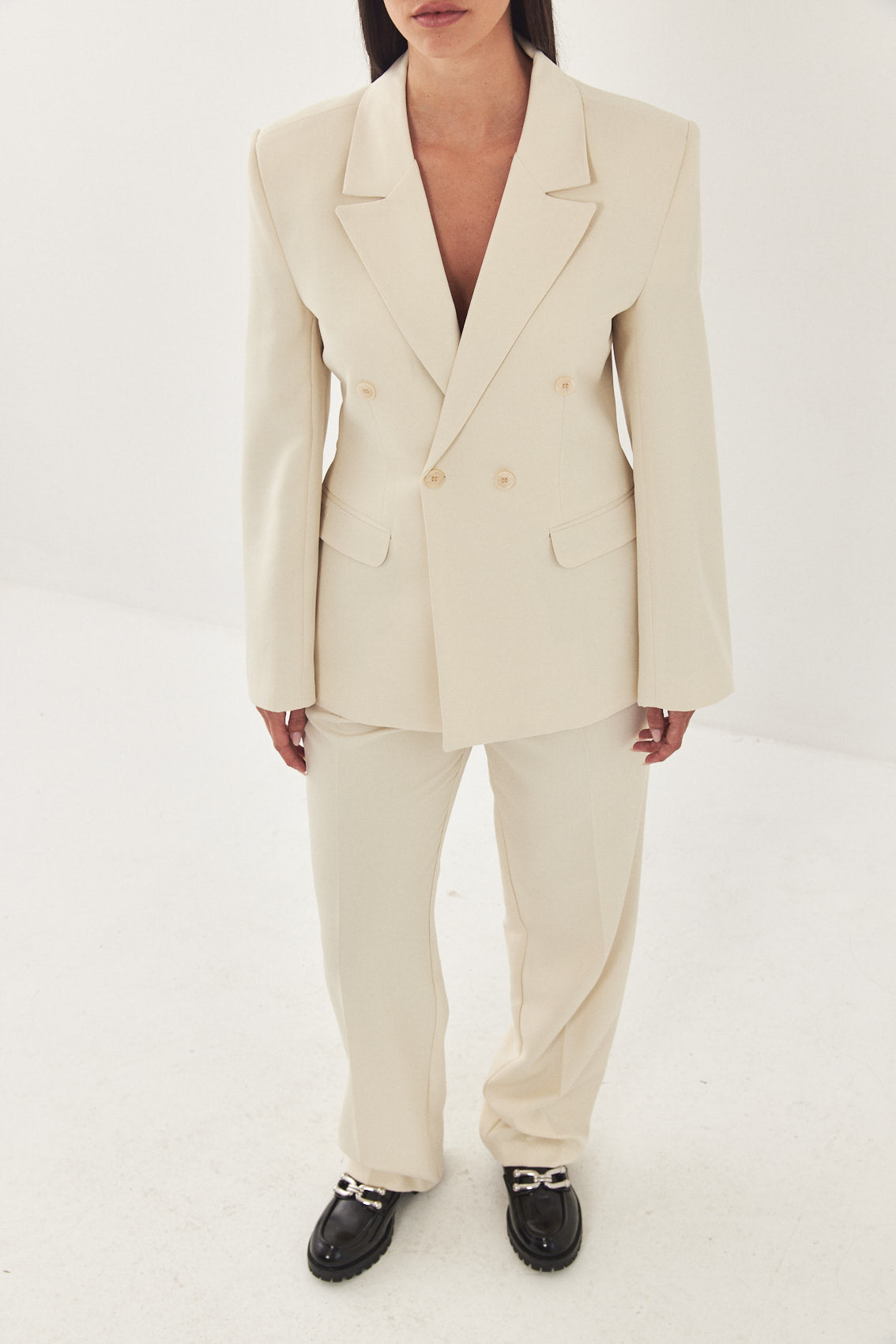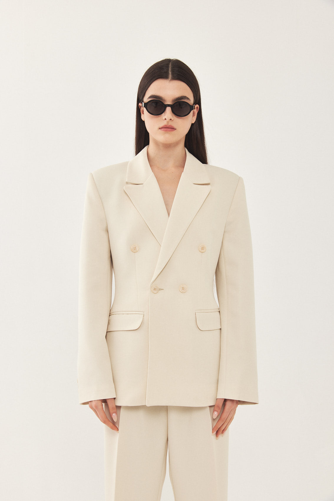 A classic blazer with an oversized fit. Features broad shoulders and a lapel collar. Fitted at the waist for a cinched look, giving the blazer a structural shape. Double breasted buttoned closure. Back embroidered logo detail on the collar. Complete the look with a pair of matching daddy pants and a pair of loafers for a classic look.