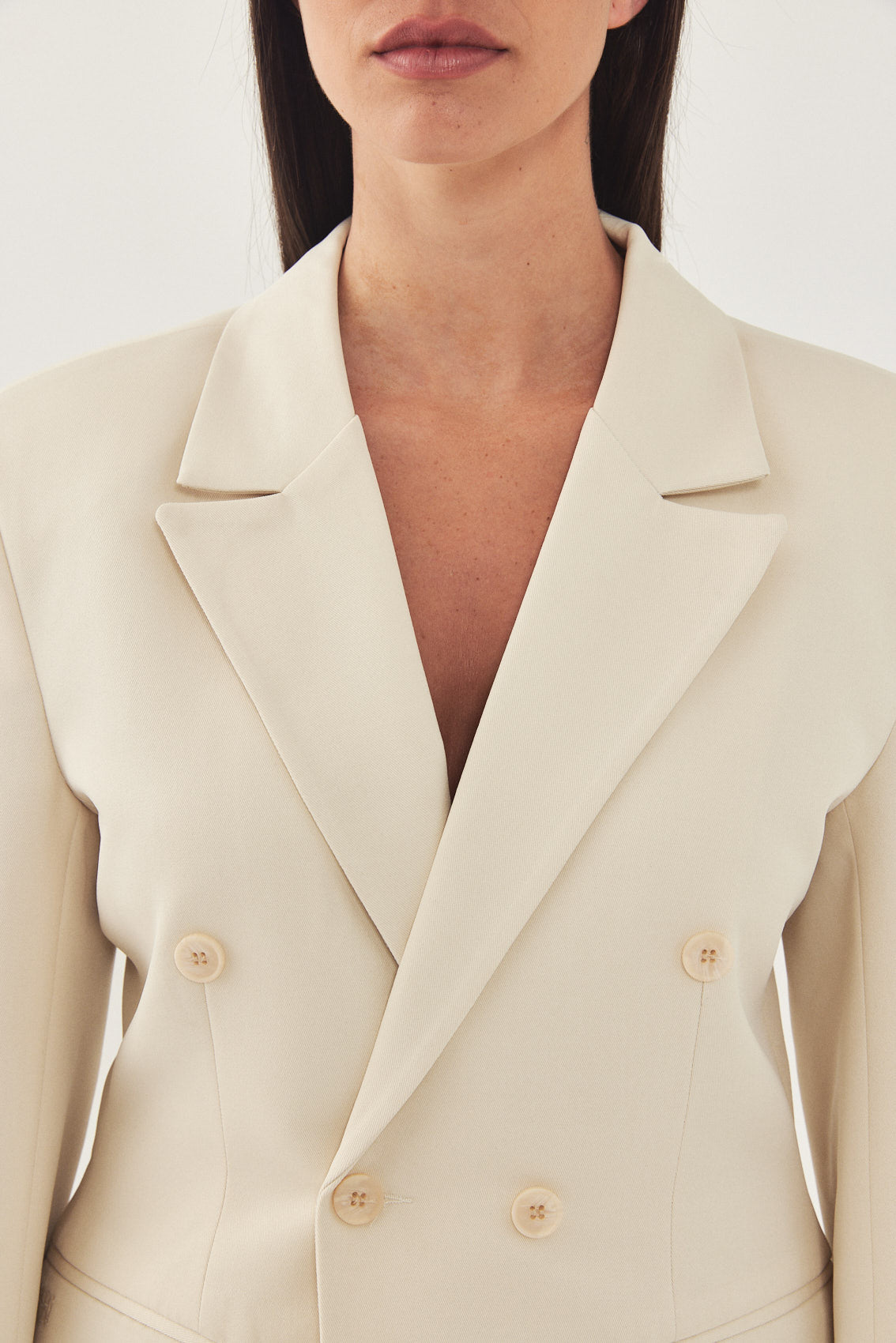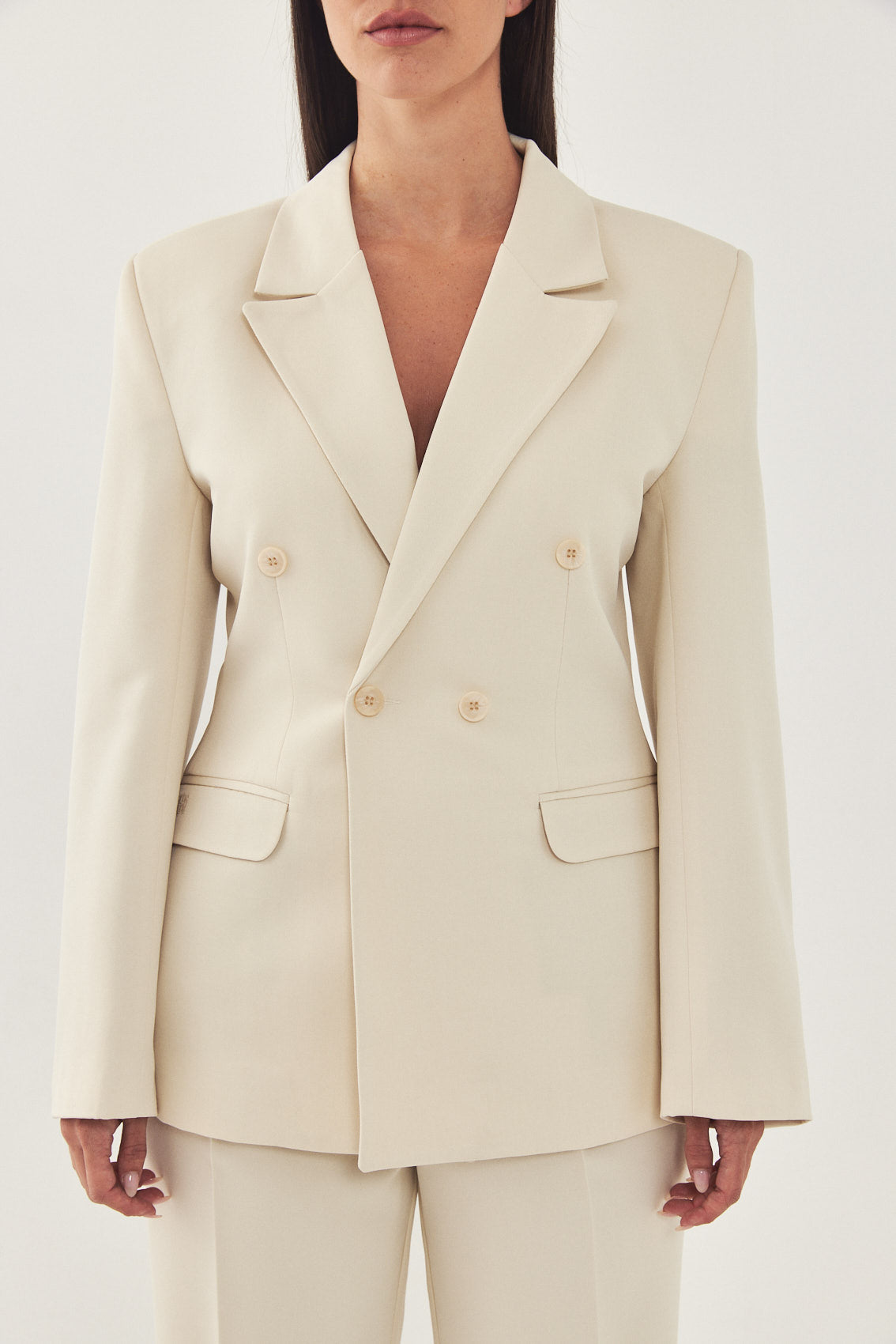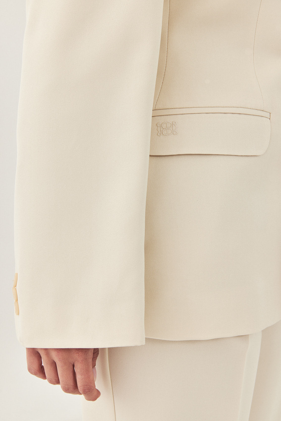 A classic blazer with an oversized fit. Features broad shoulders and a lapel collar. Fitted at the waist for a cinched look, giving the blazer a structural shape. Double breasted buttoned closure. Back embroidered logo detail on the collar. Complete the look with a pair of matching daddy pants and a pair of loafers for a classic look.