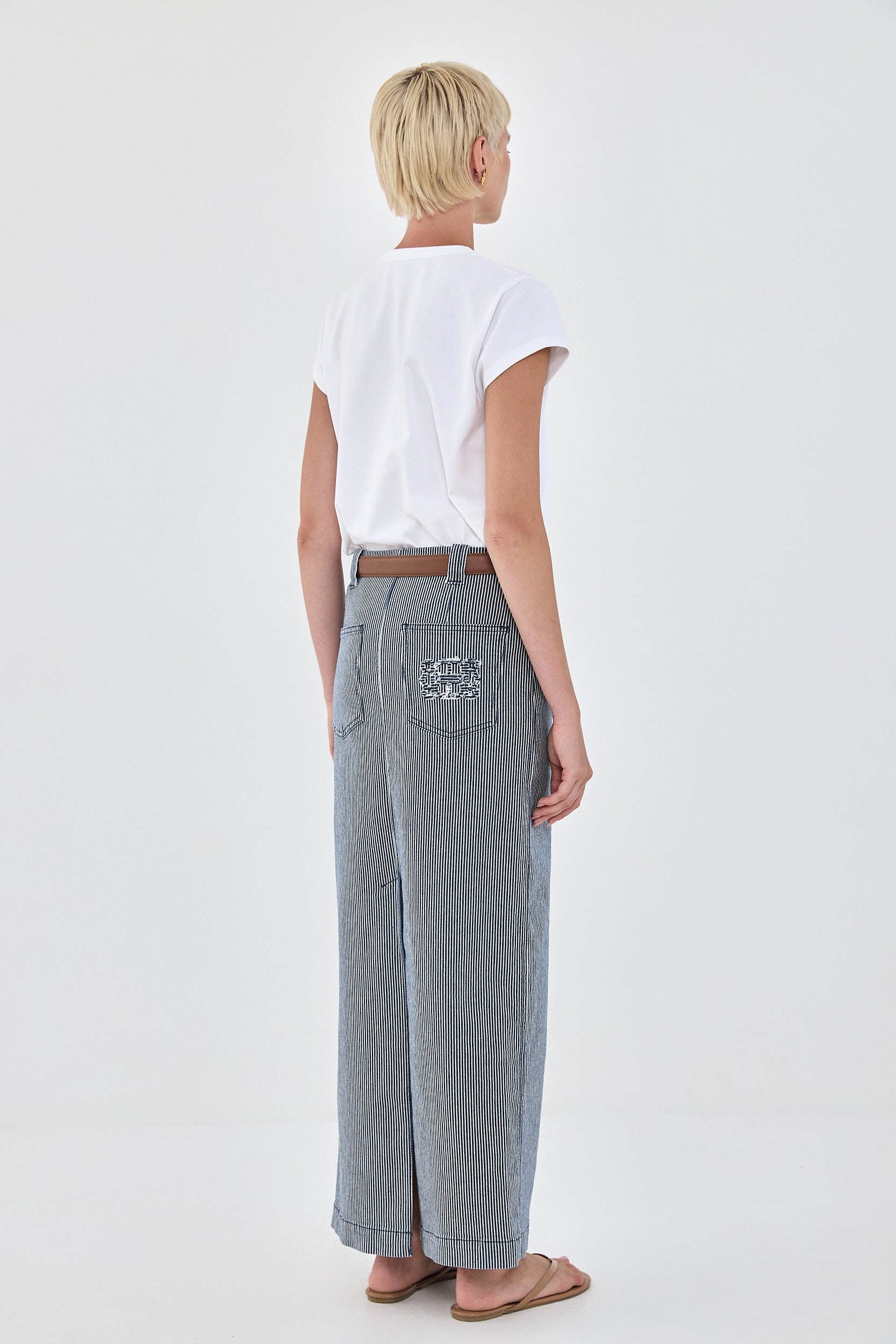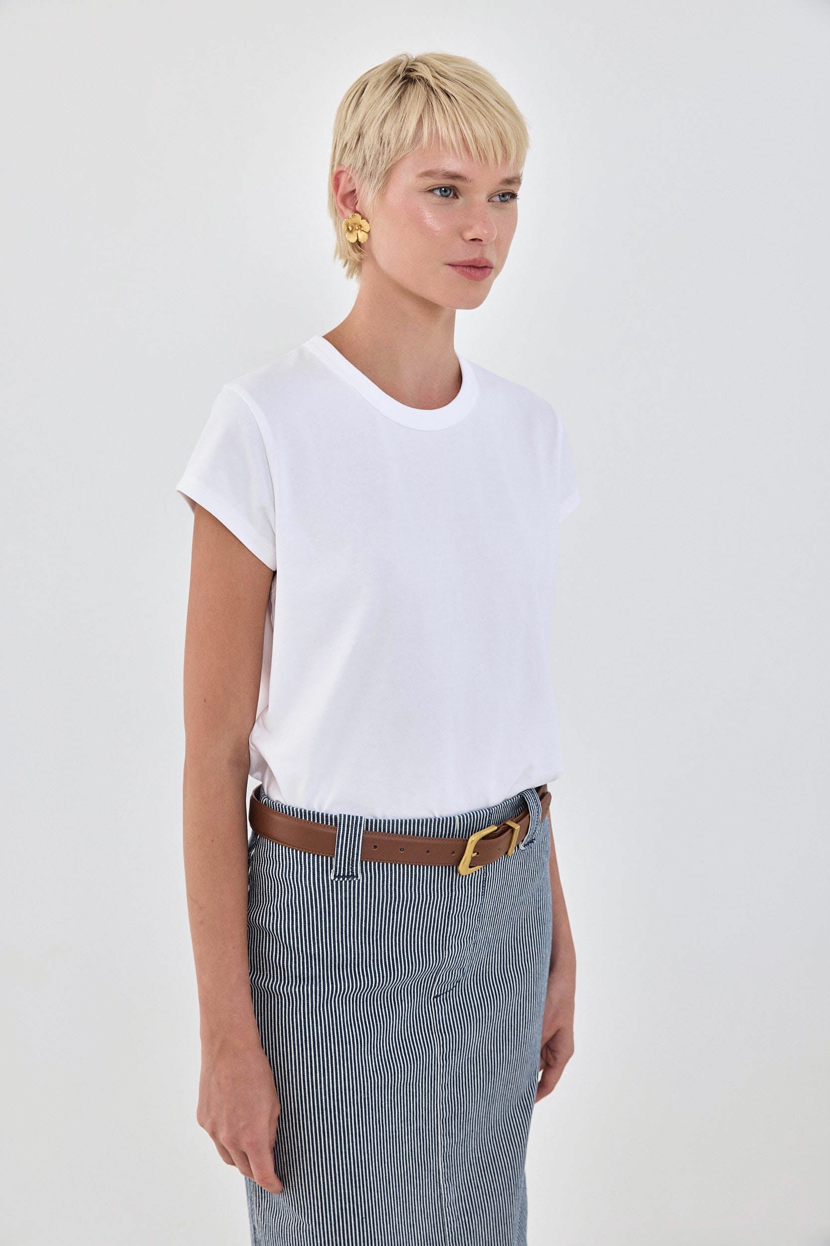 Your new go to everyday T-shirt. Classic crew neckline. Made from a thick heavy cotton composition, maintaining its shape all day long. Mini short sleeves. Embroidered tonal logo detailing at the front of the shirt, just the waistline. Style it with your favorite daddy bottom, croco belt and cat eye sunglasses for a Parisian summer look.