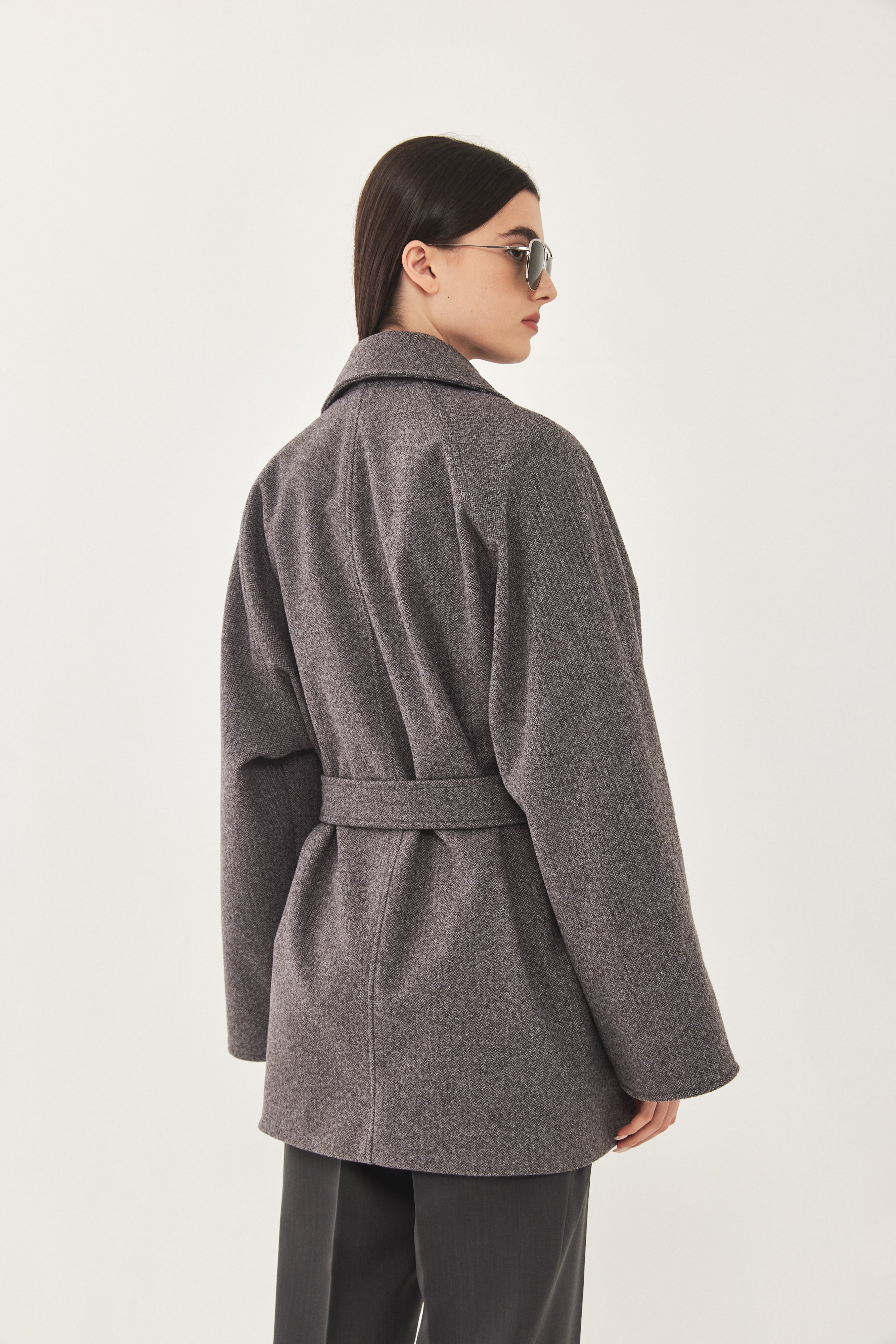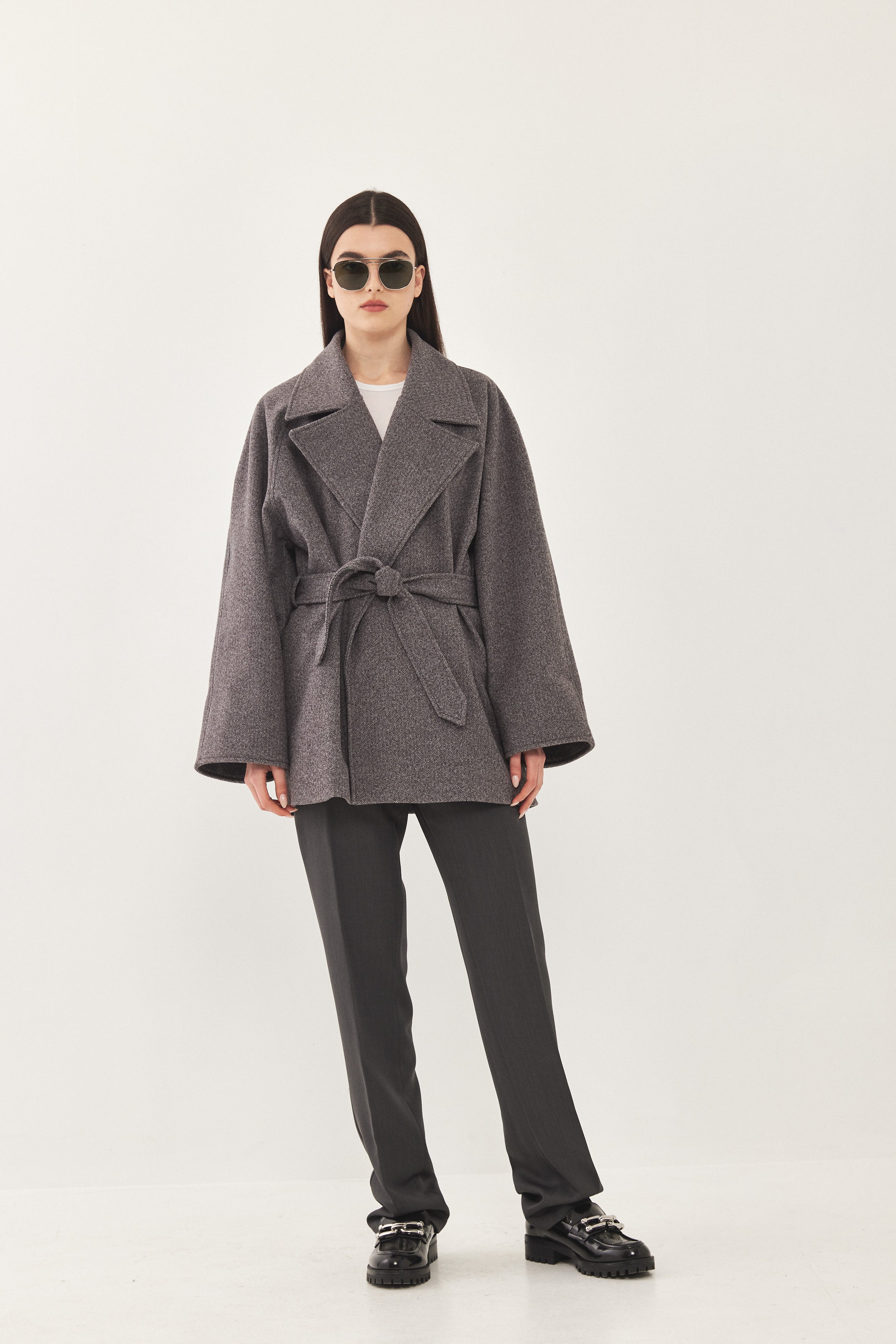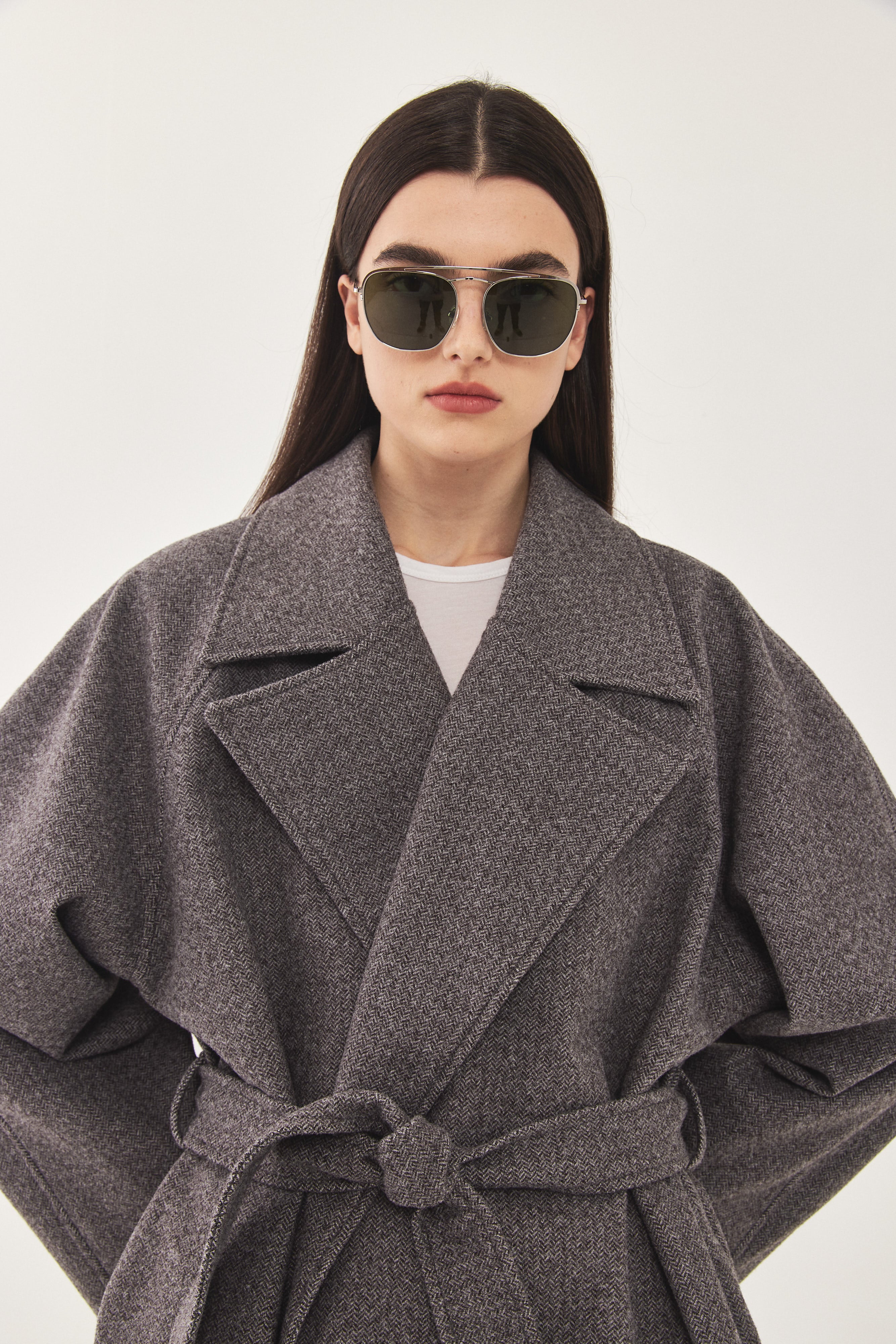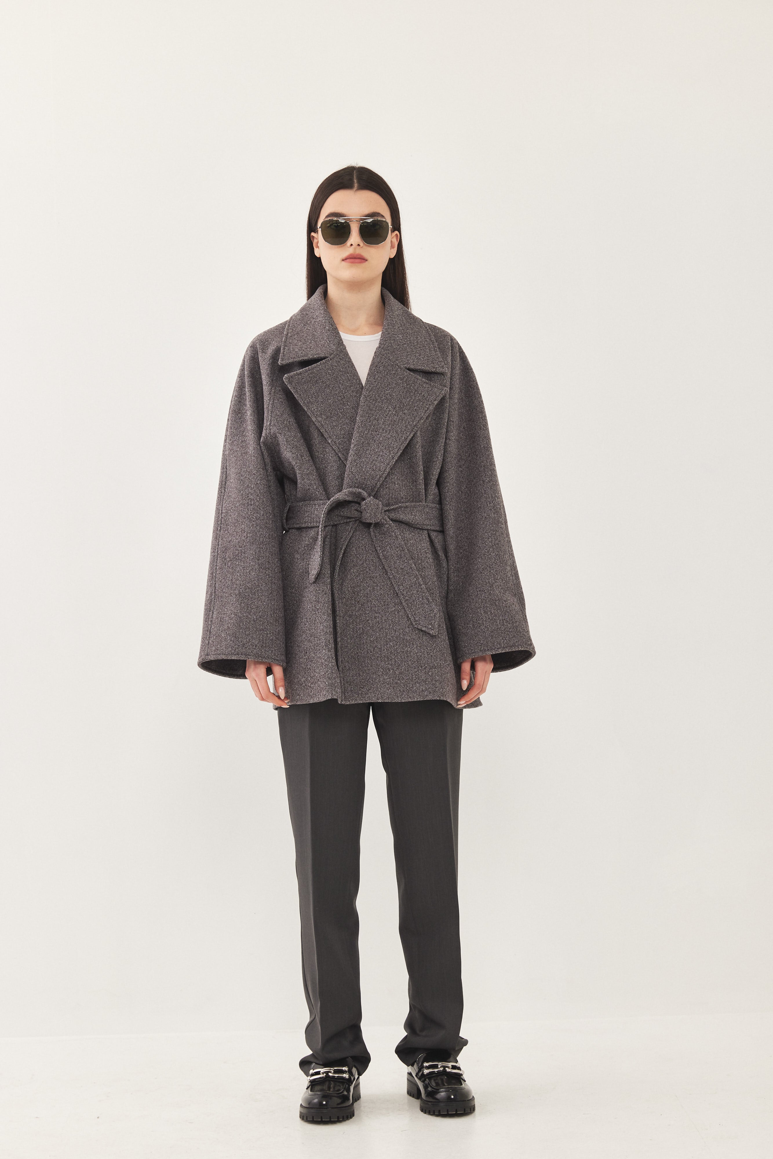 A heavy weight rode coat. An oversize fit with long voluminous sleeves and side pockets. Features a lapel collar with an embroidered logo. Comes with a detachable waist belt. A cozy worm coat you can wear over any outfit.