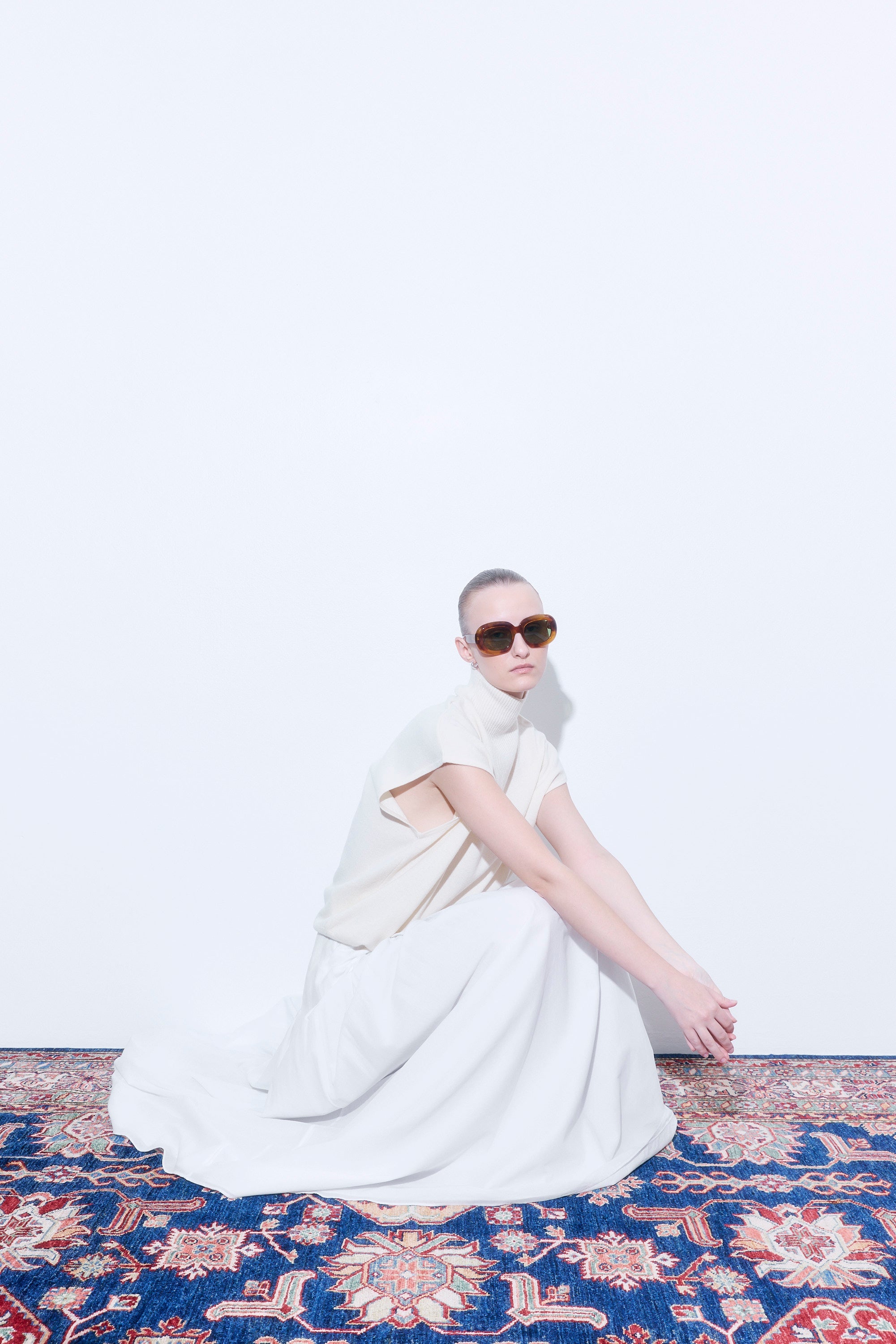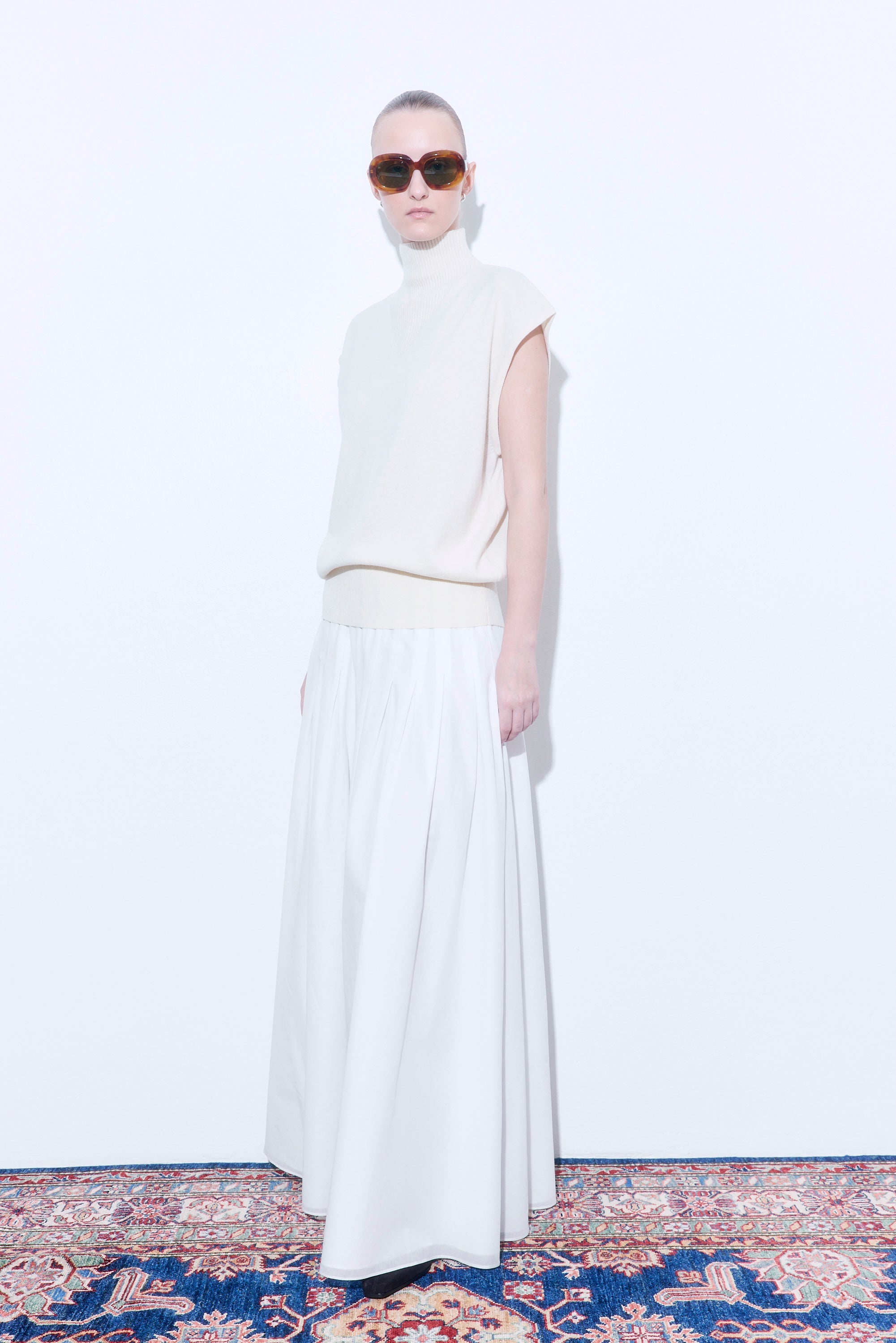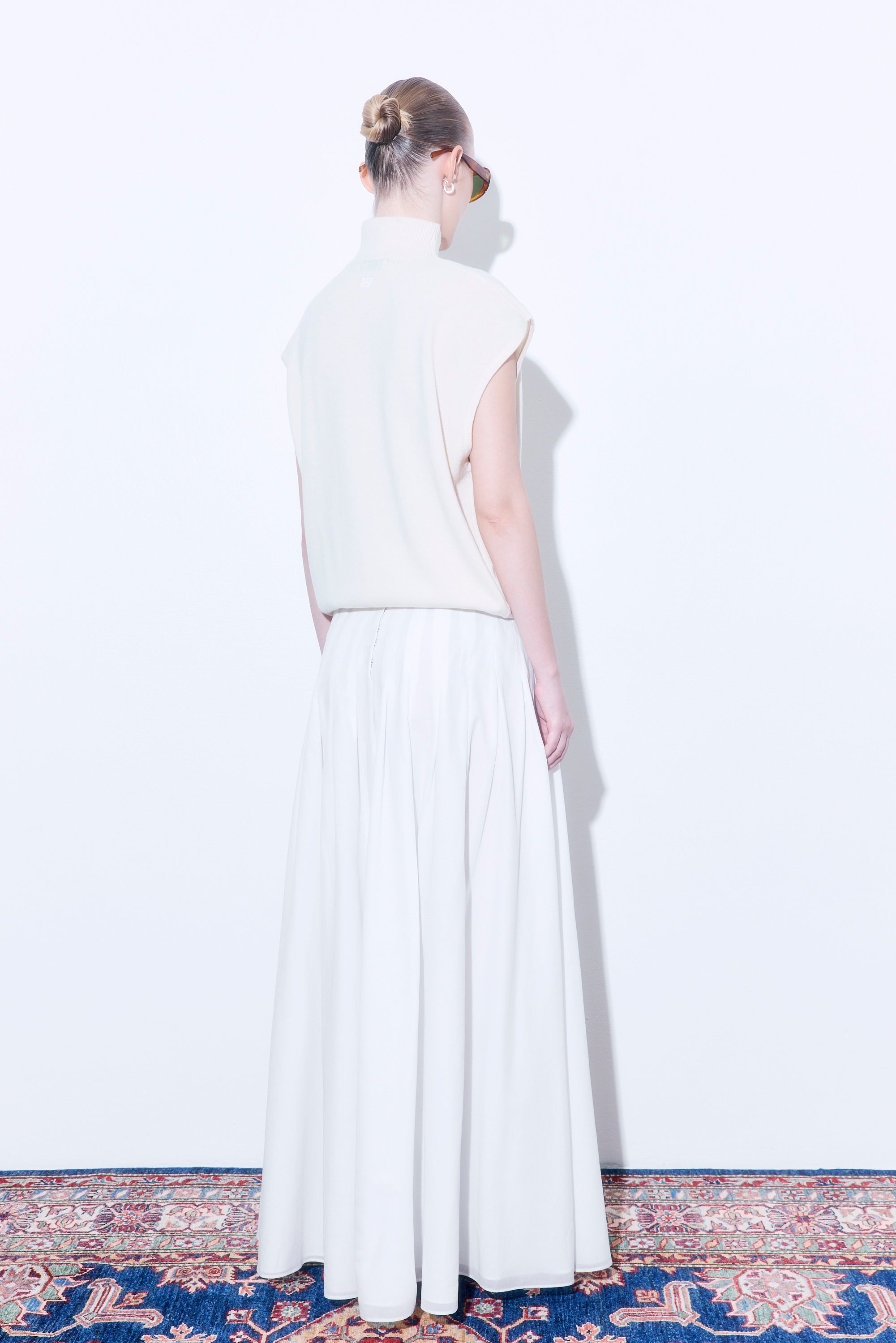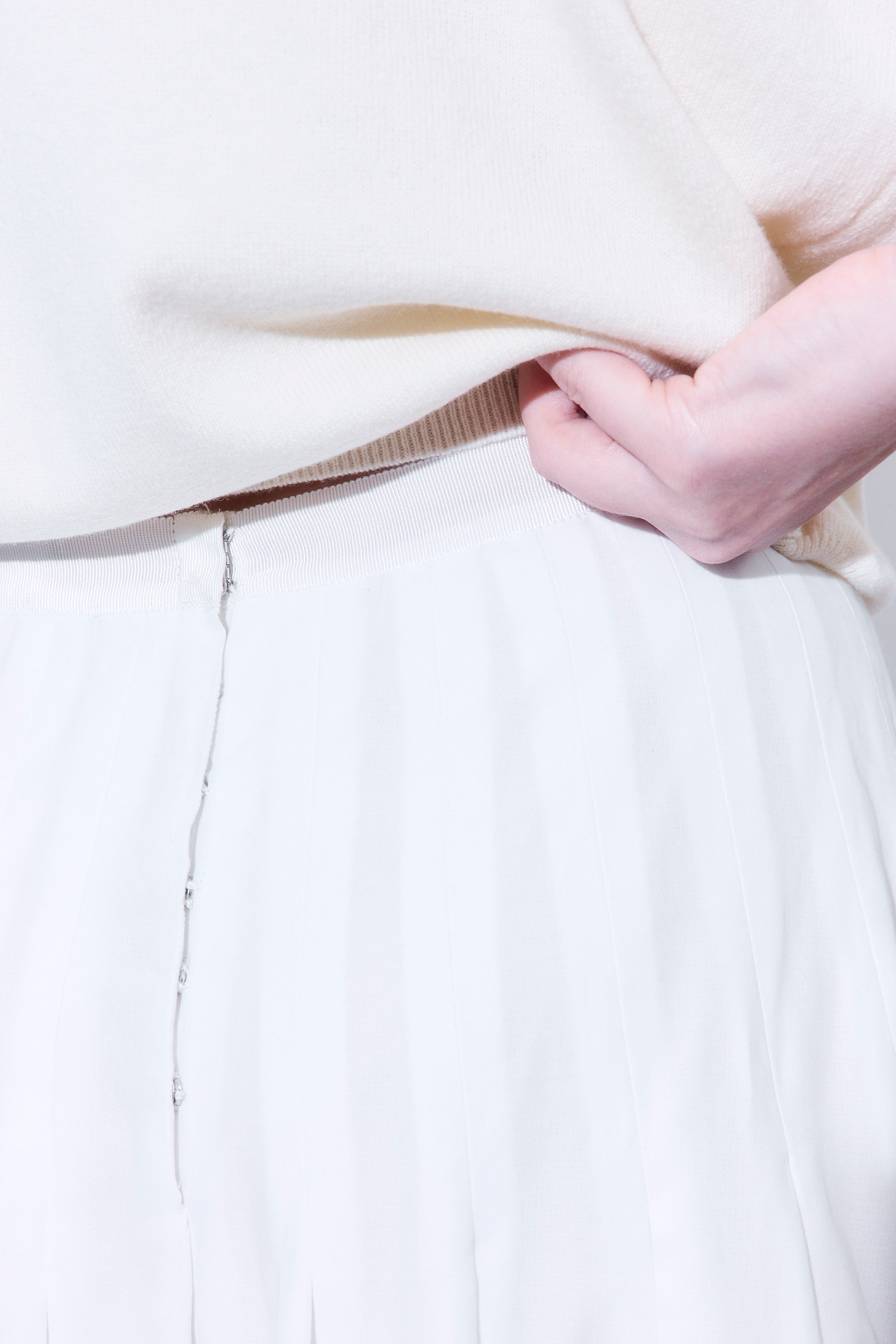 A modern take on a classic staple item. High-waist pleated skirt with a satin-finished belt and ribbon detial. Crafted in a rich, layered fabric for volume and dimension. Featuring two layers. Upper layer is sheer. Lined interior. Ankle length. Pleats are closed to the hip and open toward the hem. Secured with a hook and snap closure. Tonal embroidered logo at the side back. Style it with our iconic Oval sunglasses and timeless Sheer Baby Tee for an elegant look.