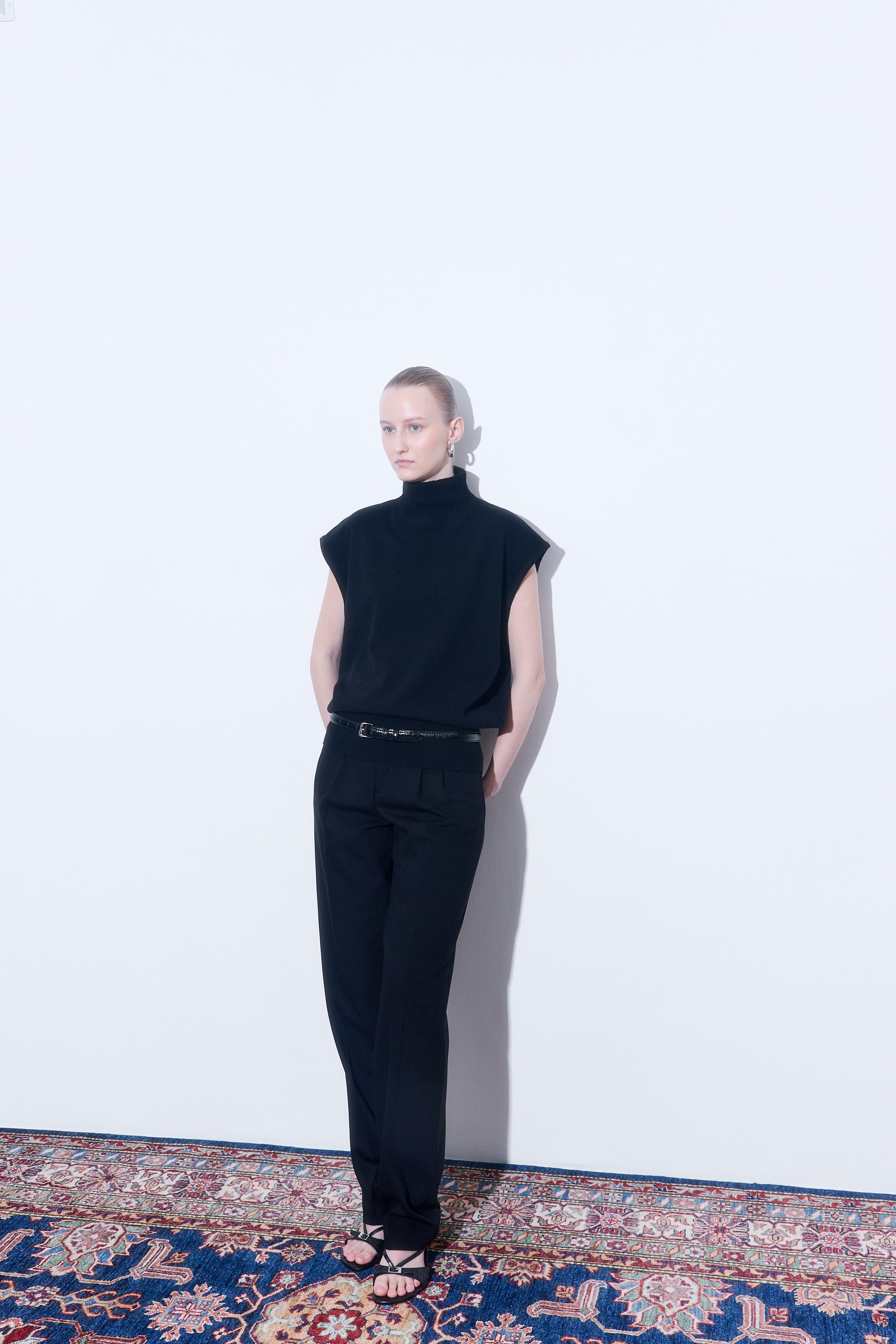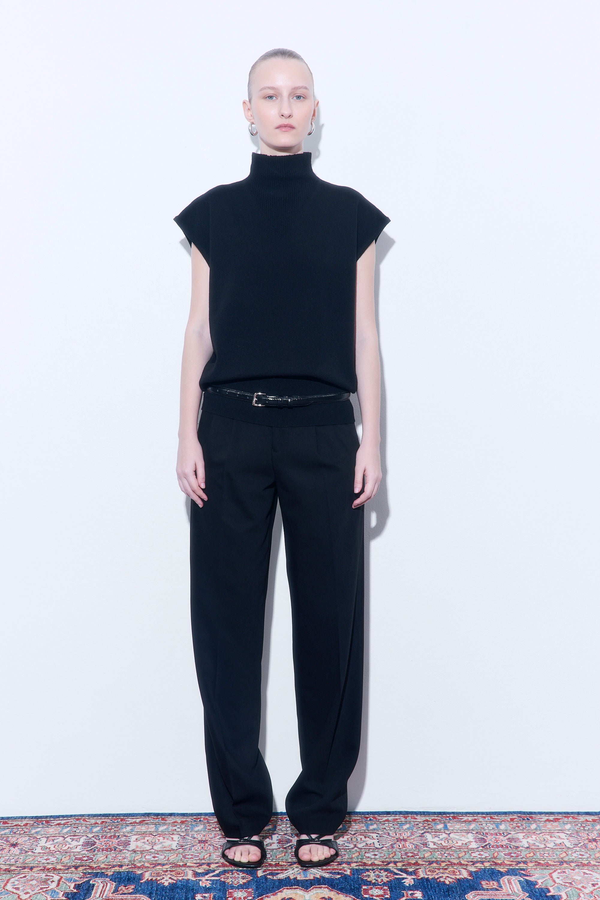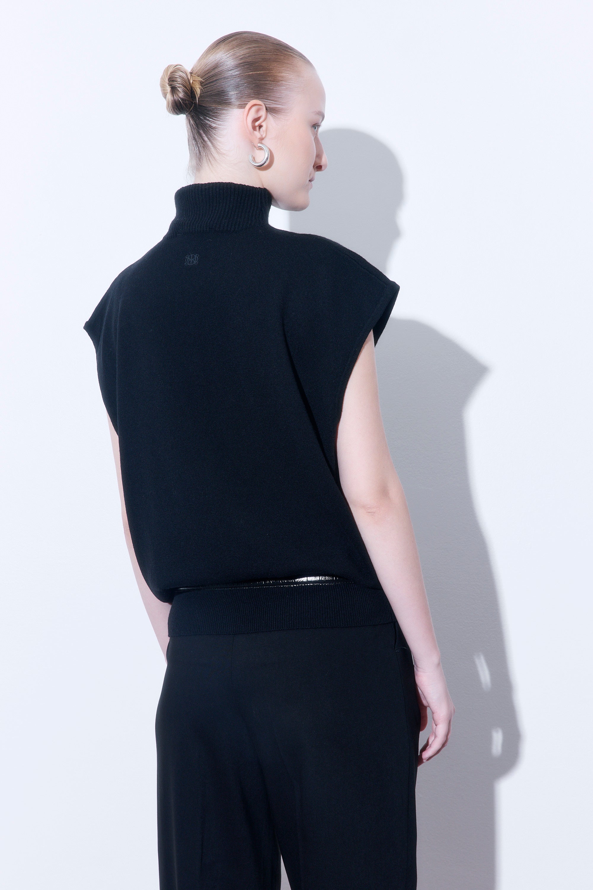 Your go-to piece for crisp mornings and effortlessly cozy evenings. Oversized, sleeveless golf with a wide-rib V-neck detail. Fully fashioned. Wide hem cuff creating a ballooned silhouette. Dropped shoulders. Finished with tonal embroidered logo at the center back. Style it with our timeless Pleated Maxi Skirt and iconic Oval Sunglasses for an elegant look.