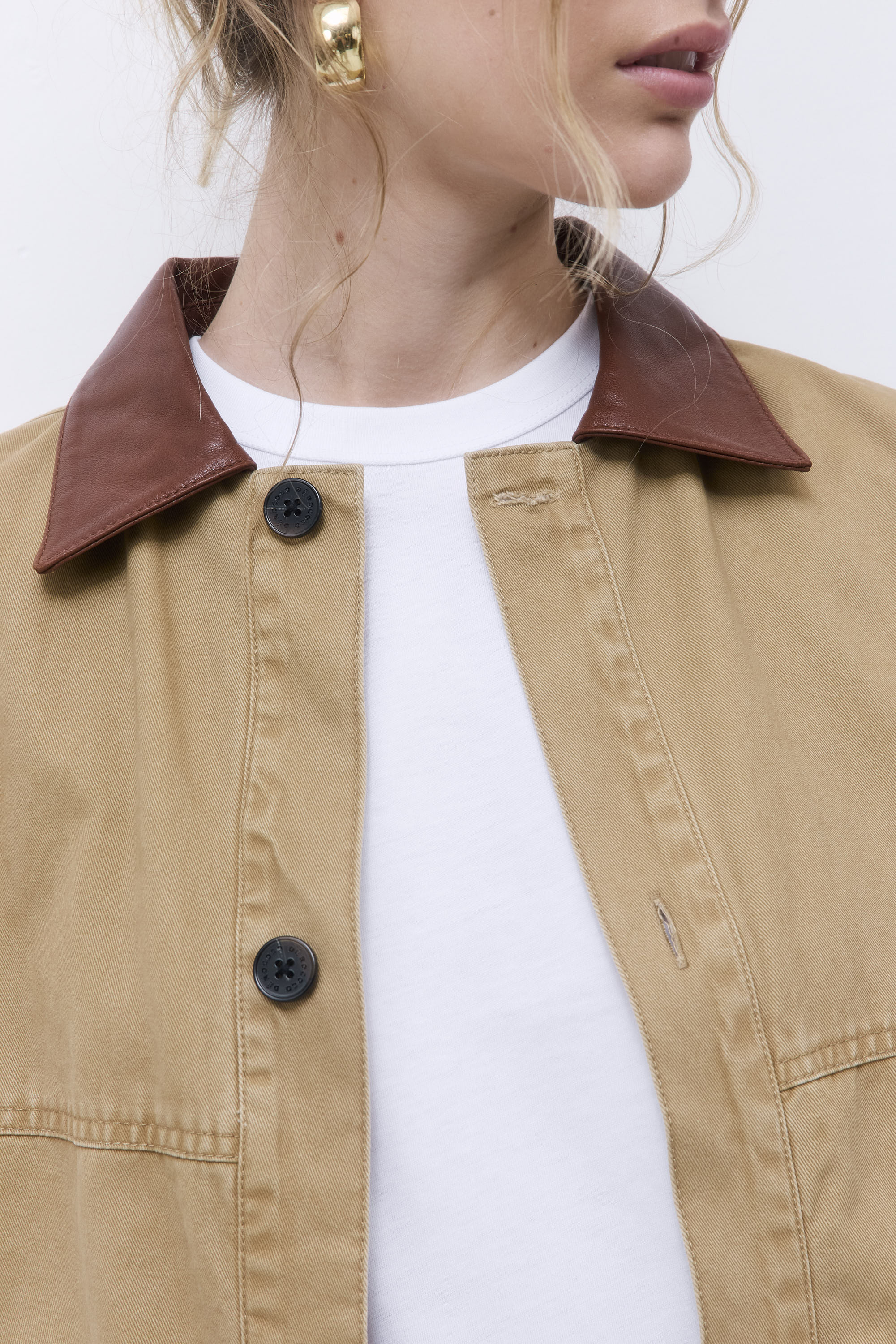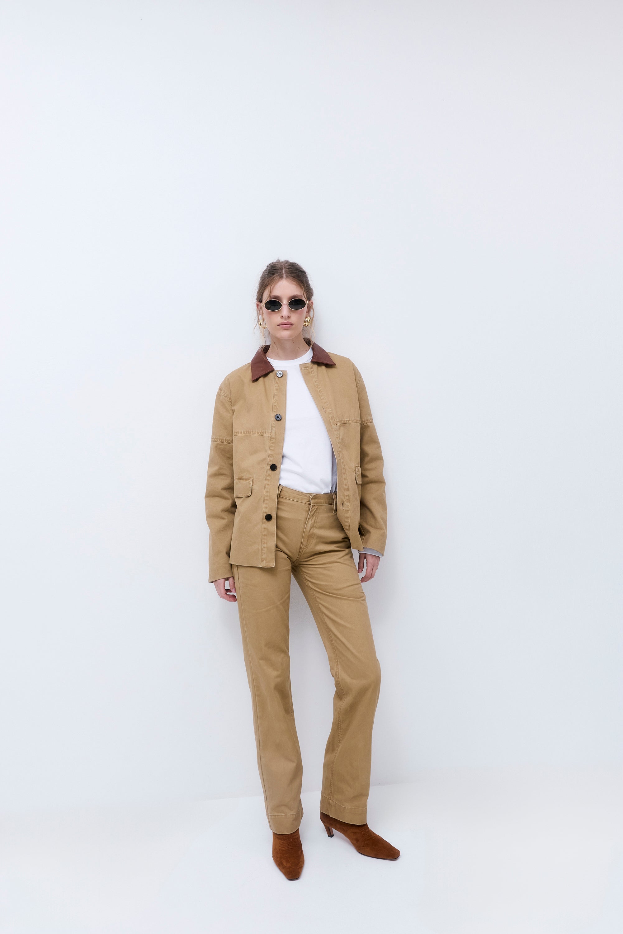 The kind of jacket that instantly pulls every look together. Oversized barn jacket with contrasting, burnt orange, genuine leather detailing at the collar and at the belt loops. Washed effect. Fully lined. Double flap welt pockets, and a back vent. Featuring double stitching along the sleeves and chest. Finished with contrasting, logo engraved buttons and embroidered logo on the pocket. Style it with our new, matching Barn