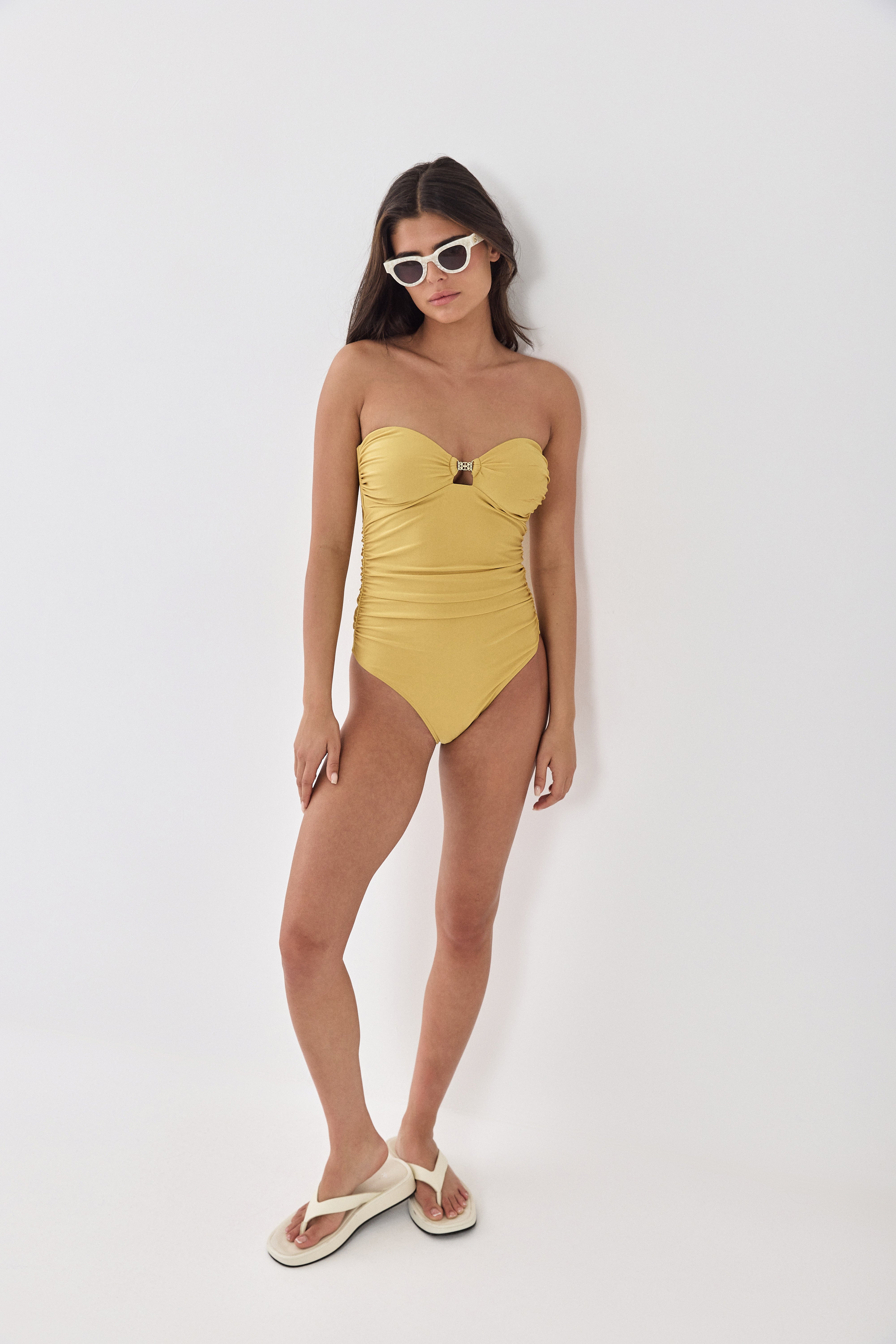 One of our chicest one pieces this collection. Strapless. Made from luxurious soft Italian fabric that is ultra flattering and body hugging. Gorgeous shiny fabric. Featuring a centered golden logo buckle detail. Double lined. Wiring at the sides for extra support. Gathering detailing along the side seams. Gathering detailing at the top center. Internal silicone band along the top part for extra grip and support. Seamless at the top. Mid rise leg opening. Style it with your favorite summer scarf, aviator sunnies and a pair of slides for the perfect summer look that will have you feeling like you're at the Italian Riveria.