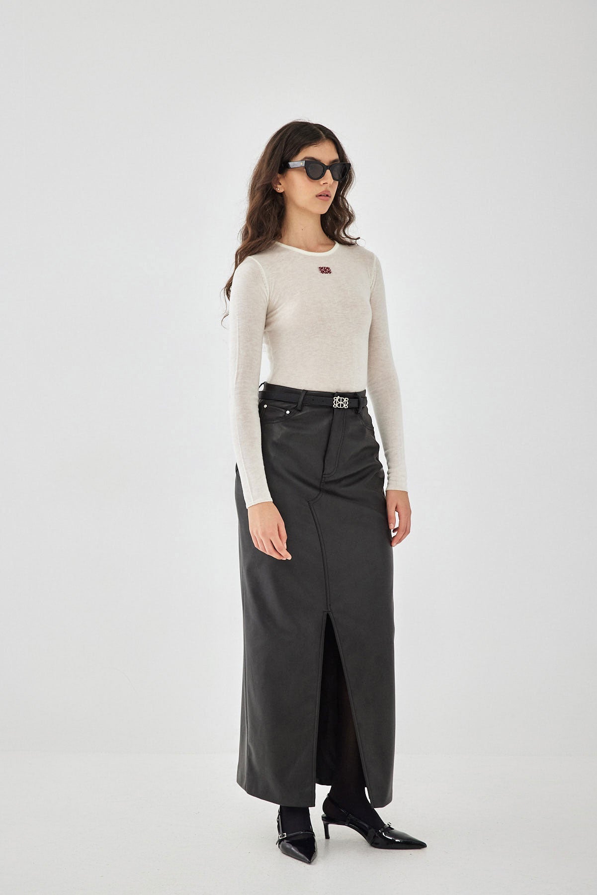 The ultimate layering essential, in a limited edition version. The perfect pop of red. A knitted long sleeved top featuring an intarsia logo detailing on the front. Lightweight breathable material. Style it with the vegan leather maxi skirt, our signature belt and a pair of kitten heels.