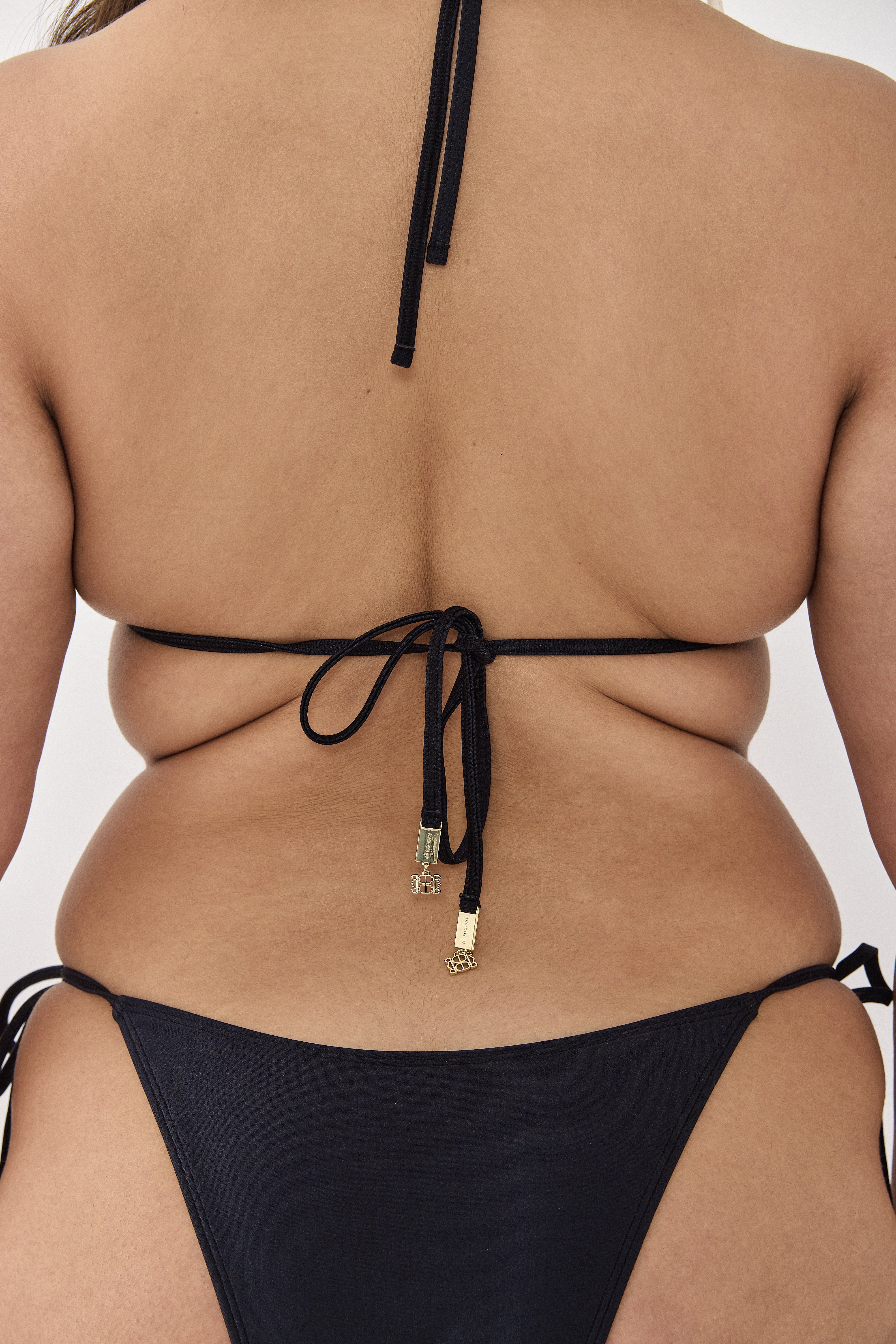 Mi manchi means I miss you in Italian. Classic and minimal triangle bikini top. The ultimate top for tanning. Made from luxurious soft Italian fabric that is ultra flattering and body hugging. Gorgeous shiny fabric. Features golden logo pendants on the ends of the bottom straps. Double lined. The triangles have slight gathering detailing. Lose straps, making the top highly versatile. Can be tied in an endless amount of ways. Style it with your favorite bikini bottom, our crochet maxi skirt and your favorite slides for the most stylish poolside look.