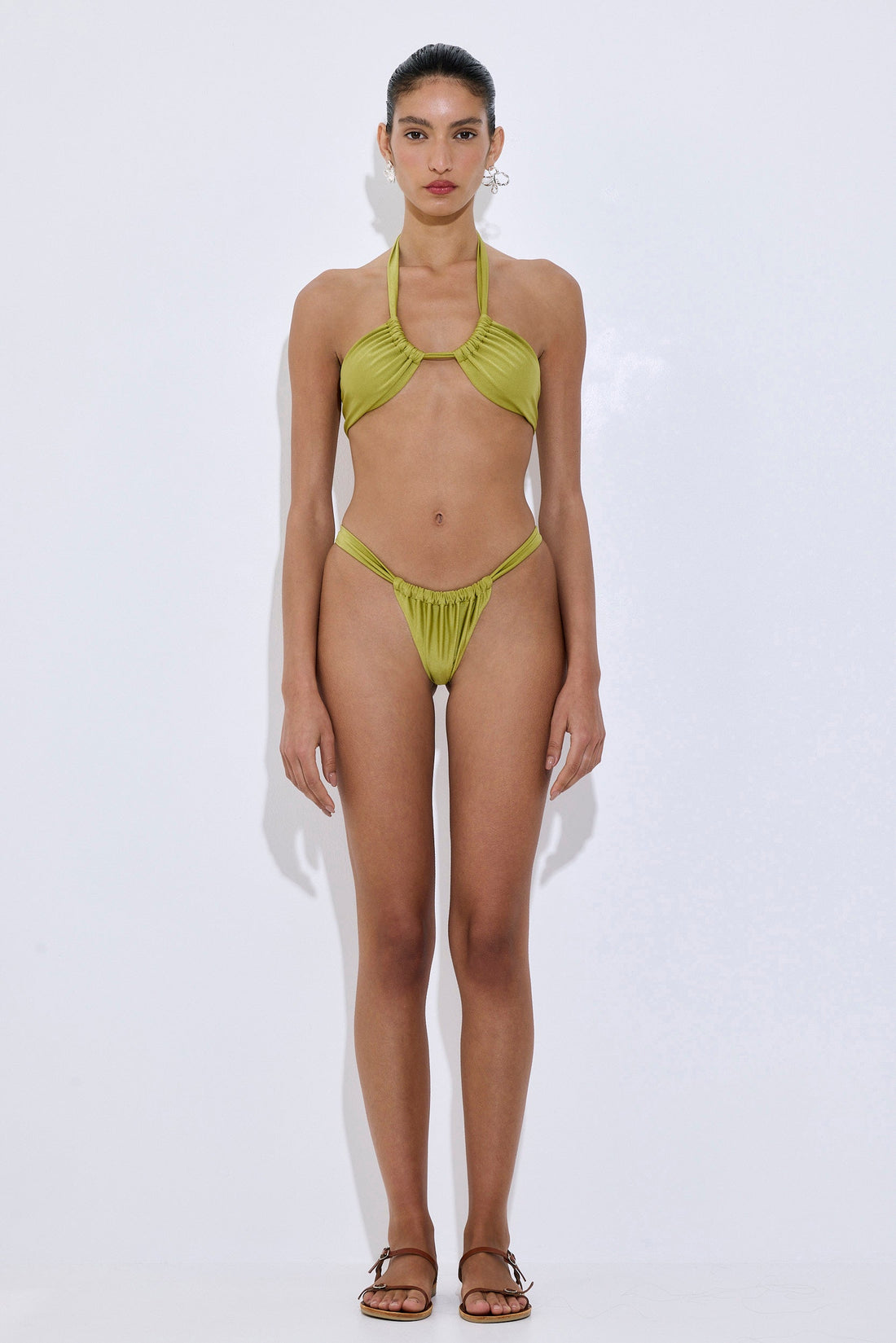 Melenia, named after the alluring water nymph, is designed for both elegance and support. Made from luxurious shiny Italian fabric that flatters your curves and hugs your body for a sleek, sculpting fit. Wide triangle silhouette with a fixed neck strap for added support. Features a wide tie closure at the back for a secure, adjustable fit. Preparation for cups insert (no cups included) Silver logo detailing at the nape. Double lined for extra support and non sheer look. Can be worn in a multiple ways, as desired. Style it with our beautiful Pareia bottom, our cool scrunchie and our must have shirred mini skirt for the hottest pool side look.