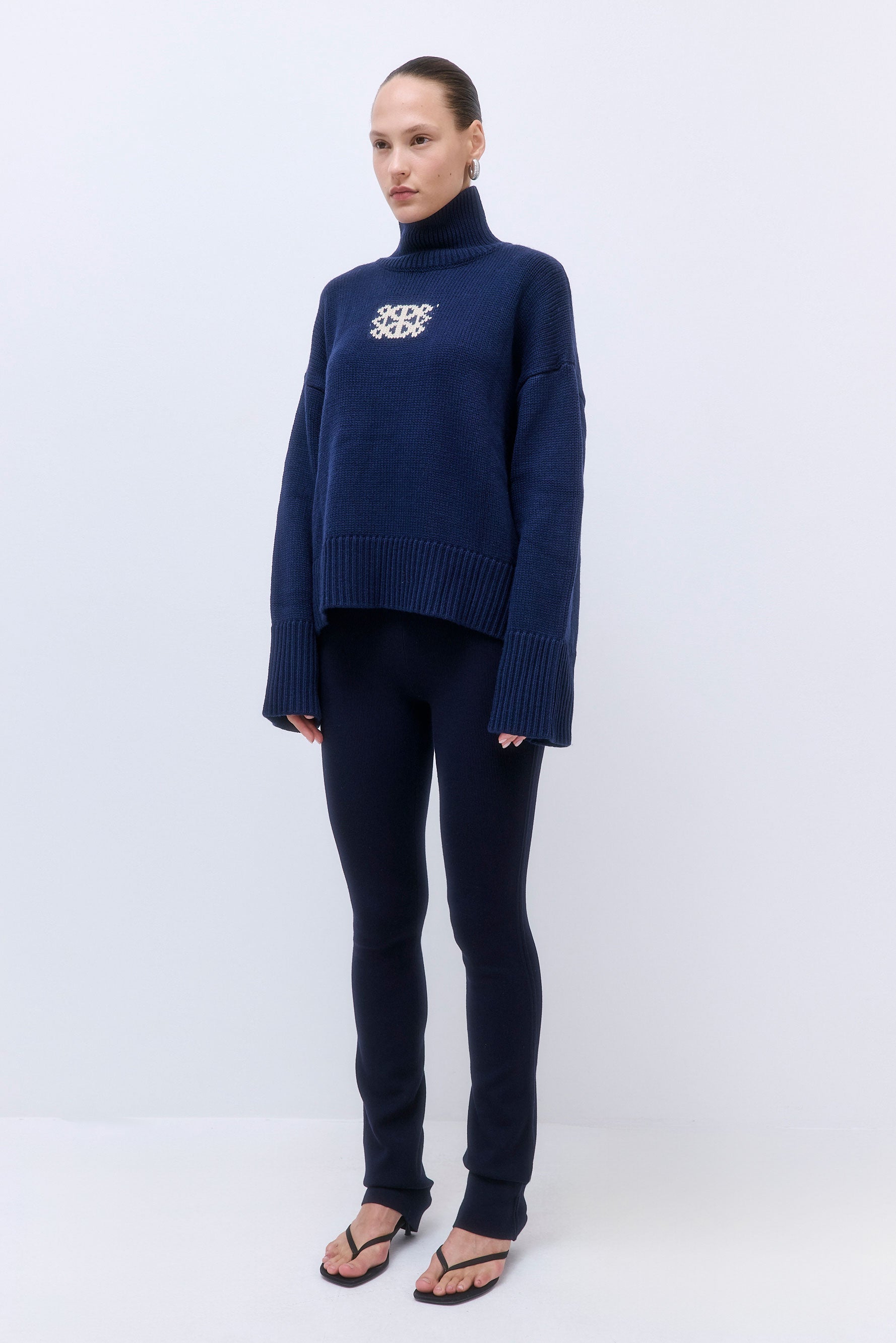 Bringing back a timeless De Rococo classic. Made from a super soft thick knitted fabric. Features long sleeves and ribbed cuffs. Dropped shoulder sleeves. Knitted intarsia logo on the center front. Ribbed Finish. Style it with our with our chic Sheer Midi Skirt and pair these with our iconic Yvon Shoulder Bag for a beautiful fall look.