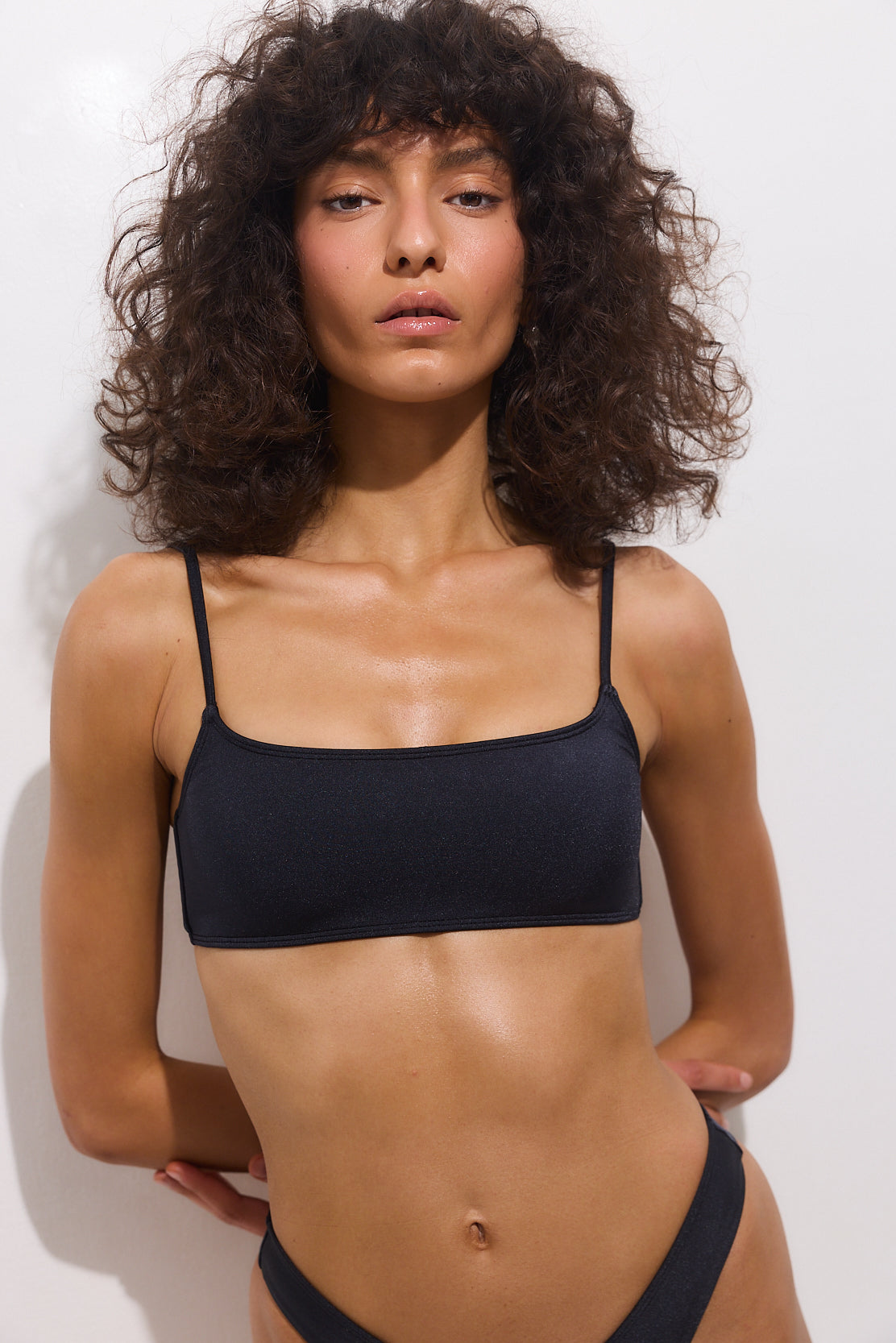 Re-introducing our best-selling swim icons from over the years in a new dreamy shade. An iconic silhouette returns; this timeless bikini top is designed for effortless style and all-day comfort, a sporty-chic silhouette. Made from luxurious shiny Italian fabric that flatters and supports your shape with a sleek, second-skin fit. Round cleavage with side bones for extra support. Lined bikini top with thin adjustable straps. Clasp closure at the back with a delicate silver logo engraving detailing. Preparation for cup inserts (no cups provided). Style it with our iconic Dolce Bottoms, Signature Paisley Scarf and our effortless Linen Pants for a seamless blend of comfort and style.