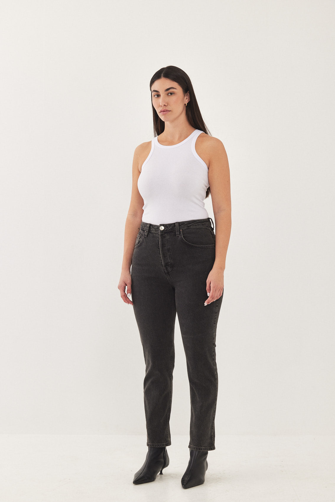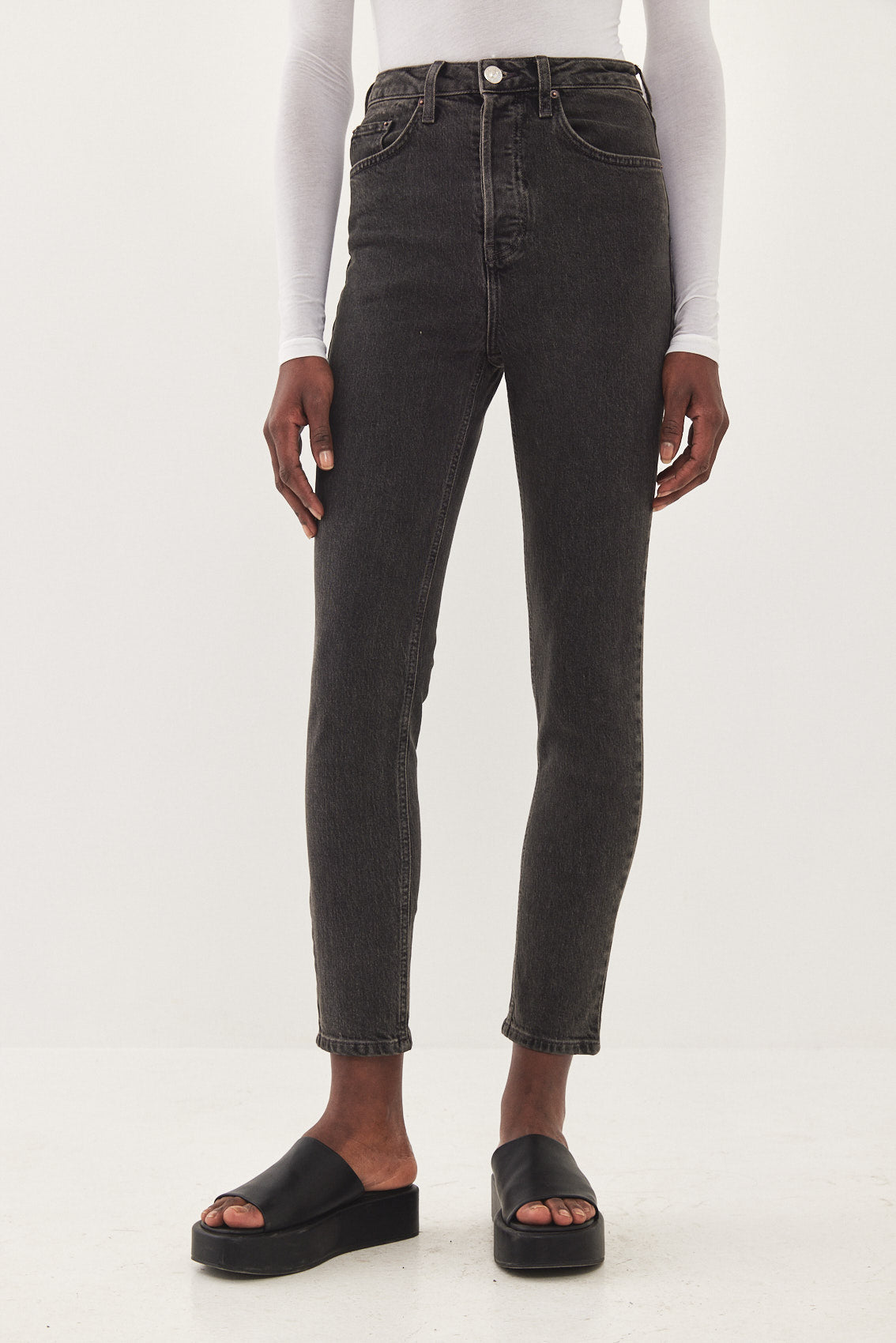 No.4 high waisted jeans features a slim cropped fit. Front buttoned closure and back embroidered logo detail at pocket. Made from soft cotton with a little stretch, built to contour curves. Wear yours with anything from T shirts to chunky knits.
