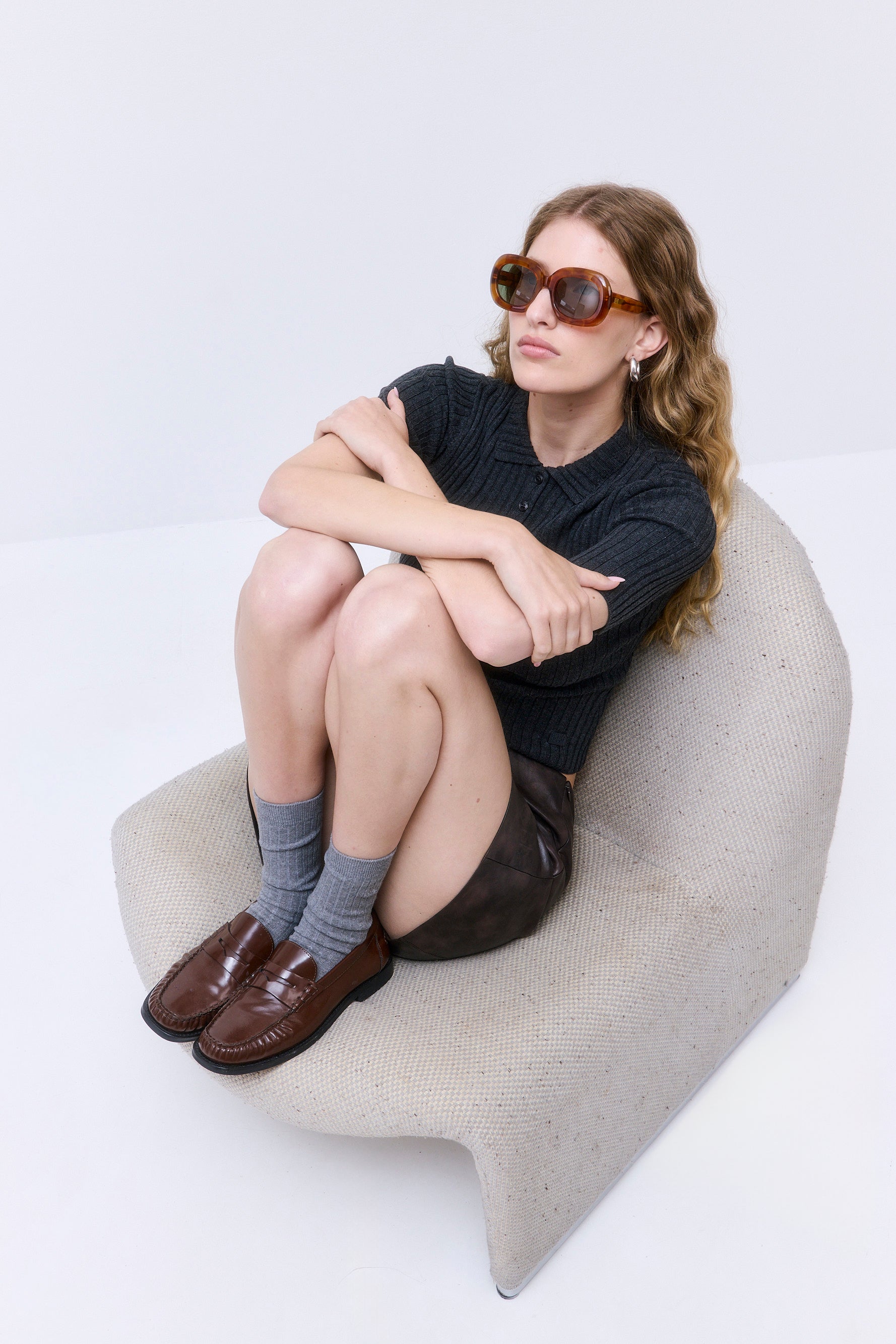 The ultimate fall essential, designed for effortless wear. Polo collar. Mid length sleeves. Featuring 3 tonal buttons. Ribbed fabric. Fitted. Fully fashioned. Clean finishes. Detailed with a tonal silicon logo on the front side. Style it with our iconic Tapered Leg Daddy Pants and sleek Rodika tote bag for a refined, modern look.