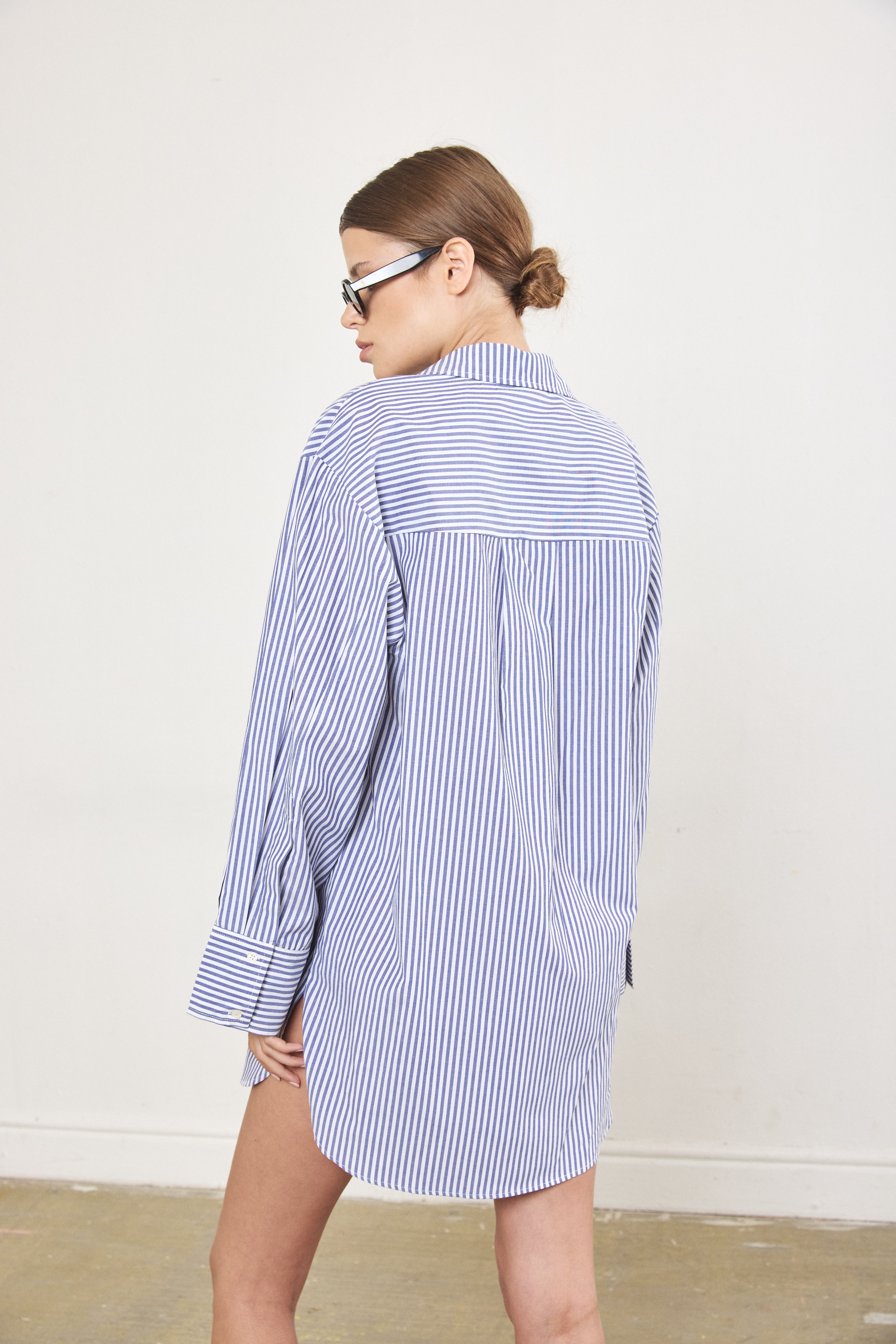 Long sleeve mini dress with front buttoned closure. Oversize fit with buttoned wide cuffs and a lapel collar. Style yours with chunky slides or strappy heels.