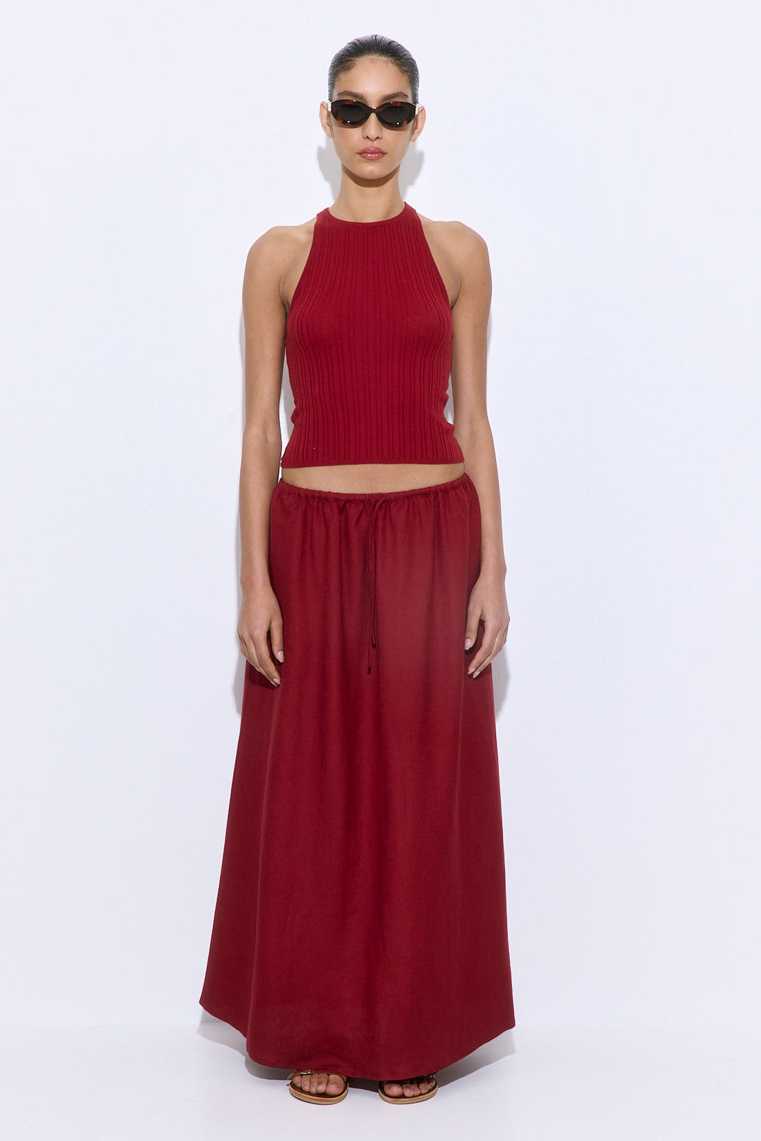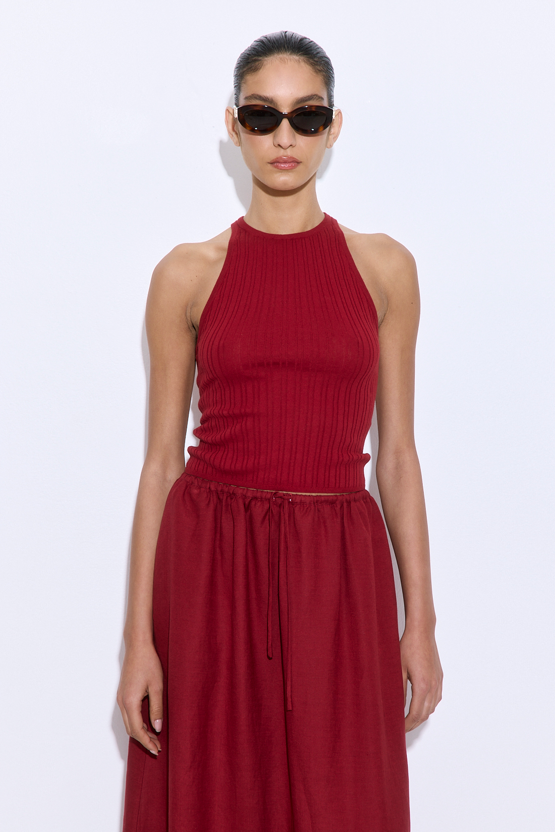 Your go to summer essential. Lightweight and breathable ribbed fabric. Delicate crew neck. ribbed finish. Features a tonal silicone squared logo patch at the upper back. Gently skims the body for a flattering, easy fit. Style it with our new linen mid rise pants, a matching scrunchie and our round sunglasses for an everyday beautiful look.