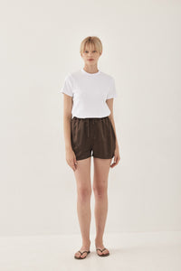 High waisted relaxed satin shorts. Features a delicate drawstring and two side pockets. Made from breathable material. Cut in a special bias cut technique so that the materials falls smoothly and moves with your body. Style it with the matching satin top for the perfectly chic everyday look.