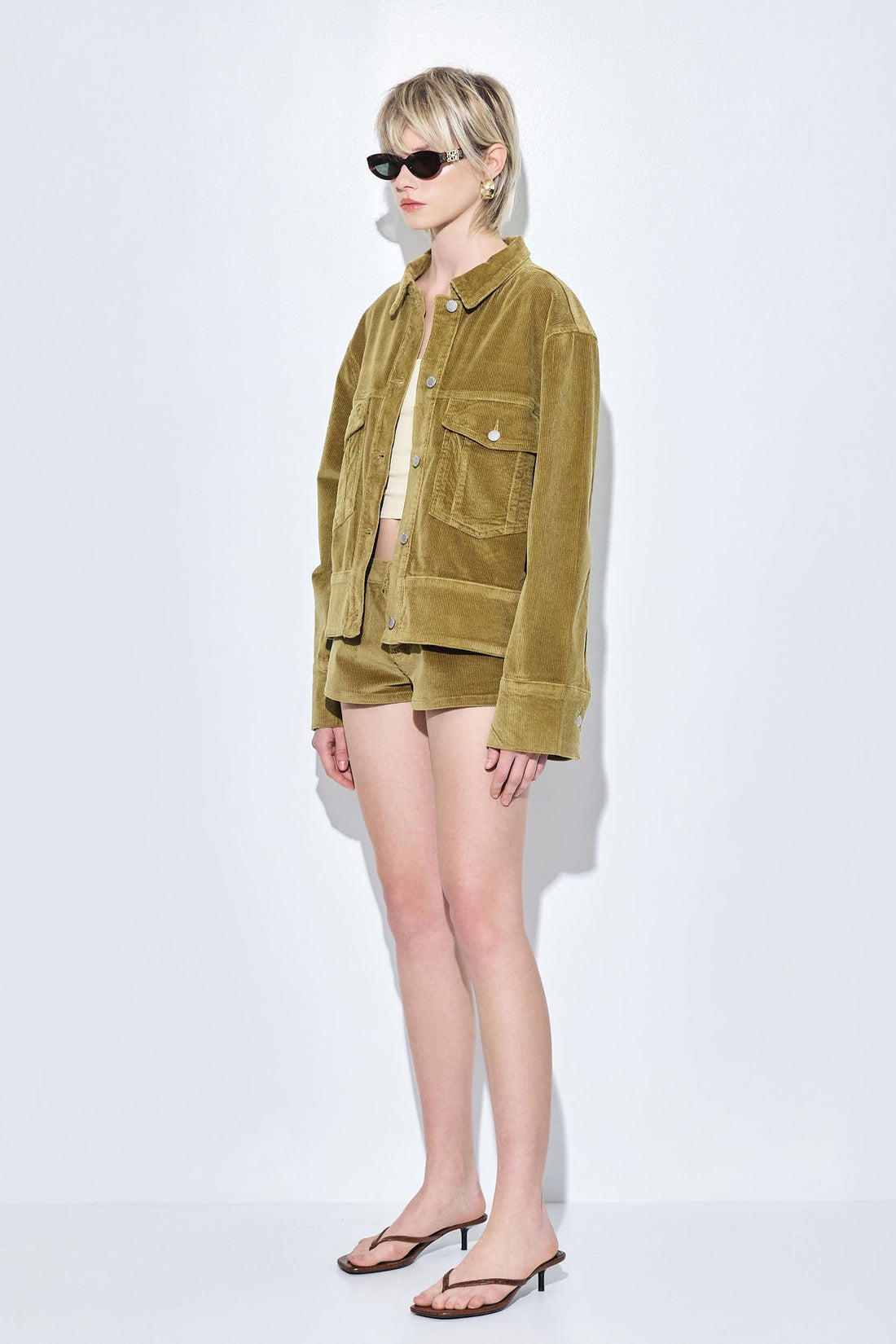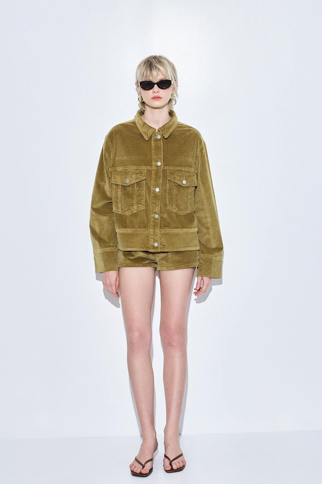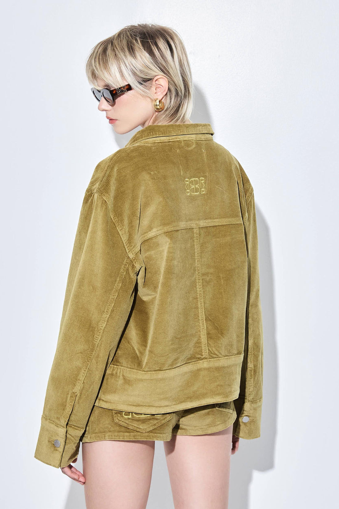 Our new corduroy jackets is a true must have this season. Engraved logo snapped buttoned closure. Two front patch pockets. Unlined. Classic lapel collar. Elegant wide finish. Snapped buttoned cuff closure. Tonal embroidered logo on the back. Oversized fit. Slightly stretchy. Style it with our matching micro mini corduroy mini shorts, a classic baby tee and a pair of our classy oval sunnies for a cool everyday look.