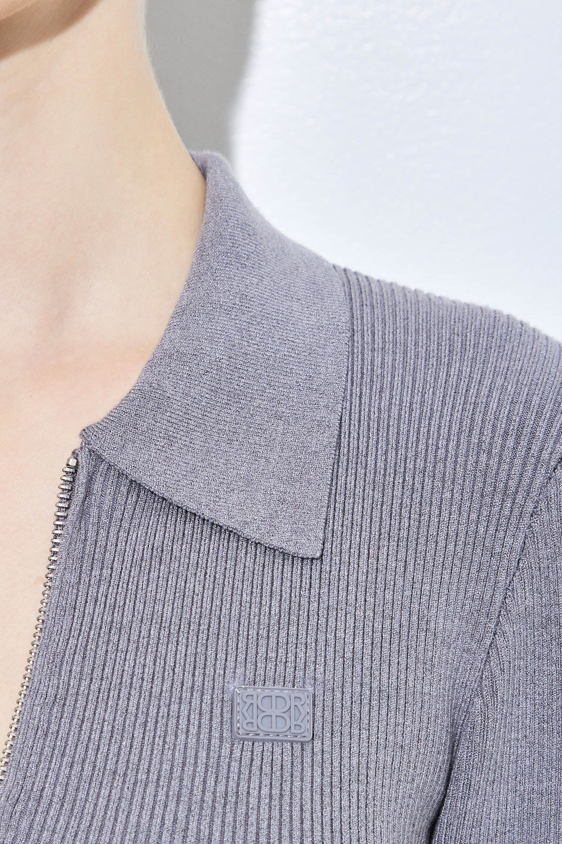 Our new double zipper cardigan is the chicest piece you'll own this season. Soft and stretchy ribbed fabric. Tonal silicone embossed logo patch on the front. Double zipper metal engraved logo closure. Delicate lapel collar. Style it with our matching flare leggings, our double wool blazer and our lettuce hem socks for a chic day to night look.