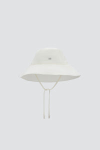Tonal stitching detailing. Logo press detail. Two strings to tie the hat with a silver eglet finishing with a delicate logo. Double lined. The perfect summer accessory to protect our skin from the sun without compromising style. The ultimate hat to complete any summer look.