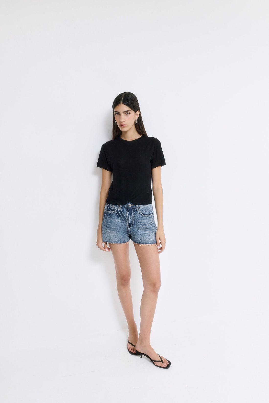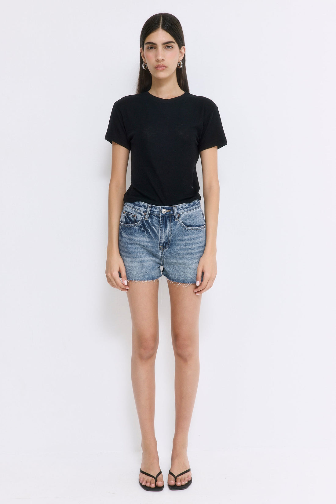 Our new mid rise denim shorts is your new go-to summer piece. Mid rise. A classic zipper closure. Raw Finish. Delicate belt loops. Luxurious logo leather patch detaling on the back. Contrasted embroidered logo featuring on the back pocket. Two front pockets and back pockets. Style it with our shirred top, wide buckle belt and our leather Rodika for the perfect everyday look.