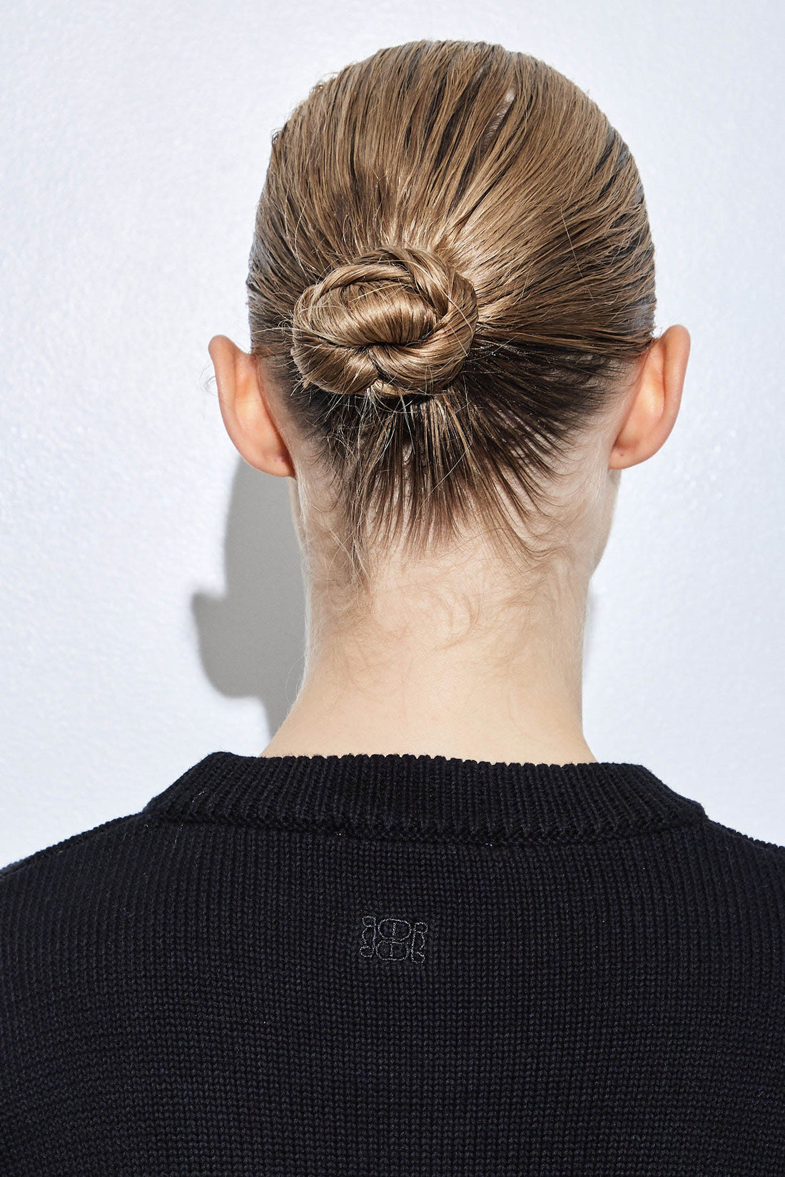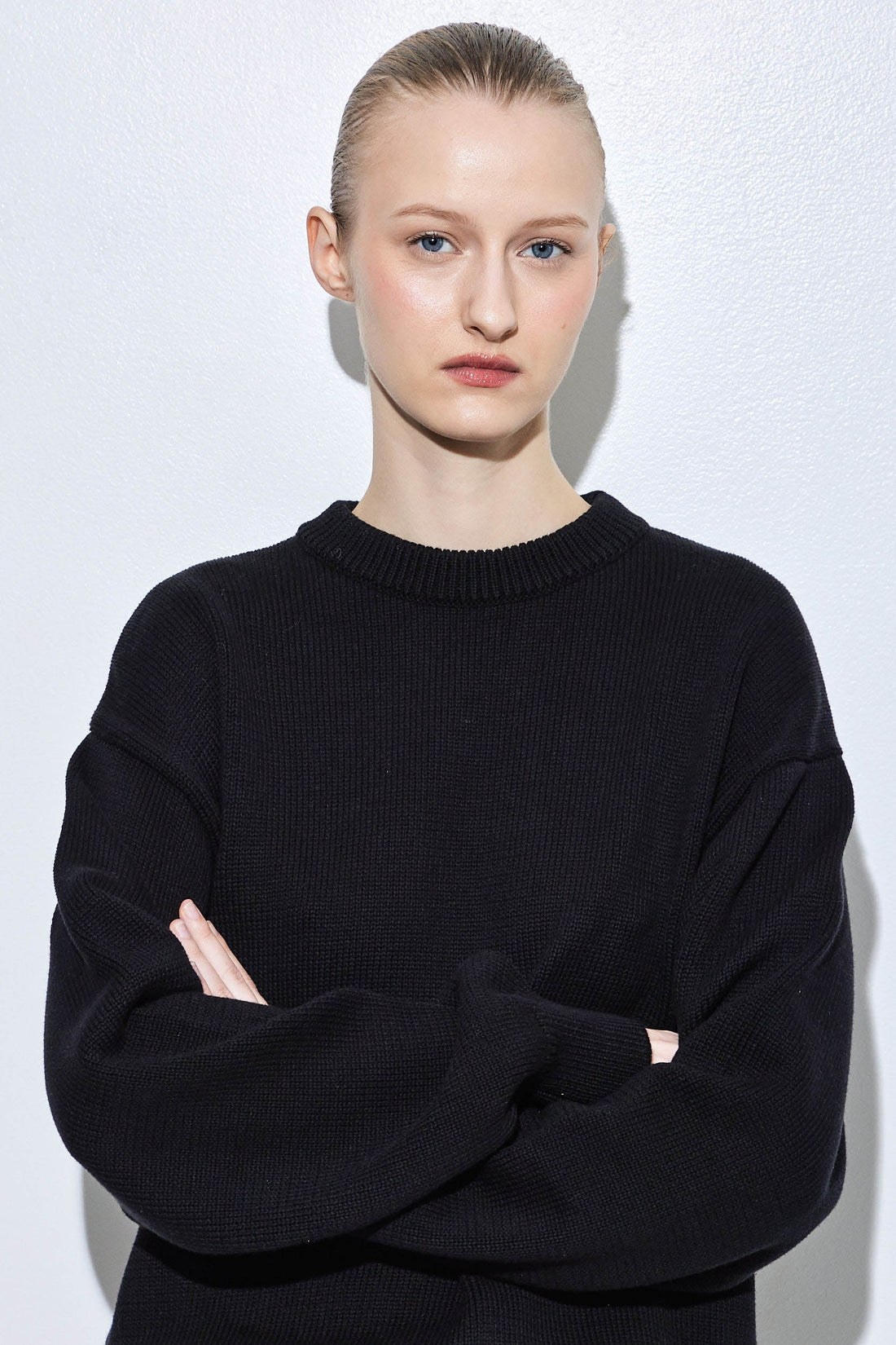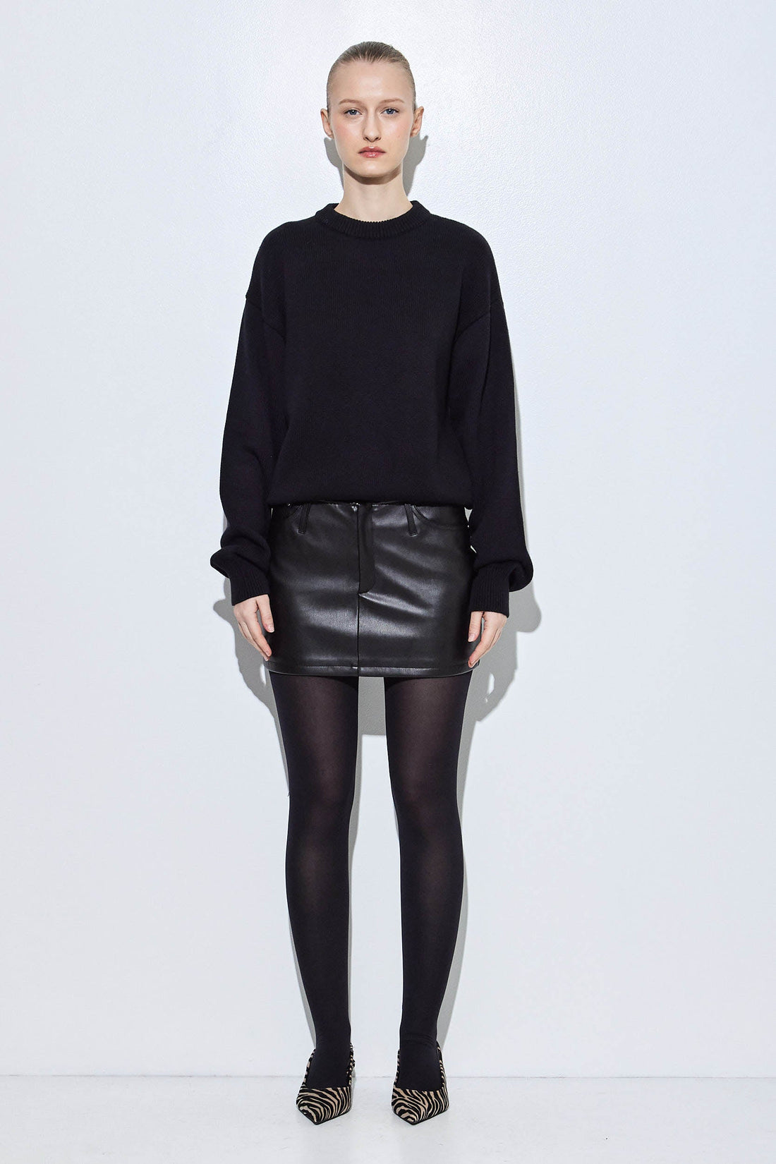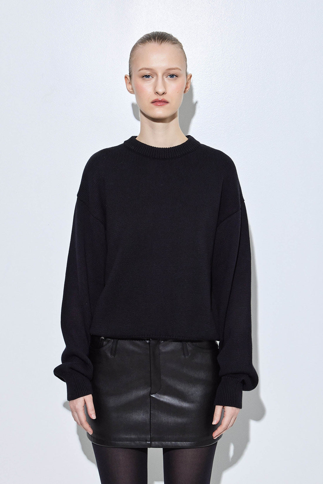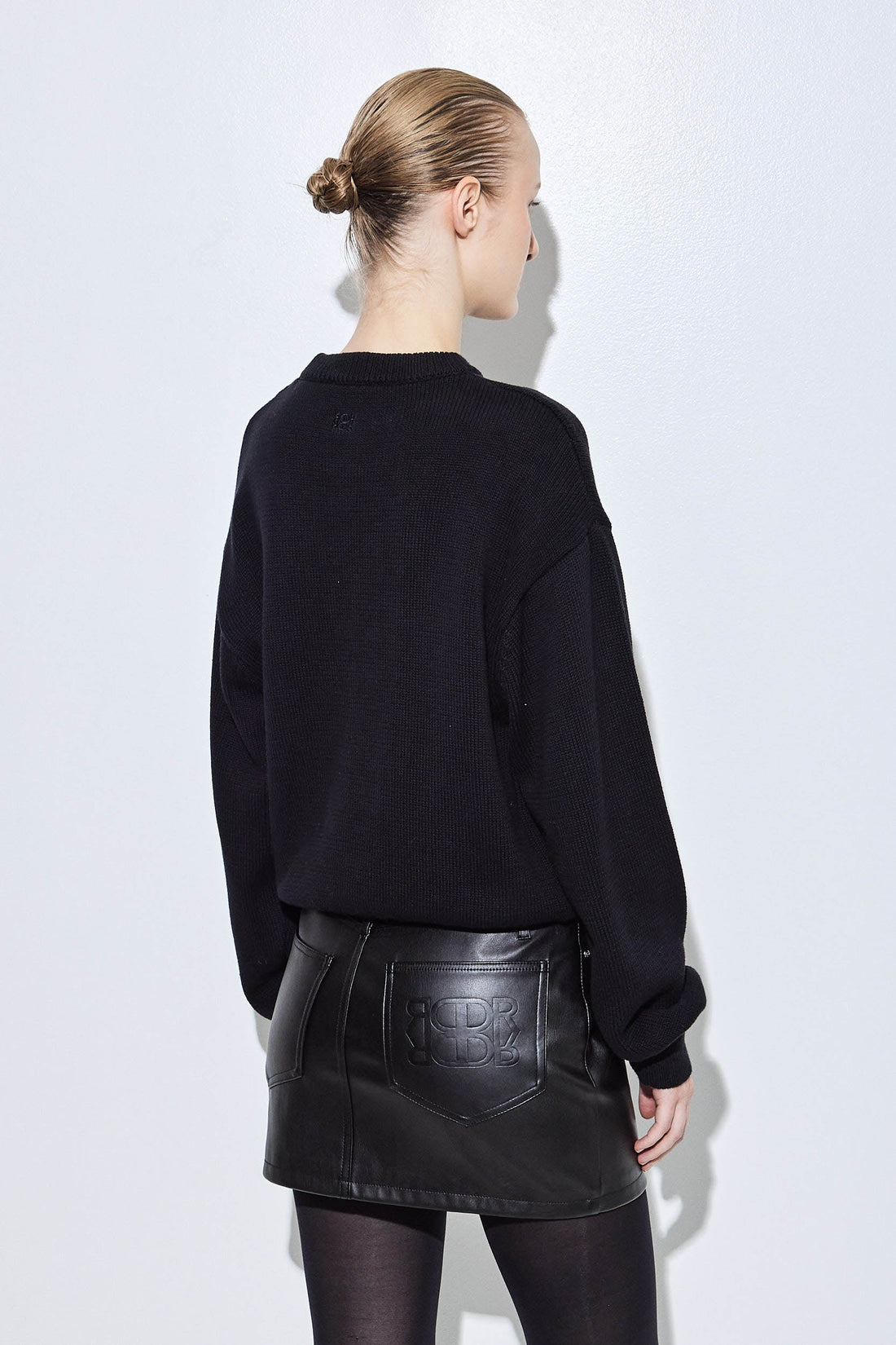 Our new cotton crew neck sweater is the ultimate way to layer this season. Ribbed finish. Crew neck line. Relaxed silhouette. Tonal embroidered logo on the back. Style it with our vegan leather mini skirt, our croco belt and our double wool blazer for a cool day to night look.