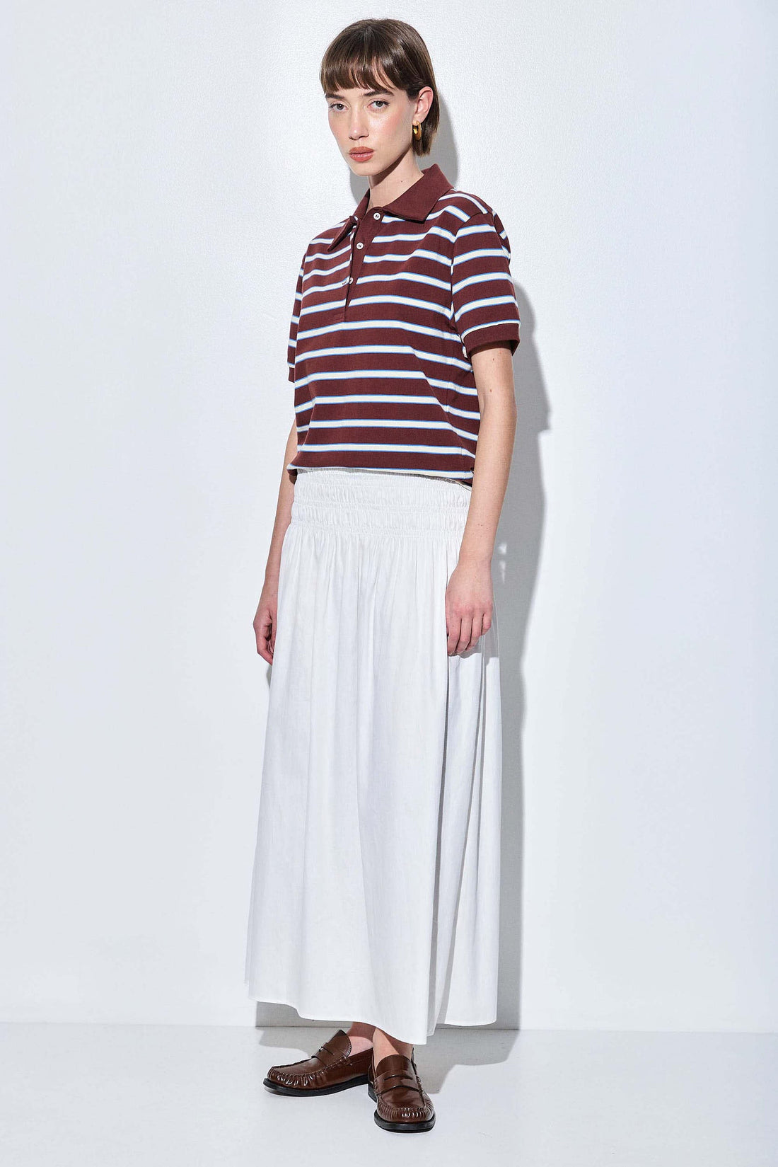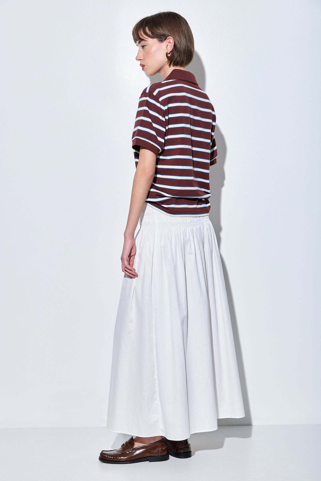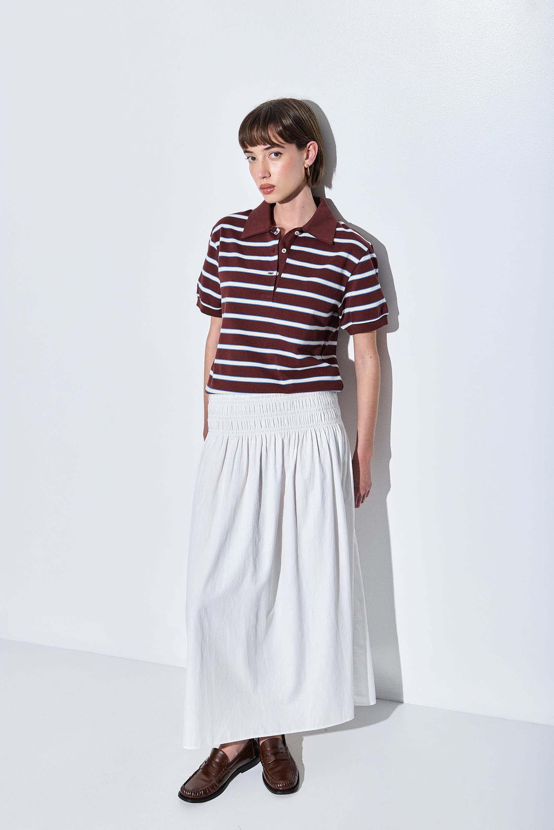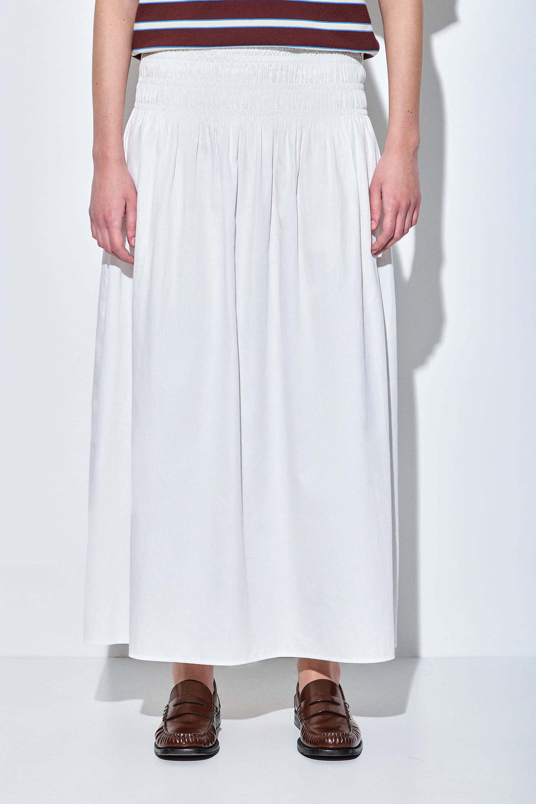 Our new shirred waist maxi skirt is the perfect blend of comfort and elegance. Designed with a soft, voluminous silhouette for effortless movement. Made from lightweight, breathable cotton for an airy feel. Featuring a wide, elasticated smocked waistband for a secure and flexible fit. PAir it with our new buckled tank top and a pair of our oval sunnies for a cool and effortless look.