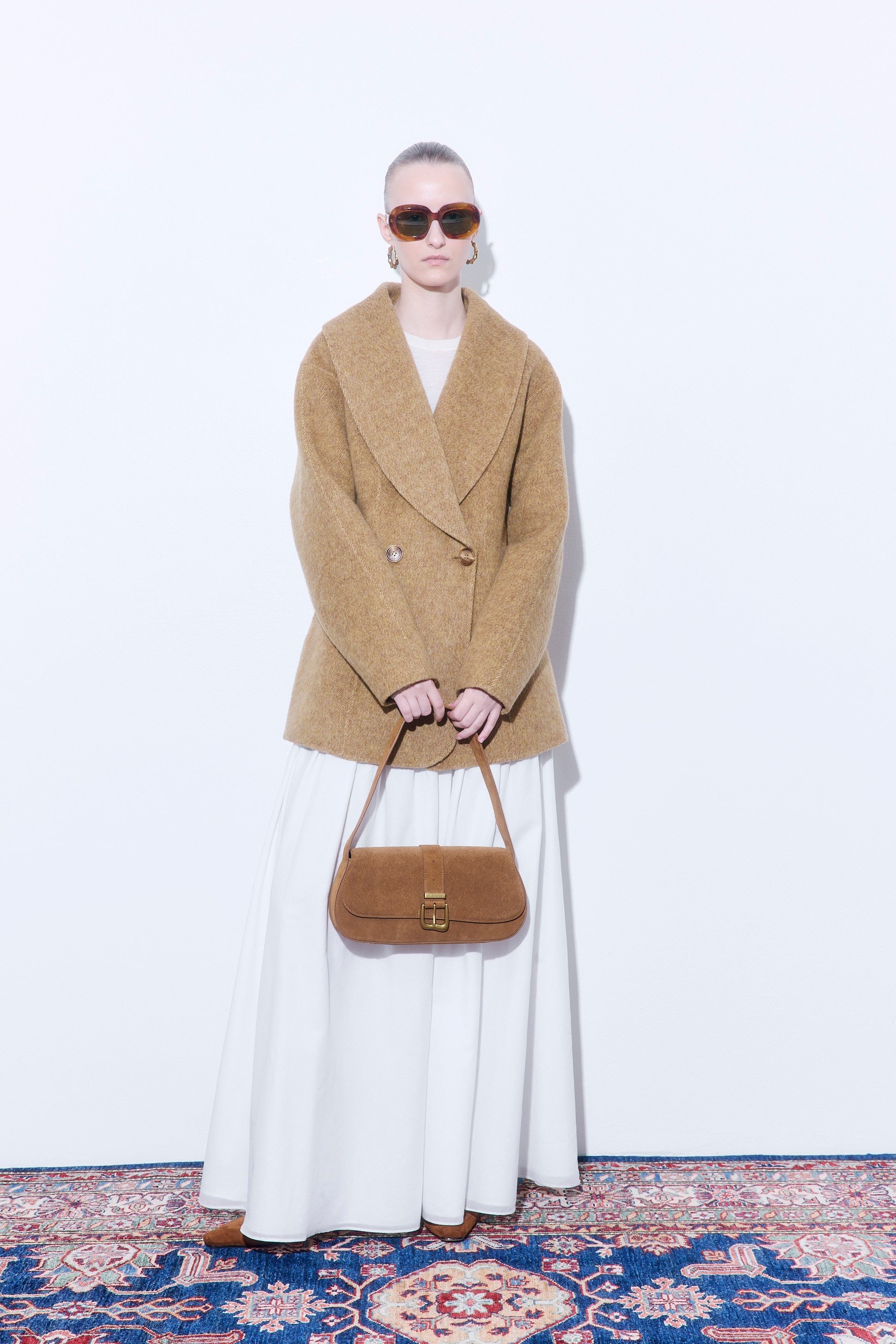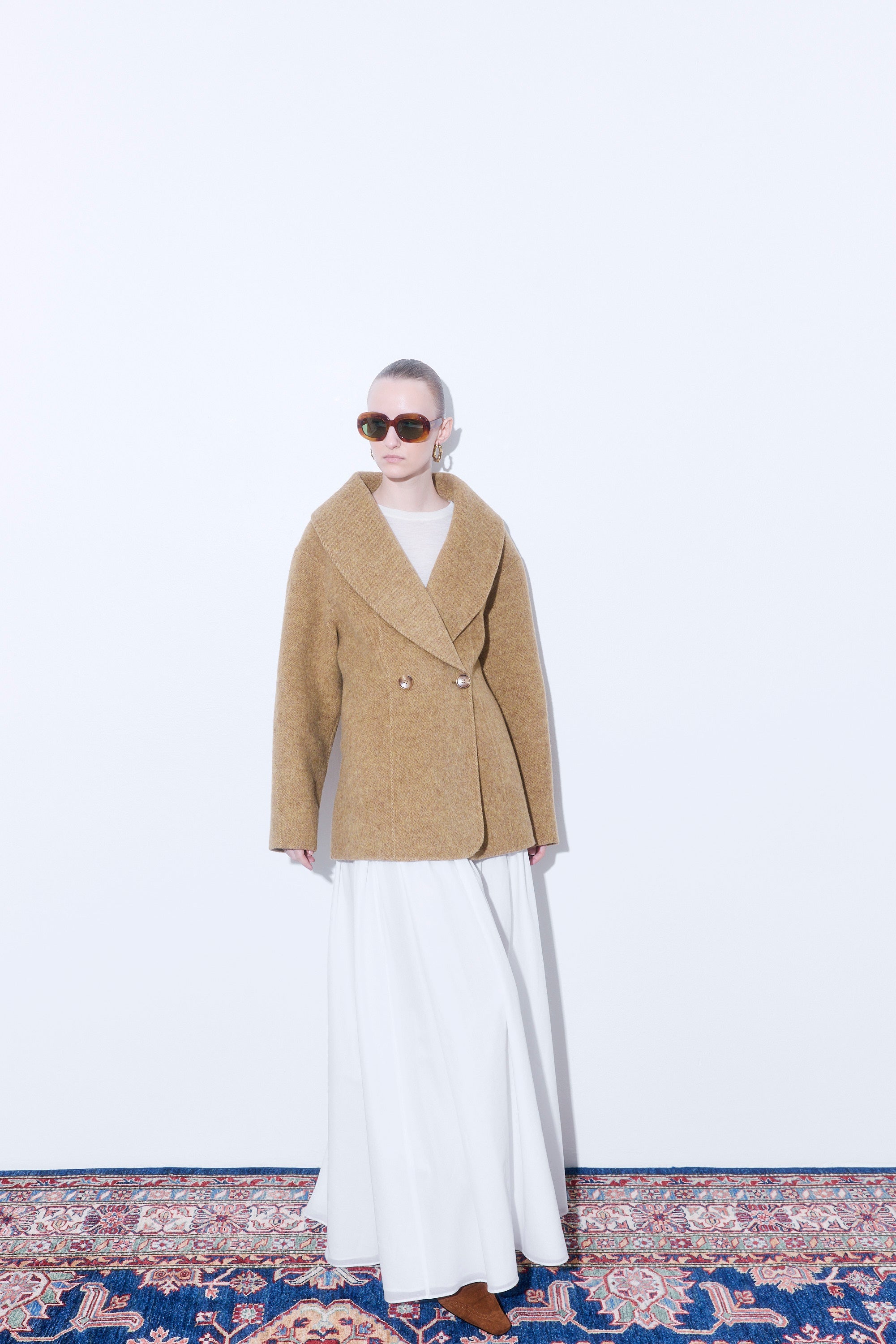 A standout staple designed to elevate every look. Mid-length, double-breasted jacket in a double-faced wool blend, offering a soft yet structured hand feel. Clean, unlined finish with an hourglass silhouette. Showcasing a shawl neckline with tonal engraved buttons, crafted to fall elegantly over the hips. Style with our timeless No. 18 Denim and iconic Rodika Tote Bag for an effortlessly refined look.